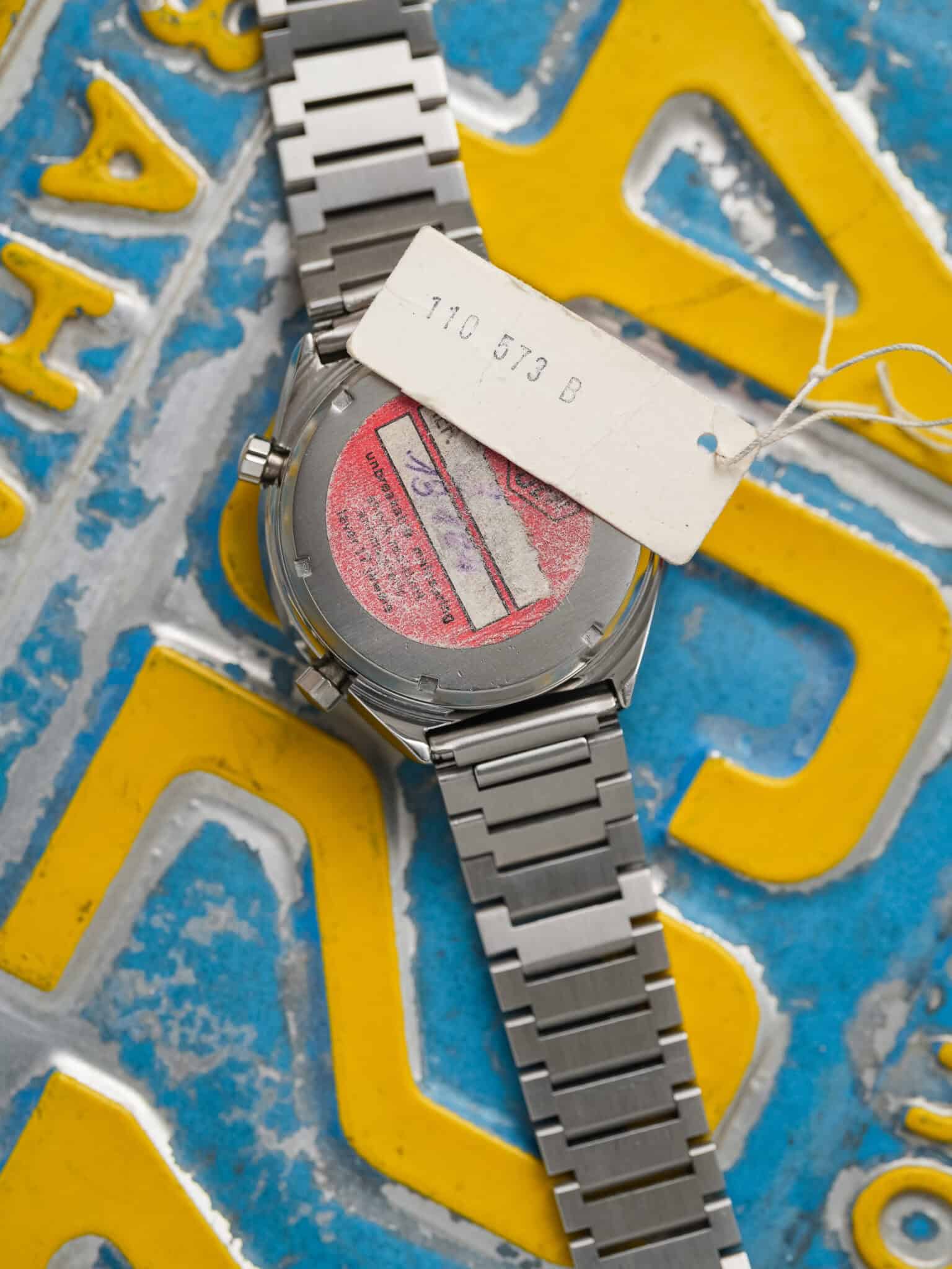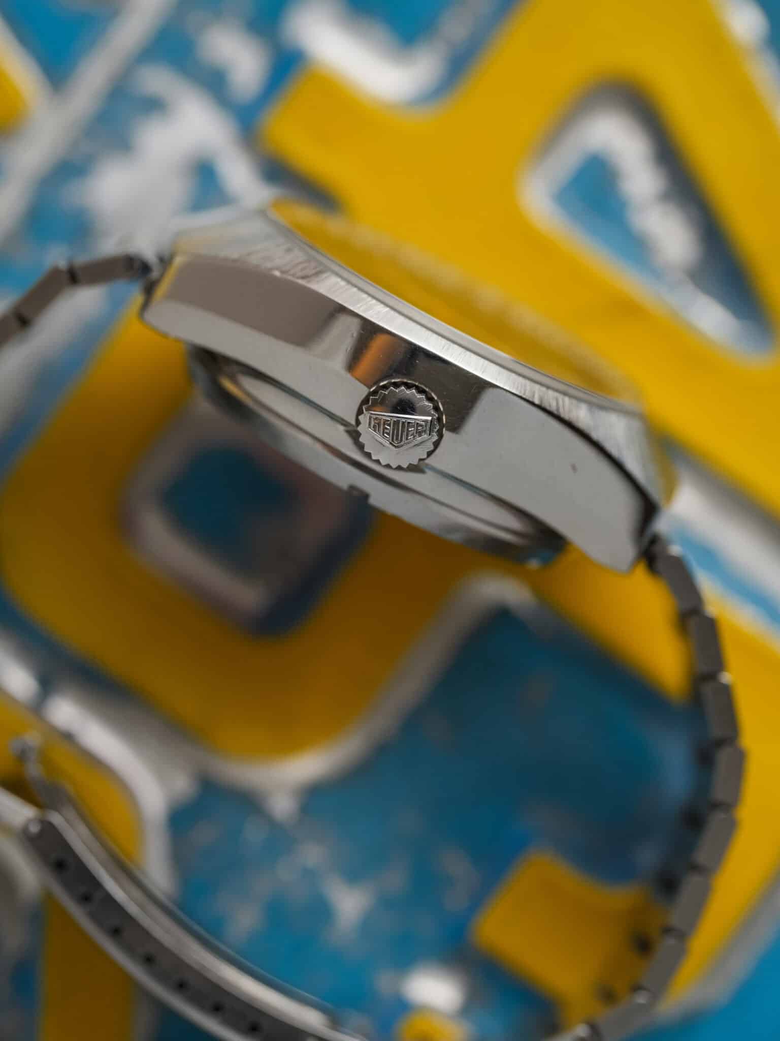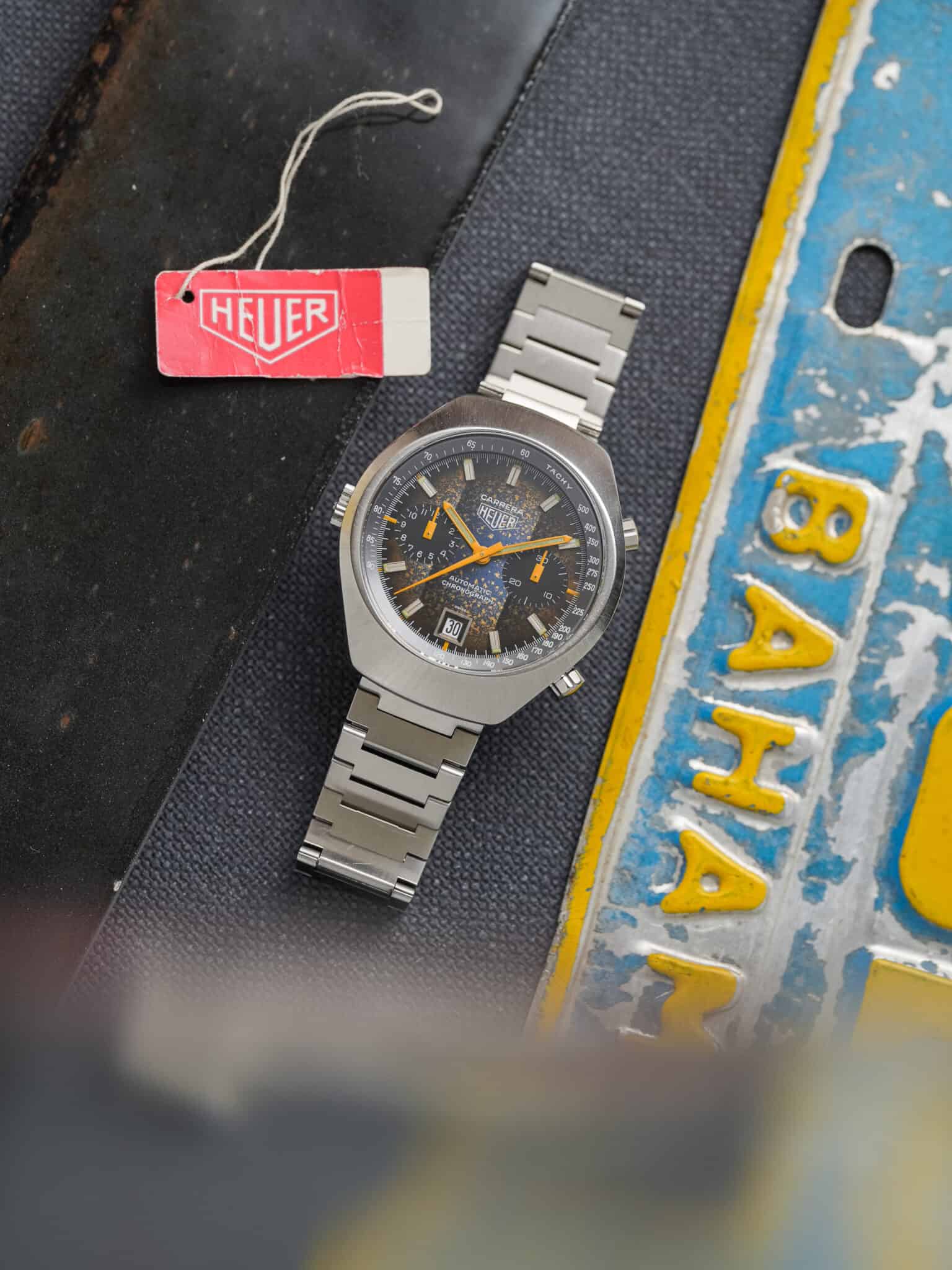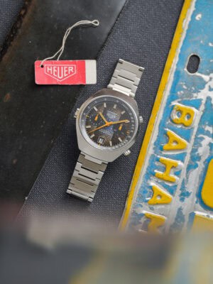 The barrel-shaped case shows signs of polishing, but still wears well. It comes with the case back sticker and the original HEUER hang-tag, small details that matter to collectors.