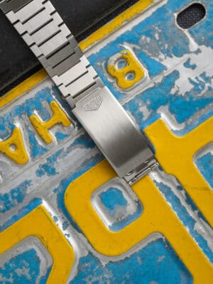It is fitted with its full-length original HEUER bracelet with signed clasp, in very good condition with almost no stretch, fitting wrists up to 20 cm.