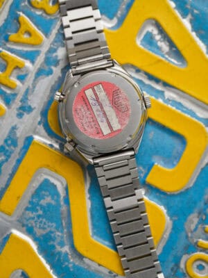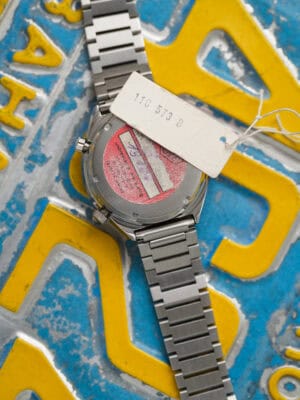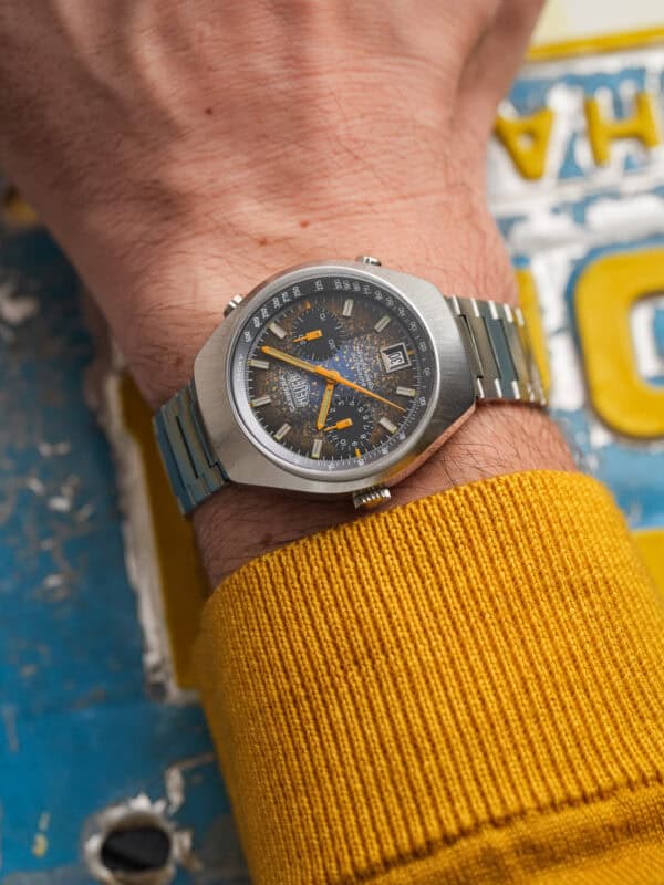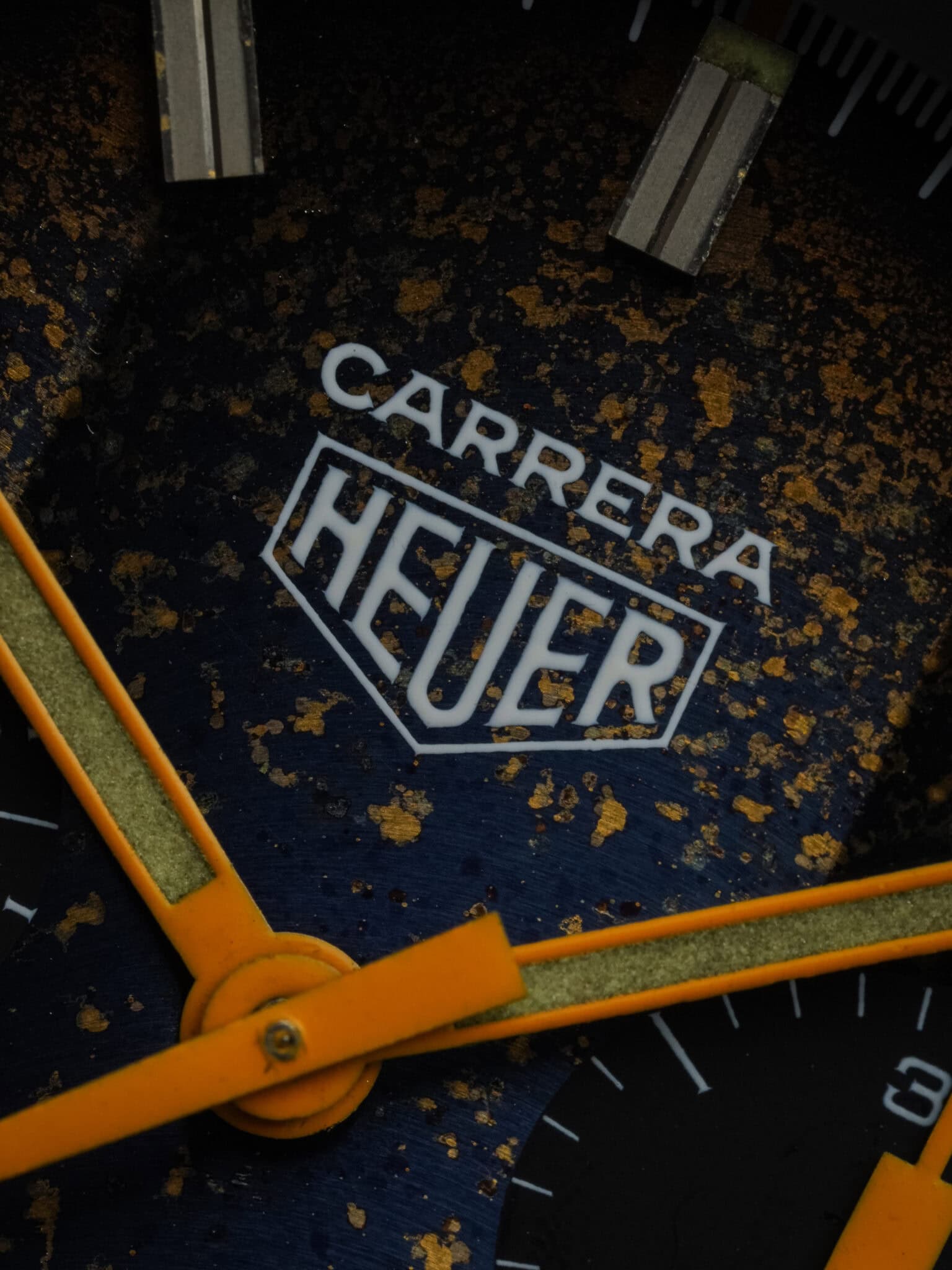 Originally delivered in 1974 with a blue luminous metallic dial finished with Côtes de Genève, this Carrera has aged in the most beautiful way. The blue base is still present, but time has added golden and brown tones across the surface, creating a warm, tropical patina that gives the watch a completely different personality.