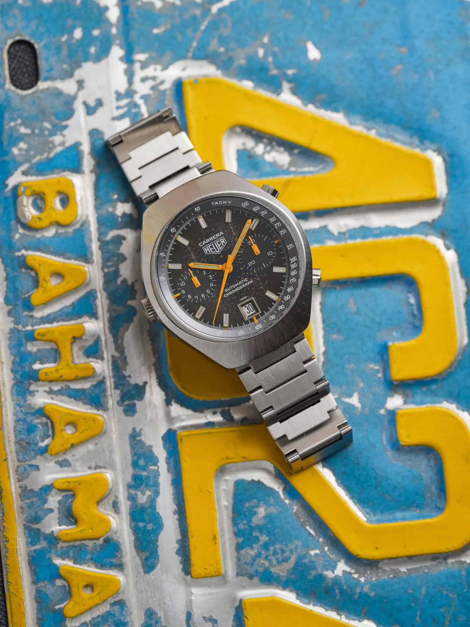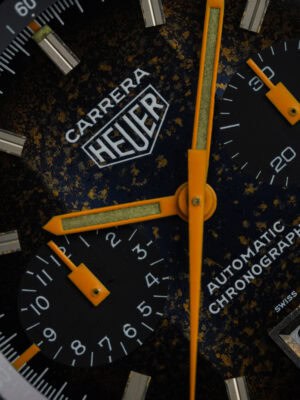 The outer part of the dial is darker, becoming lighter toward the center, creating a natural play of light and shadow. Combined with the orange-edged hands and orange chronograph needles, the colors work together perfectly and give the watch a lot of depth. The 12-hour chronograph layout keeps the classic Carrera balance and readability.