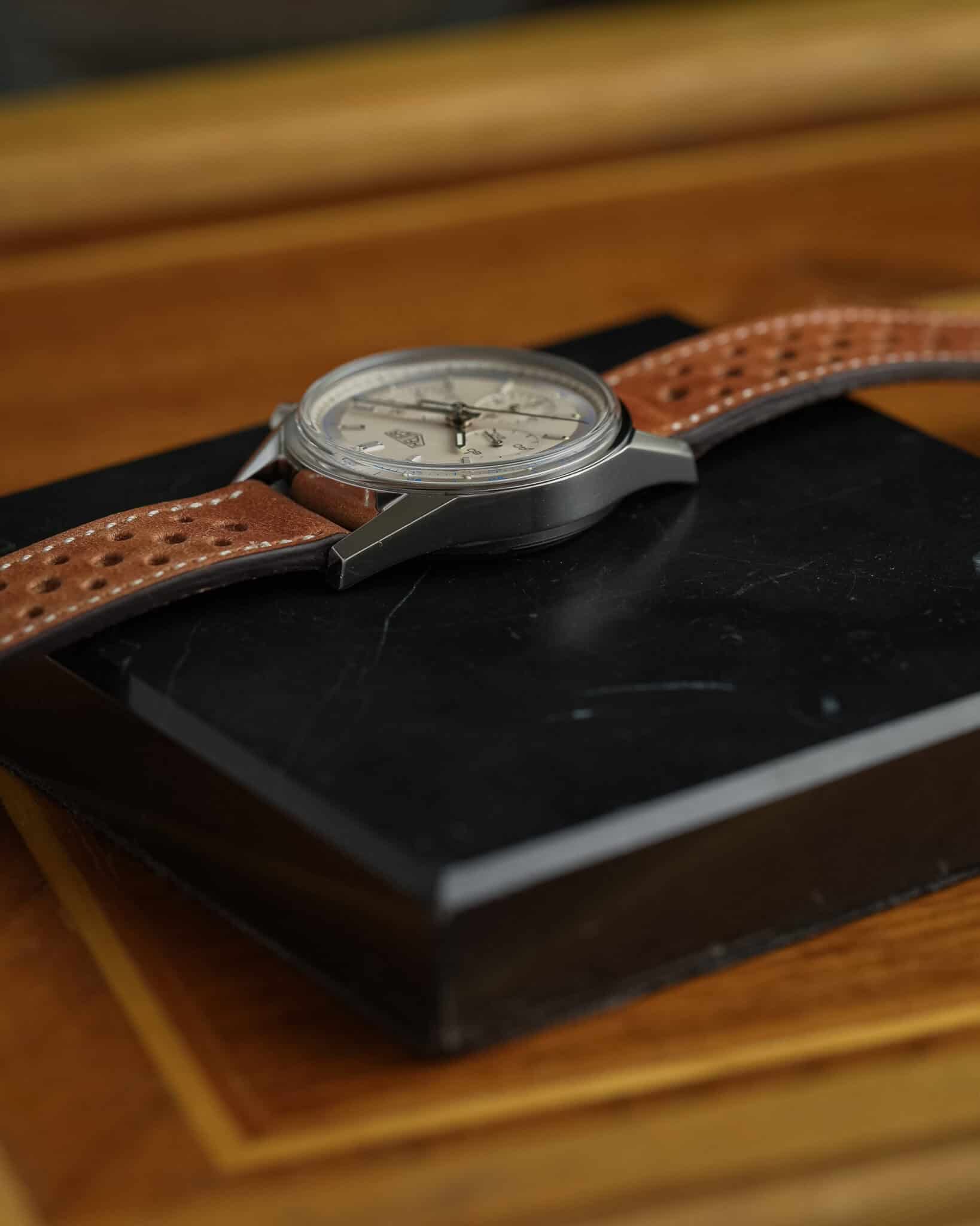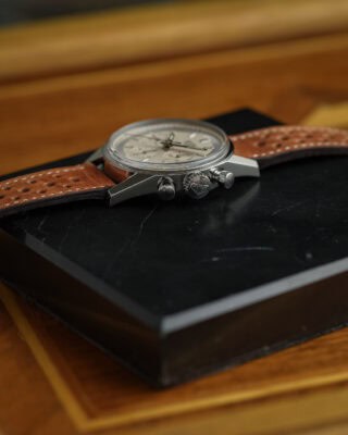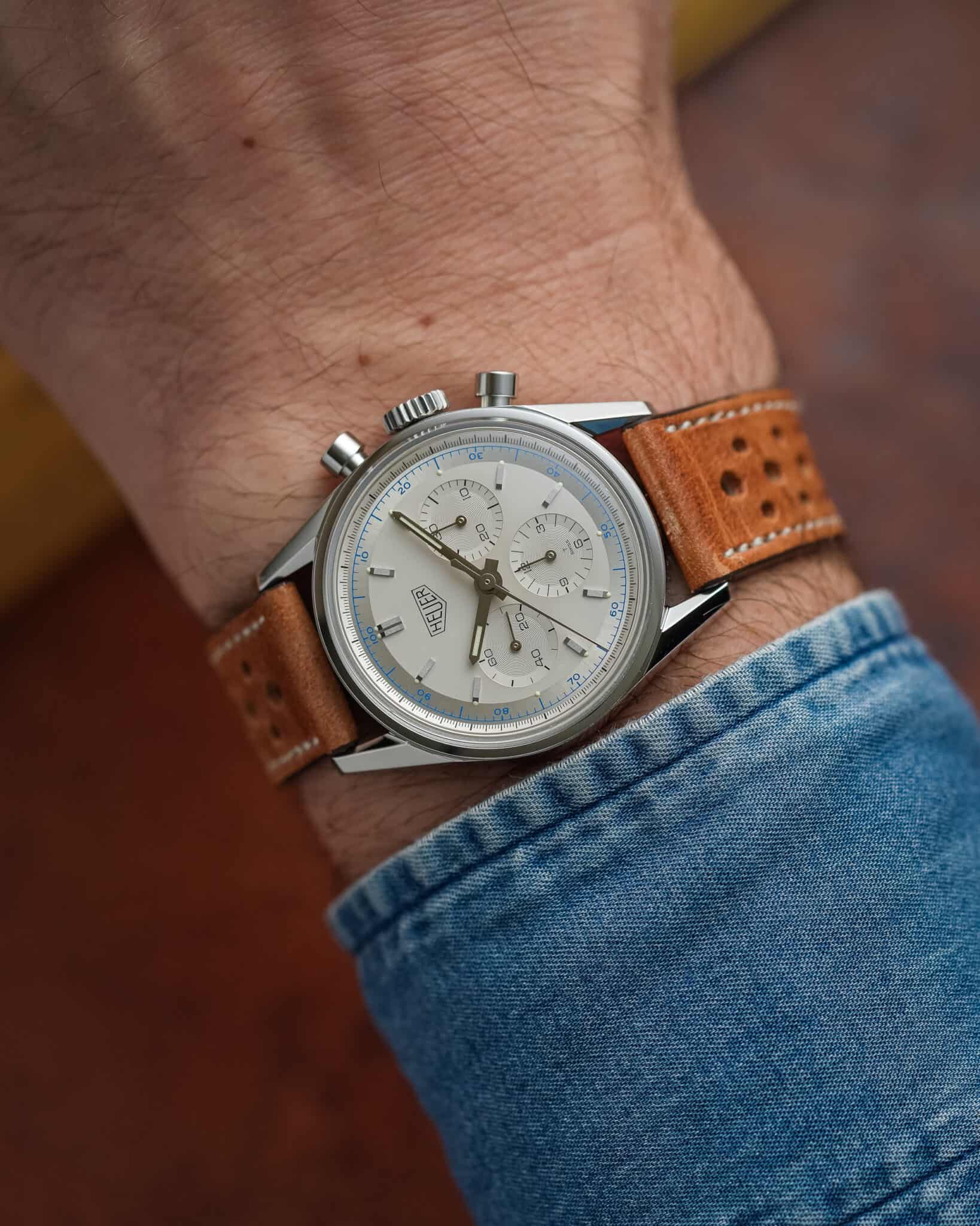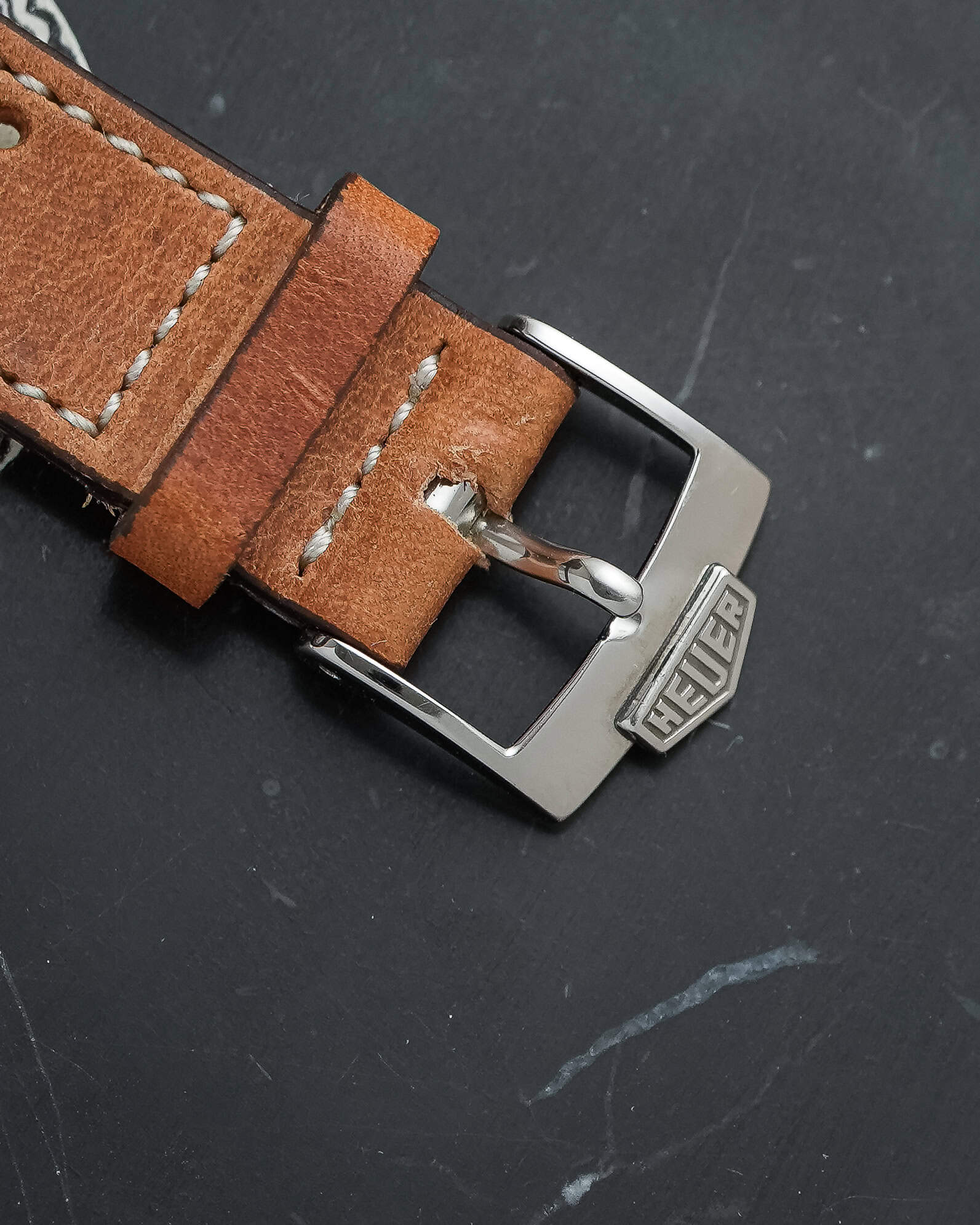 New hand made in Germany leather strap, crafted from Horween leather, paired with the original HEUER pin buckle.