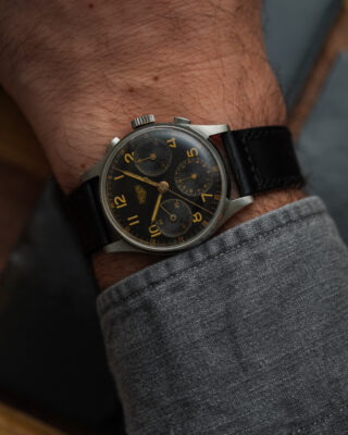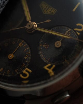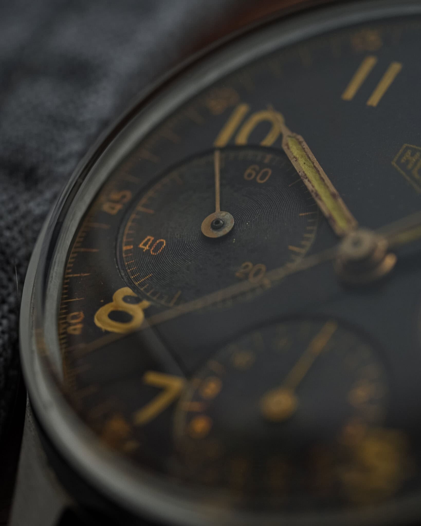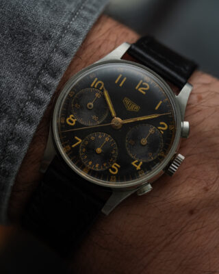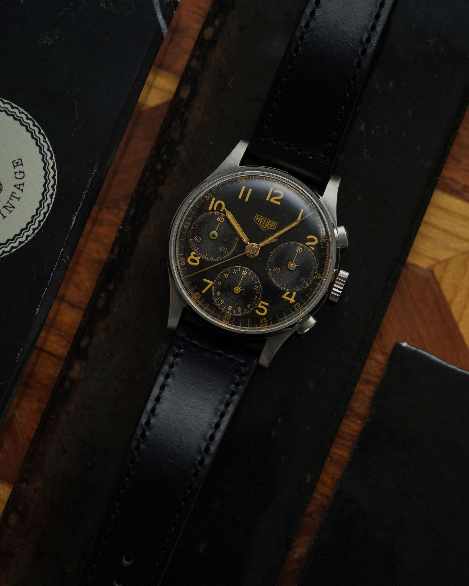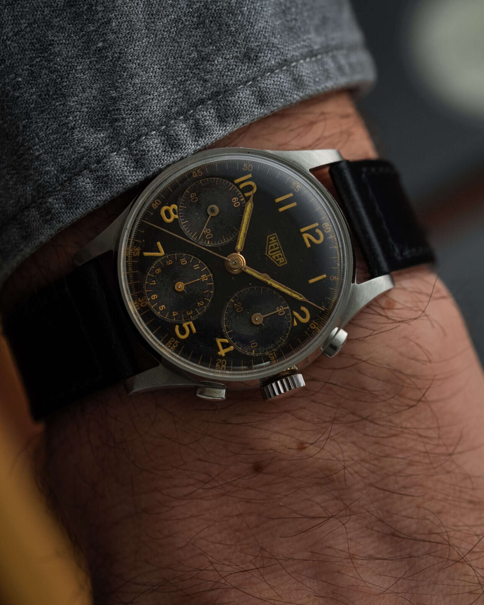 A 1943 Heuer pre-Carrera ref. 345, its black gilt dial still breathing with the pulse of another era.