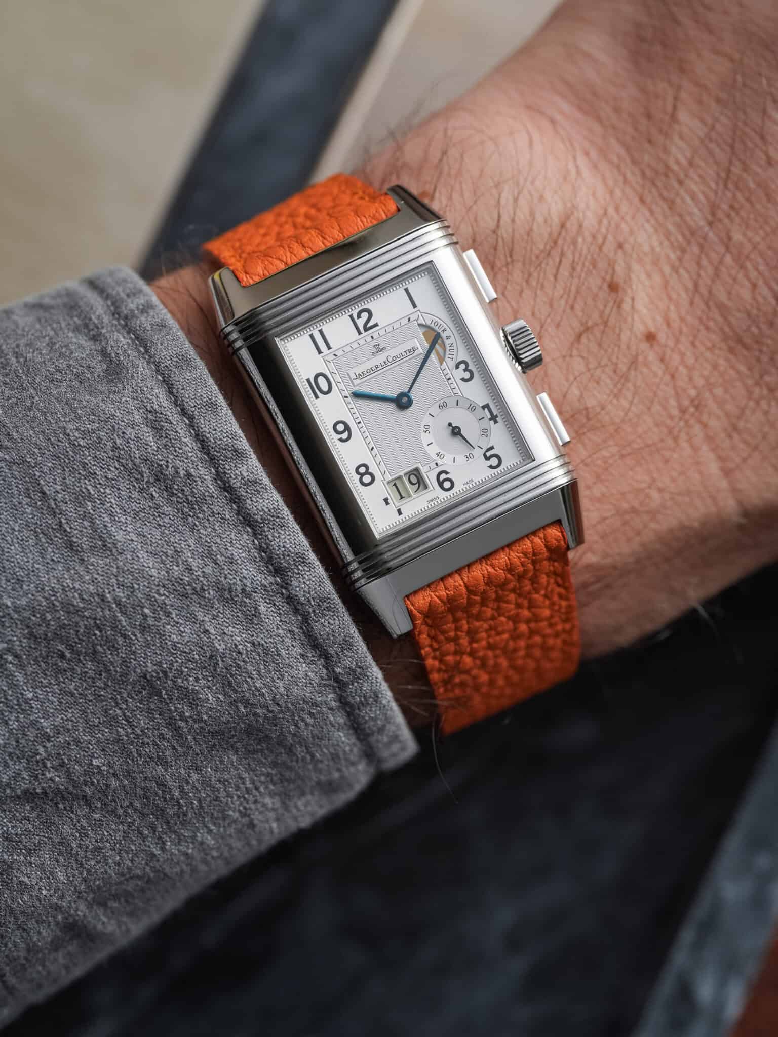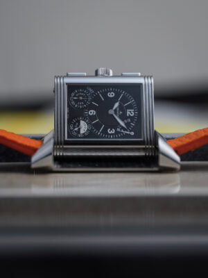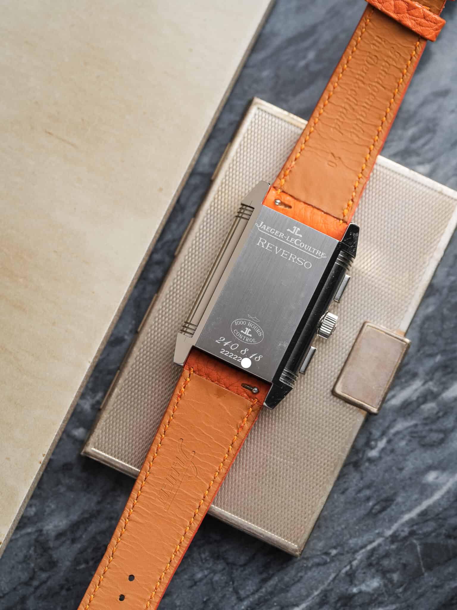 The choice of an orange strap was both easy and intentional, echoing the tones of the sun on the front dial and reinforcing the watch’s more dynamic character. It adds a contemporary edge while remaining perfectly in harmony with the Reverso’s architectural lines.