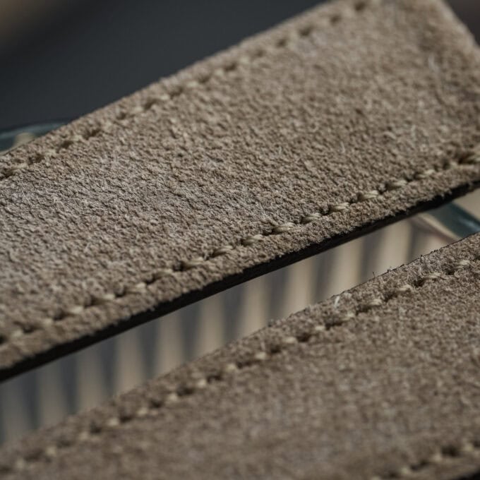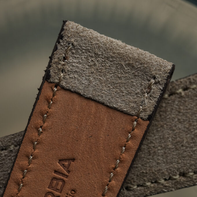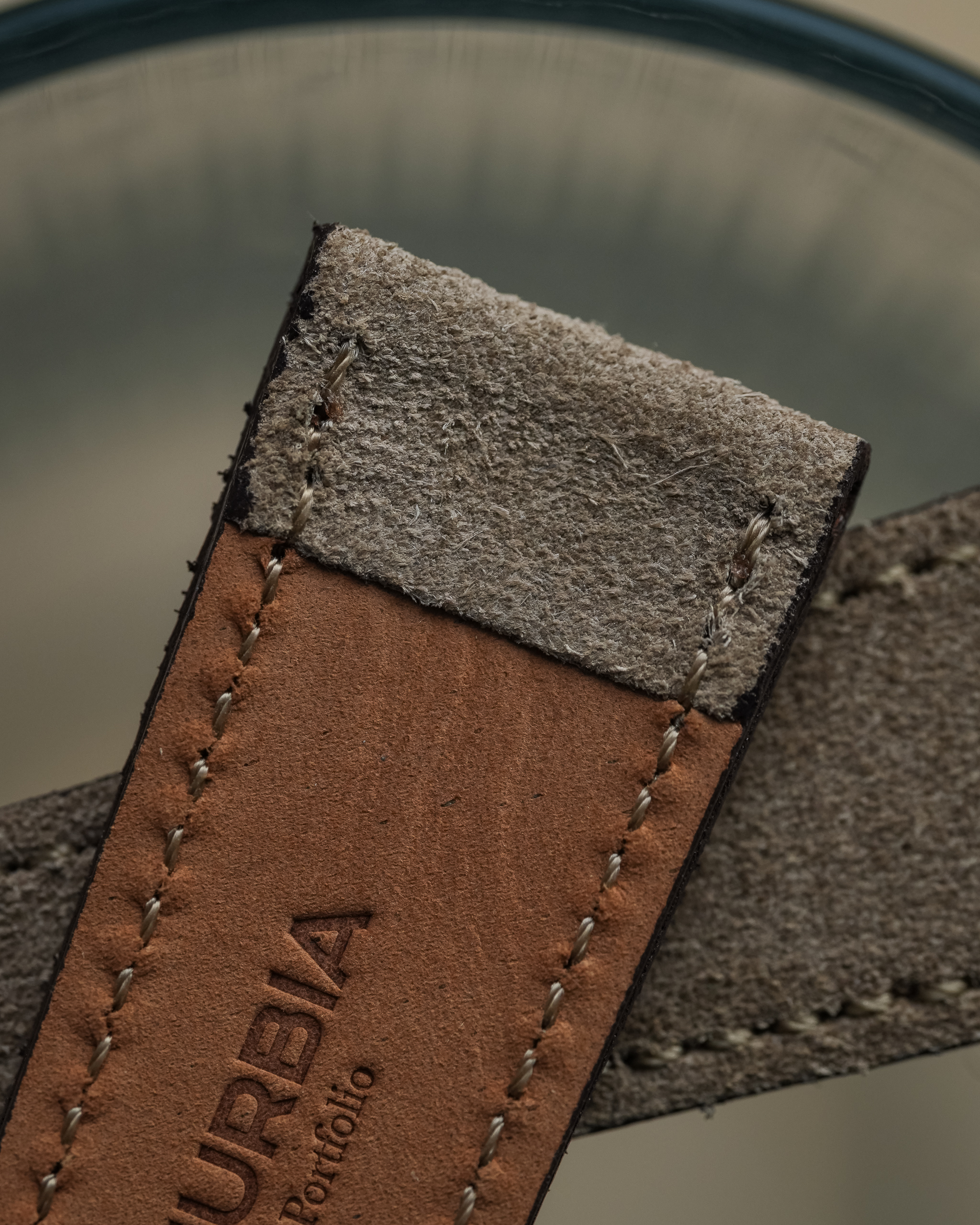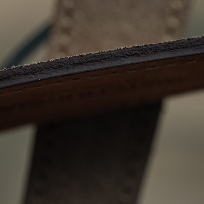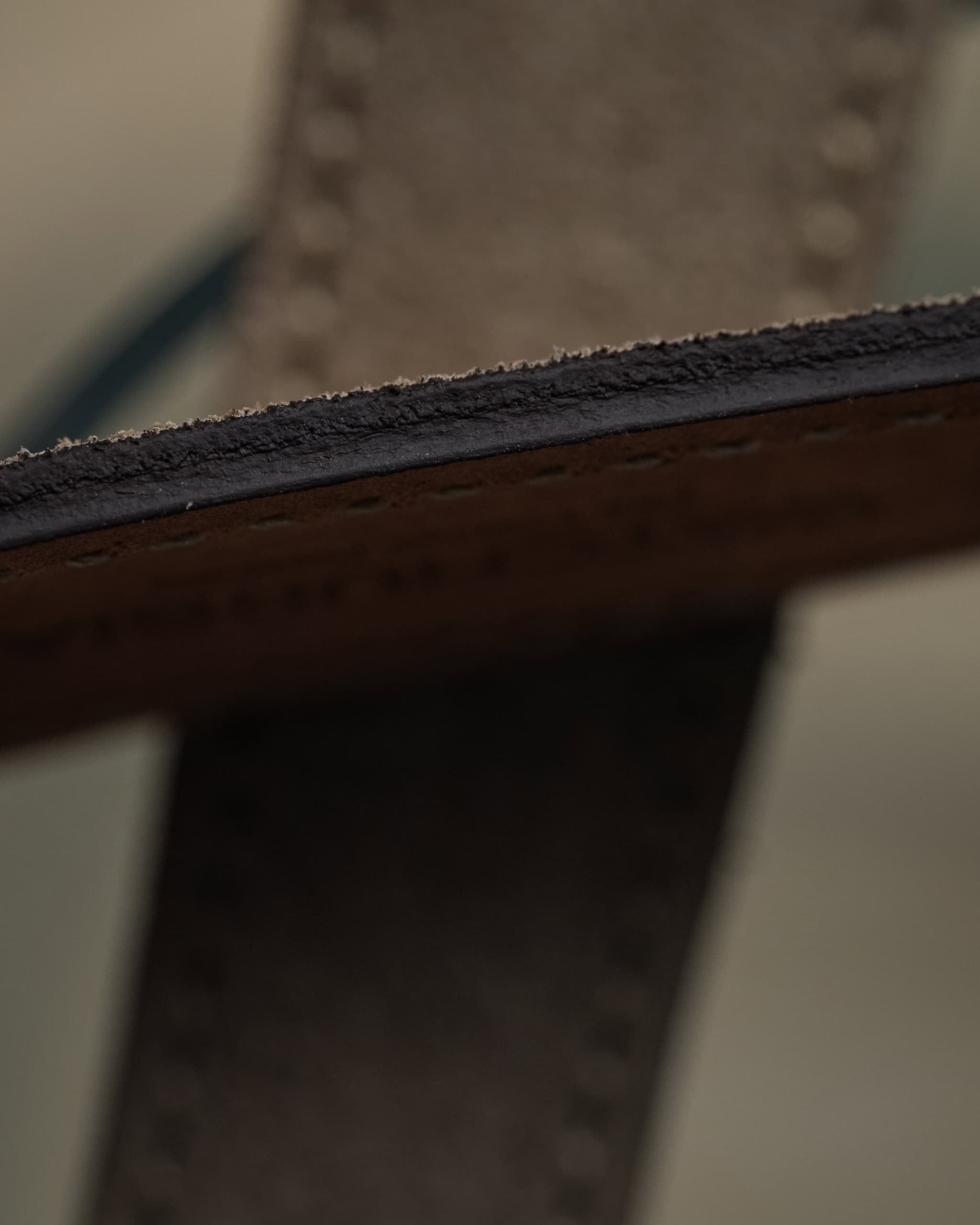 Entirely handmade, the strap bears the unmistakable signature of skilled hands: edges meticulously sealed—including the loops—for durability and refinement. Ultra-dense stitching reinforces the construction, delivering strength without sacrificing grace.