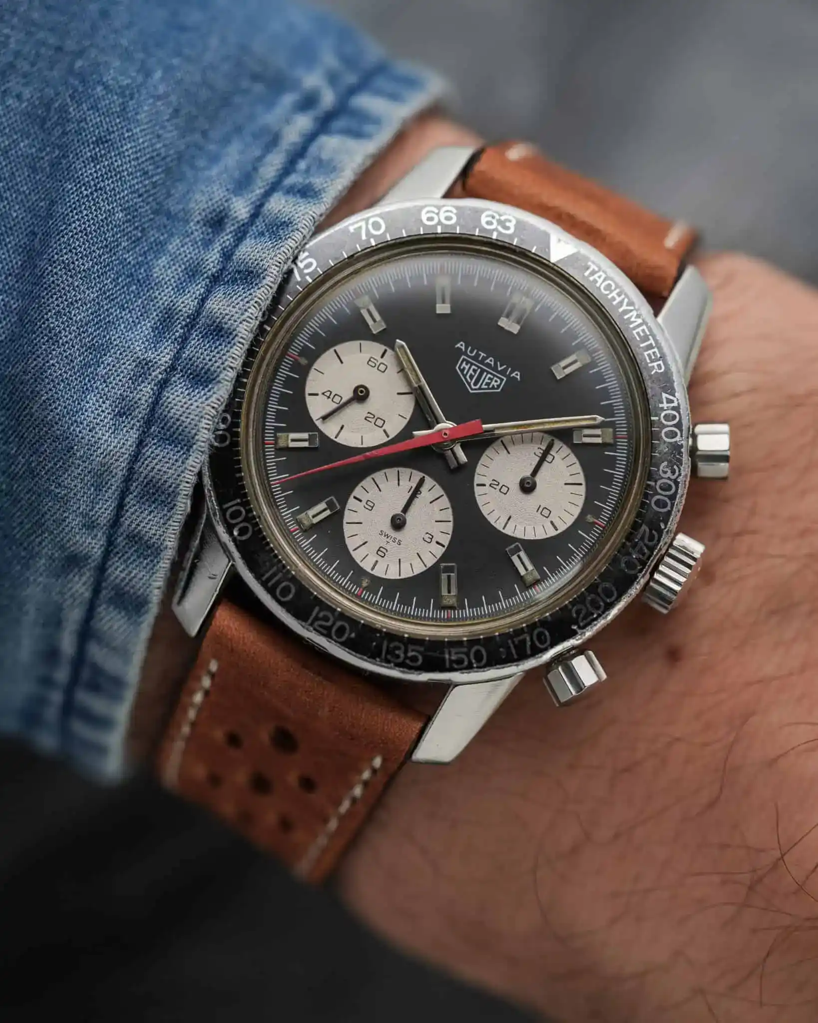 HEUER cataloged these models in 1970/71, and they were available with three different bezel options: “M” for miles, “H” for hours, or “T” for tachymeter – the version we have here.