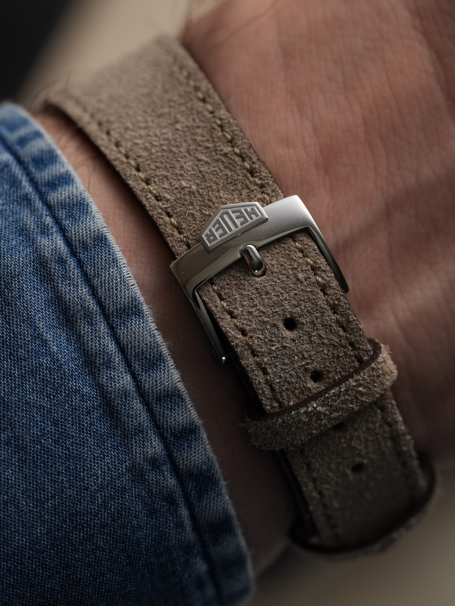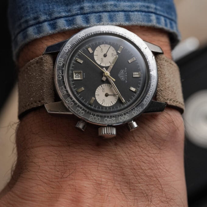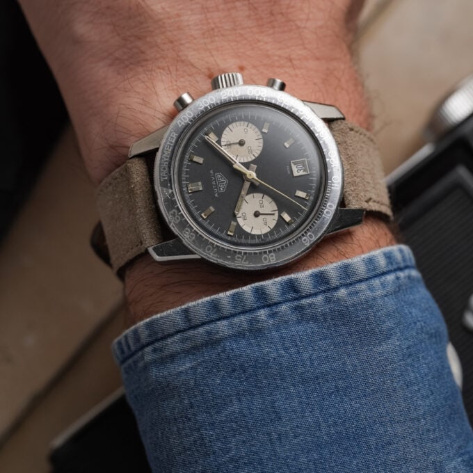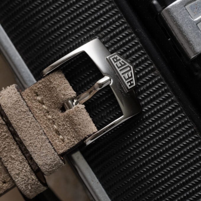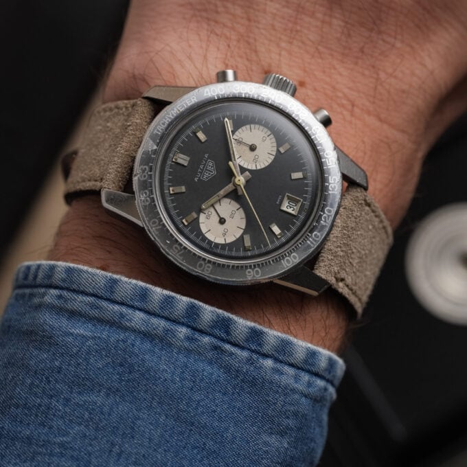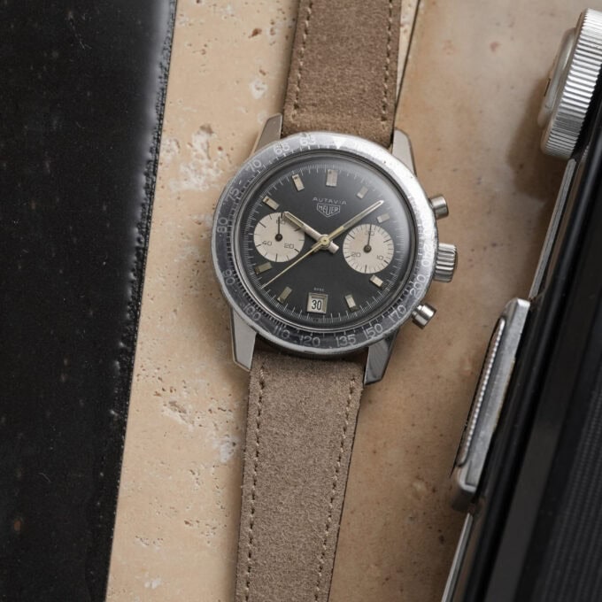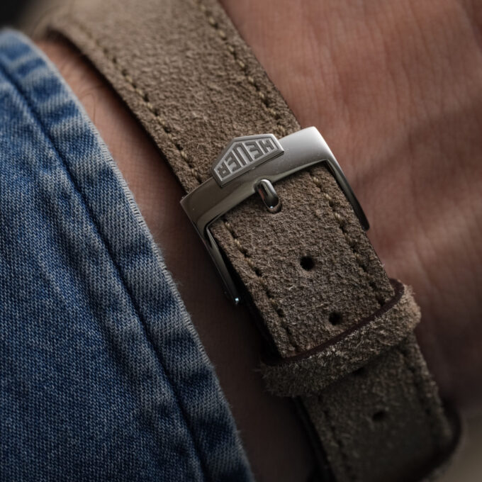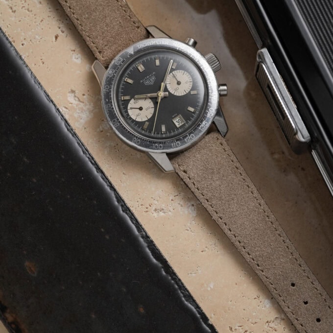 The watch is fitted with our handmade Desert Drift suede strap and paired with an original Heuer pin buckle.