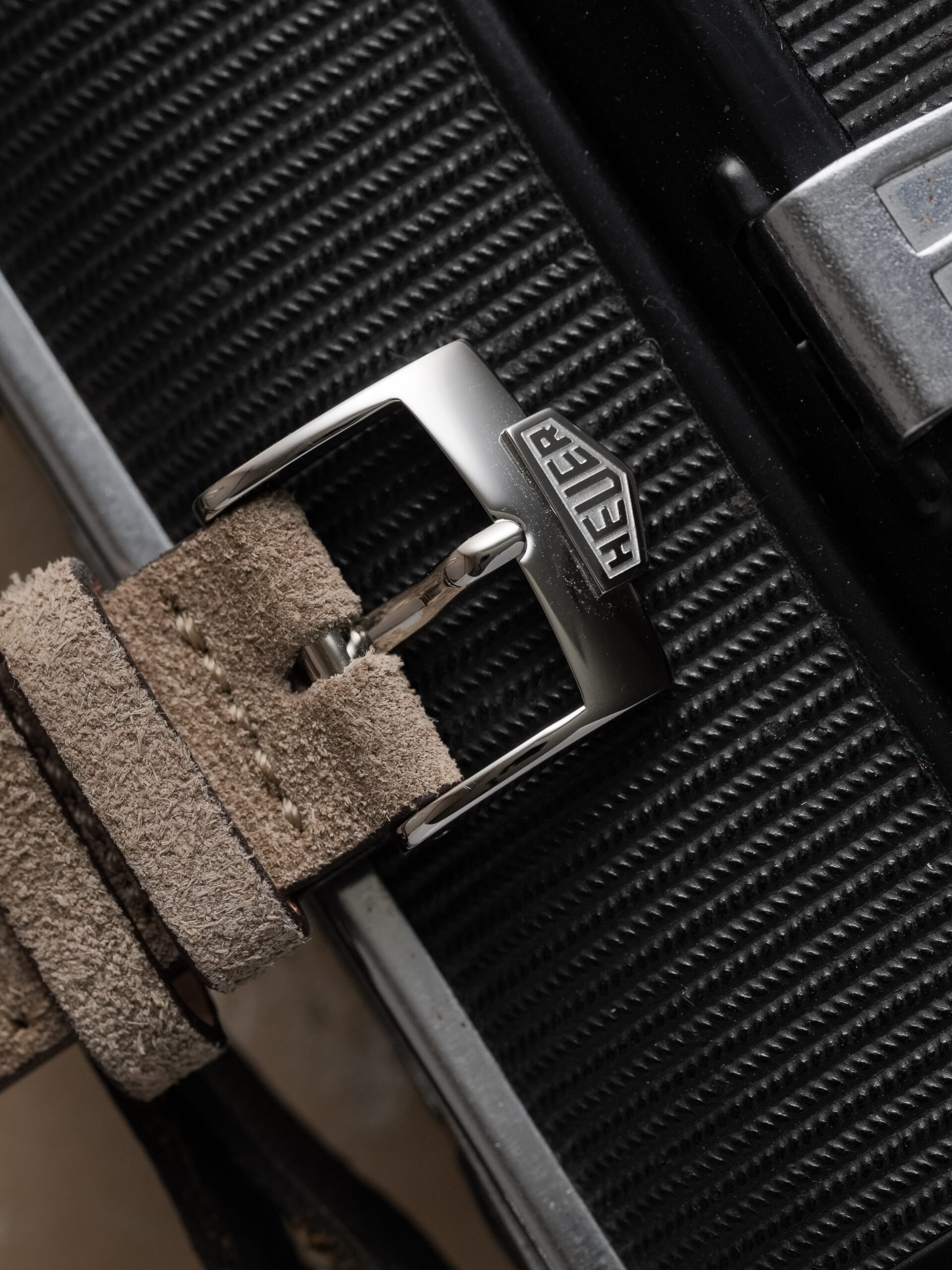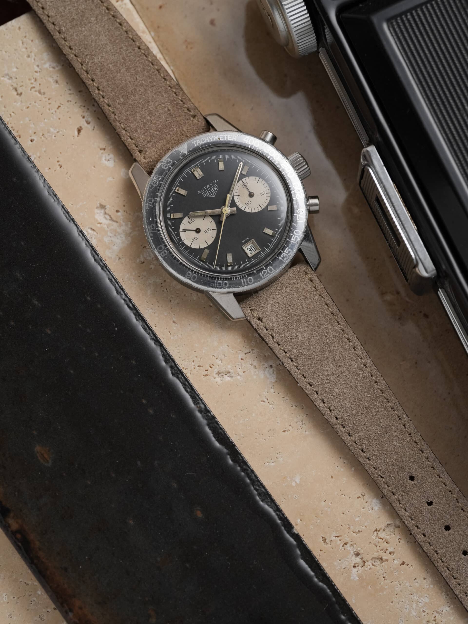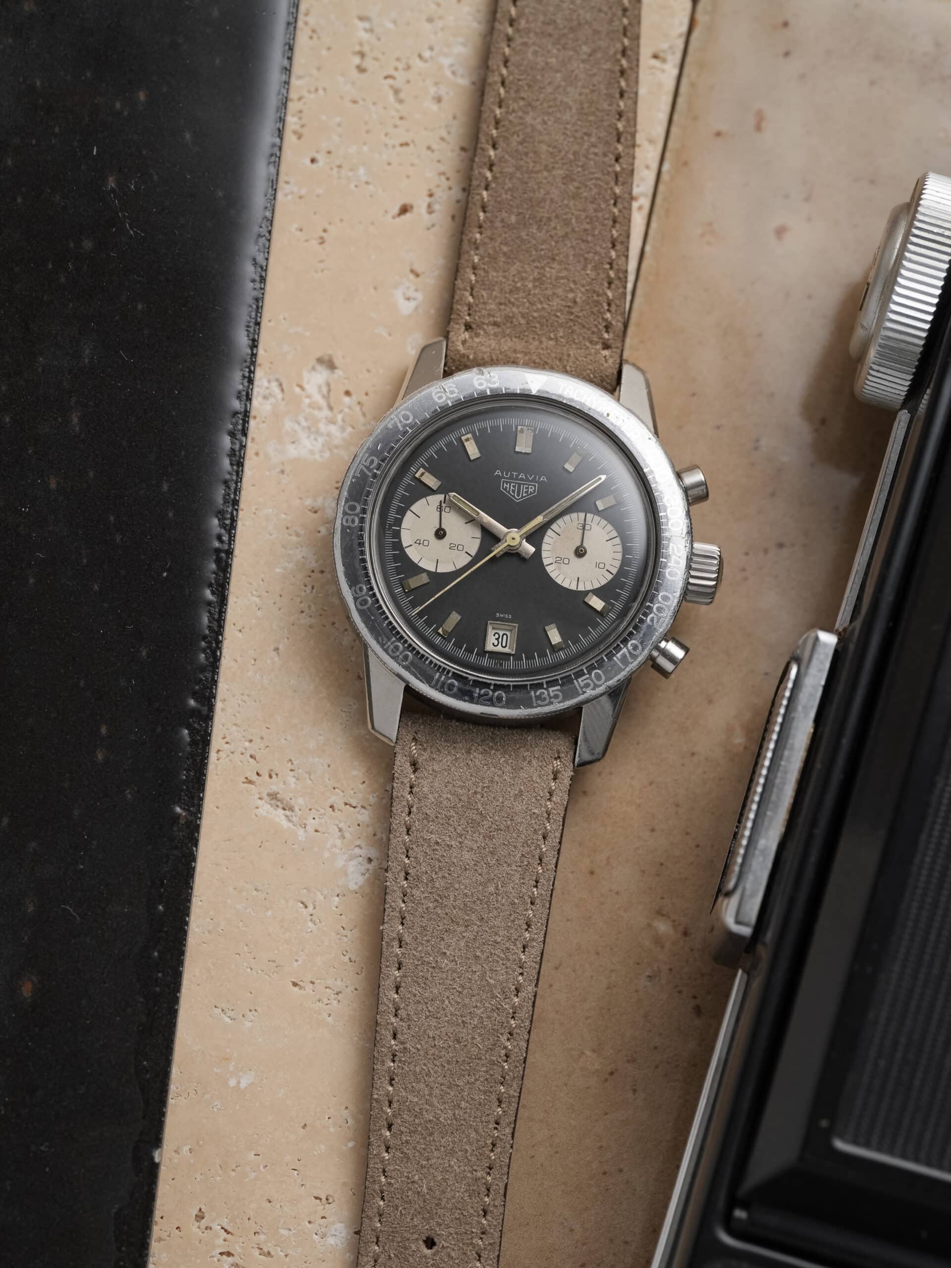 The watch is fitted with our handmade Desert Drift suede strap and paired with an original Heuer pin buckle.