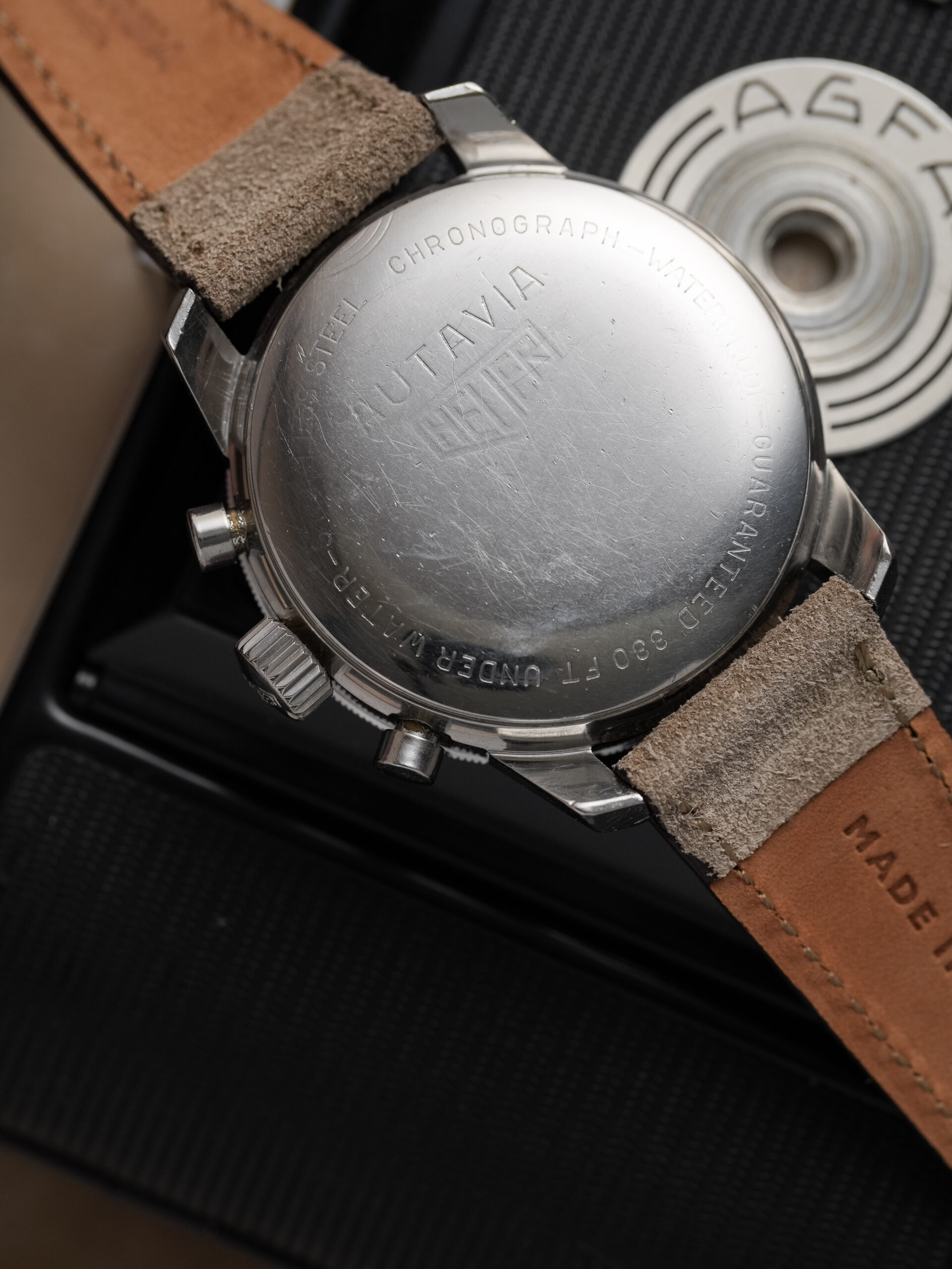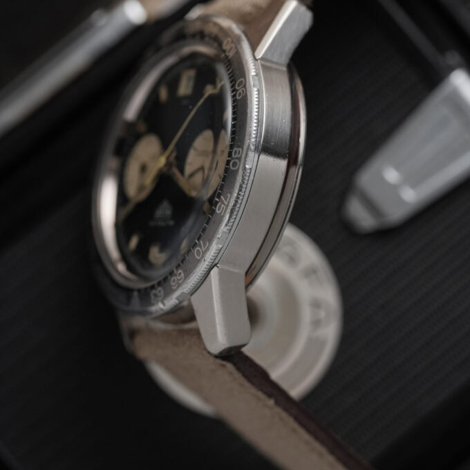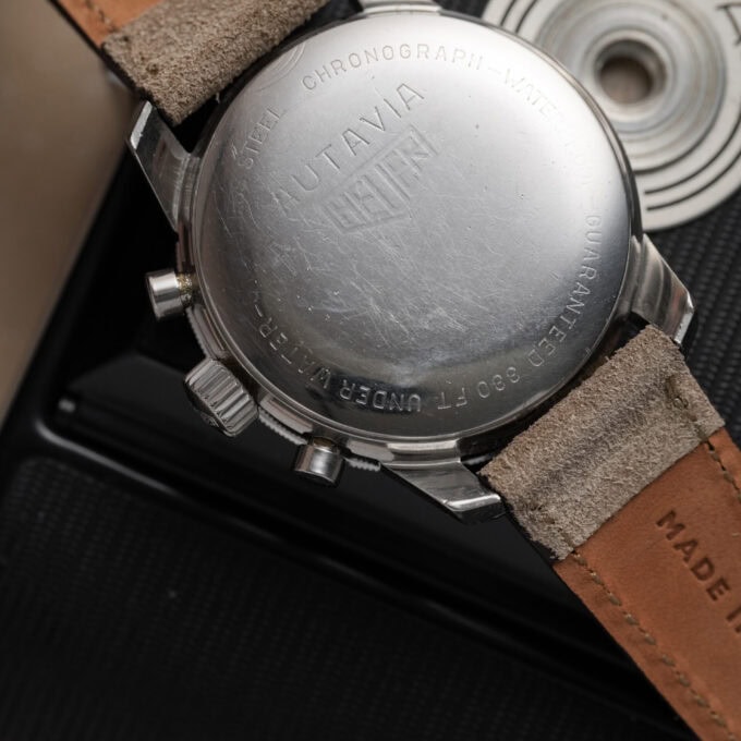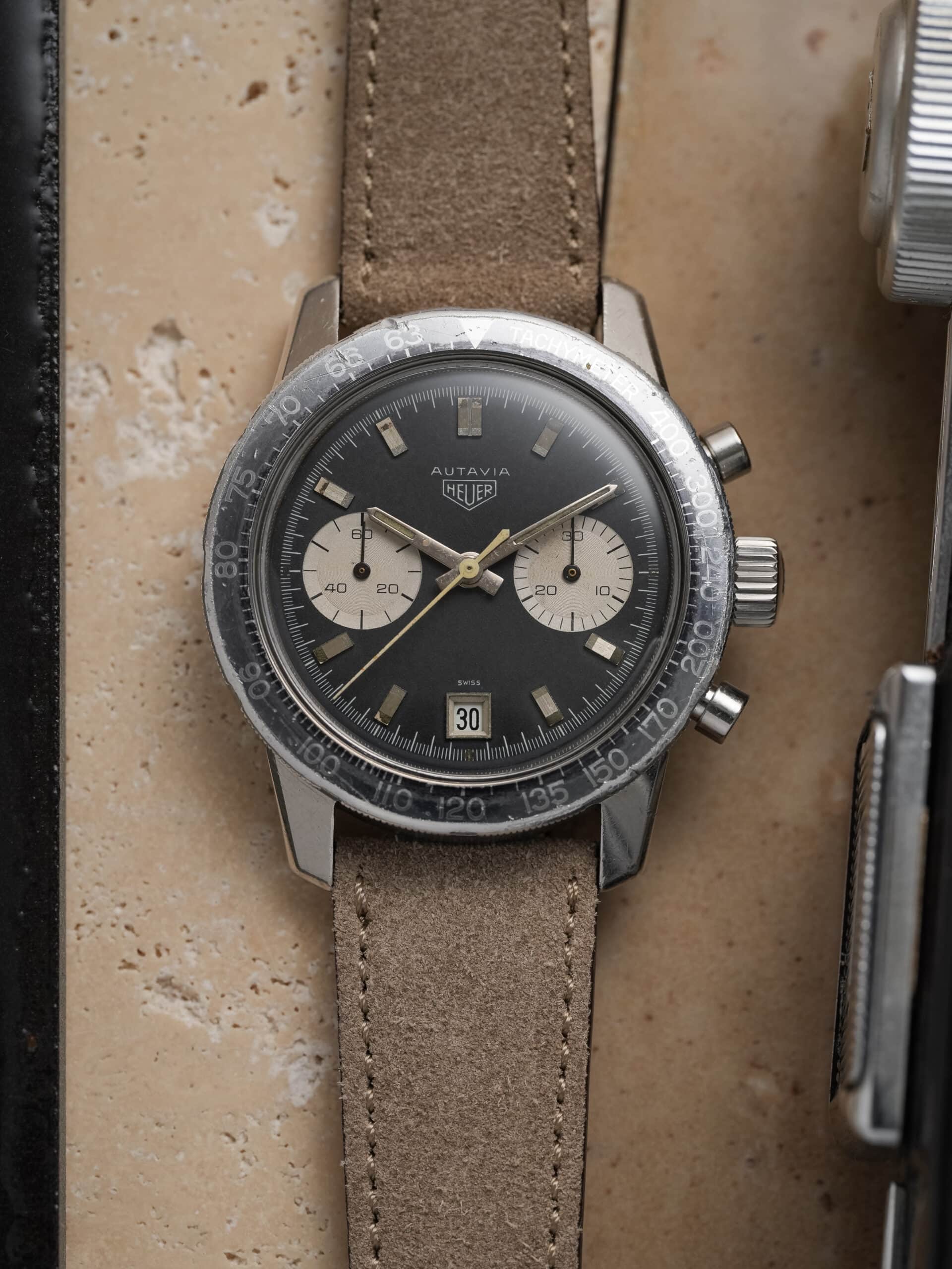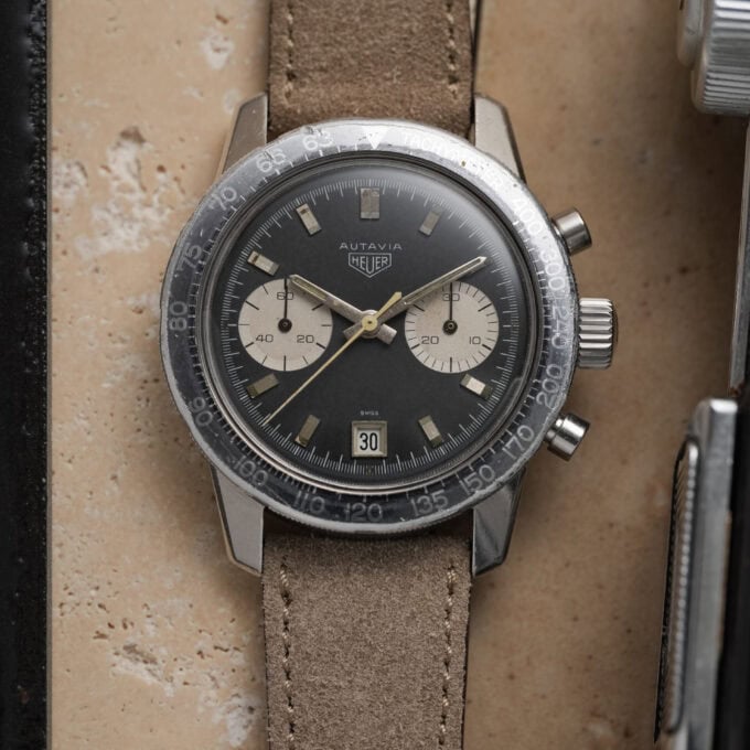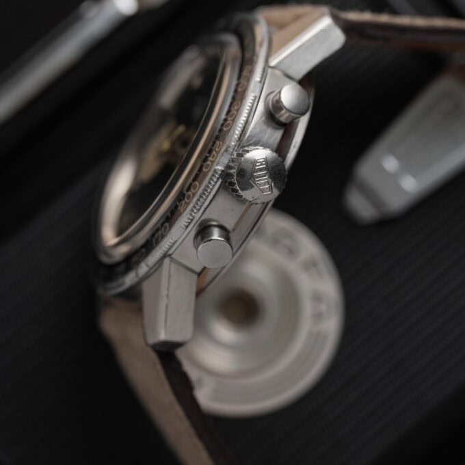This is the sought-after two-register reverse panda dial, part of the first execution of the compressor-case Autavia. Introduced in 1968, this watch dates to that same year, confirmed by its early serial number.