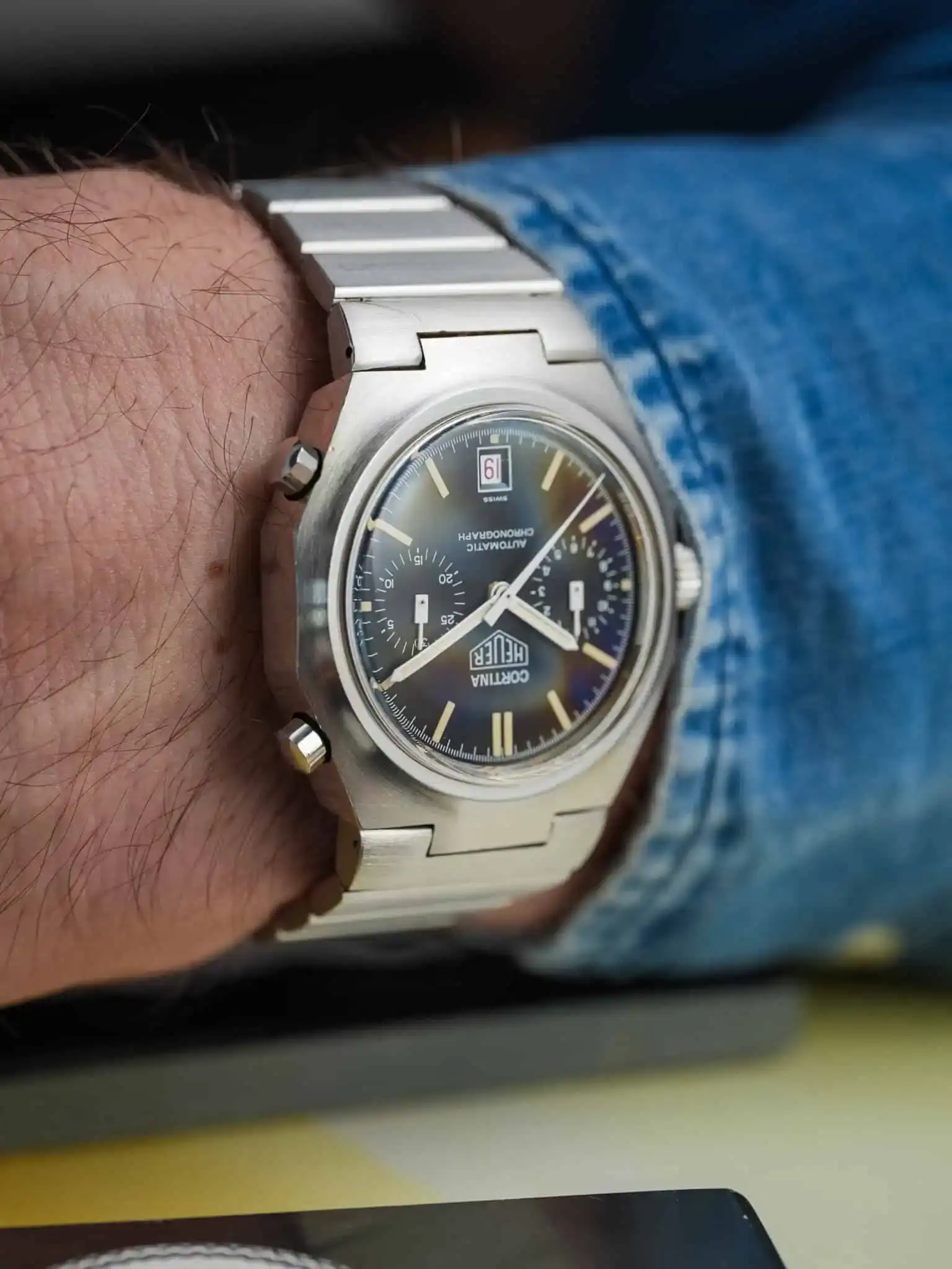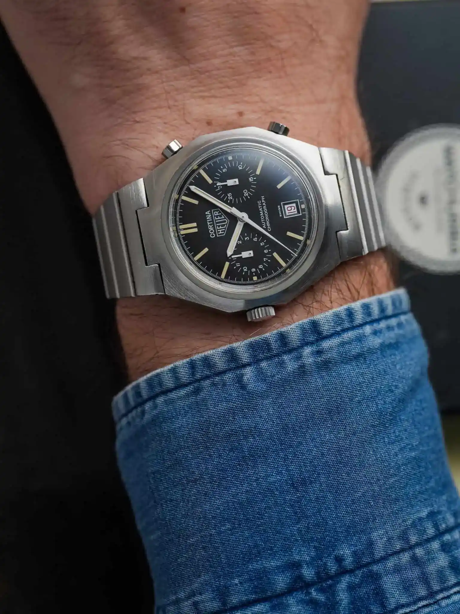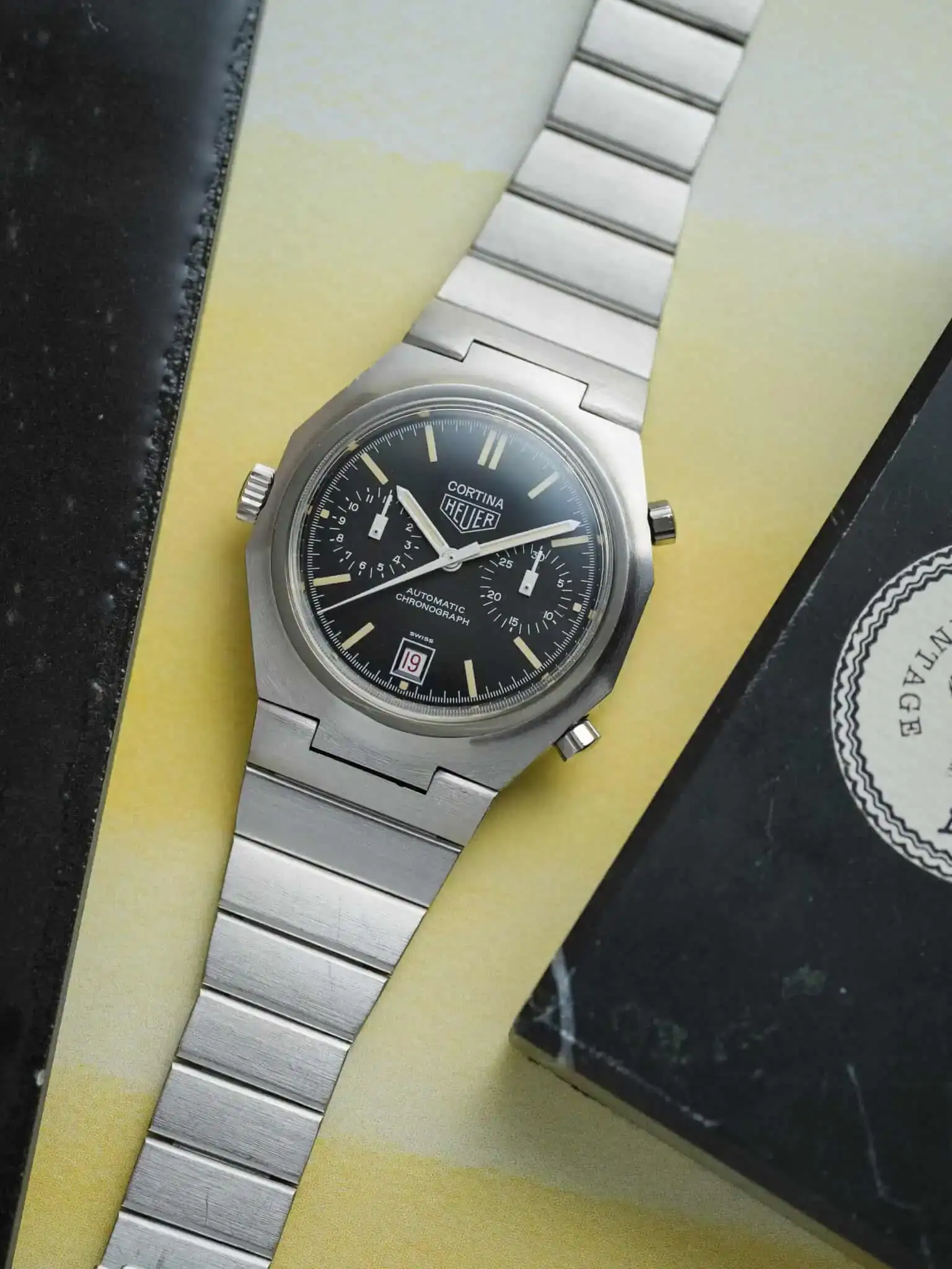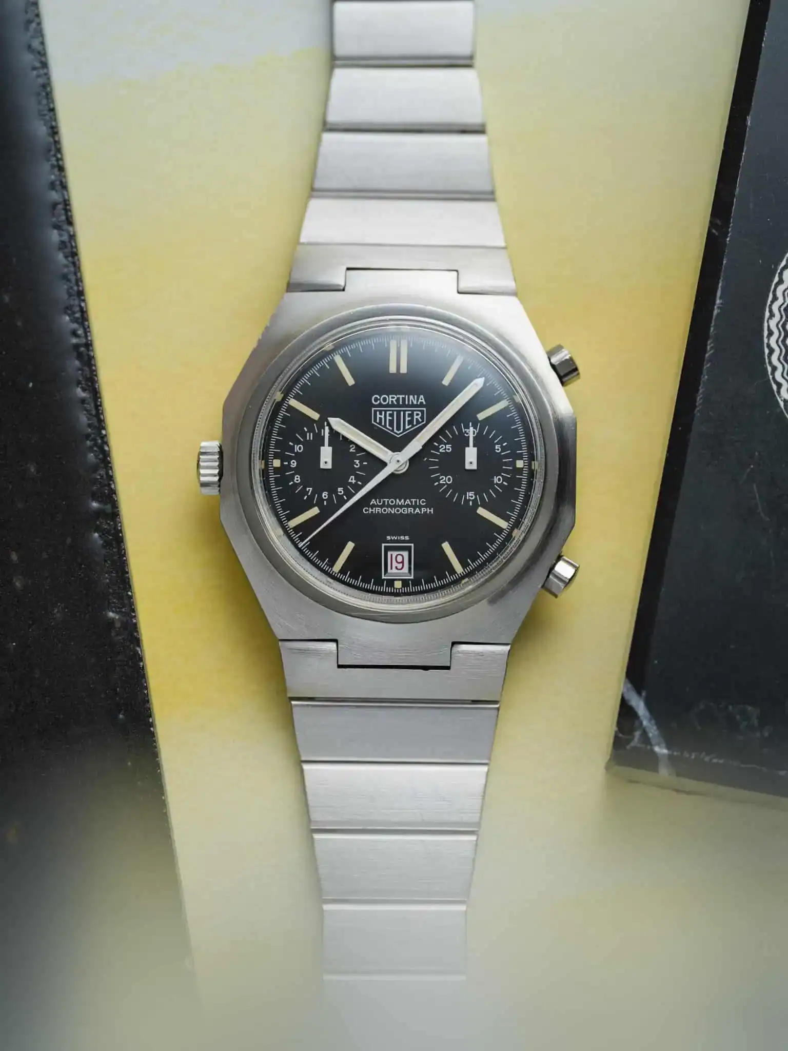 This HEUER Cortina Ref. 110.233 NC pairs its unmistakable hexagonal case with an integrated stainless-steel bracelet—pure late-1970s confidence. The black dial is remarkably well preserved, now enriched by a smooth vanilla patina that brings warmth and tension to the sharp geometry.