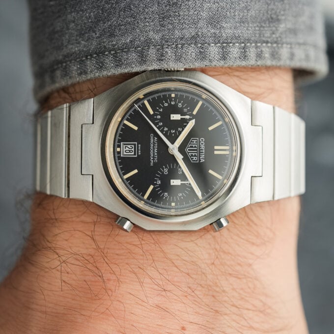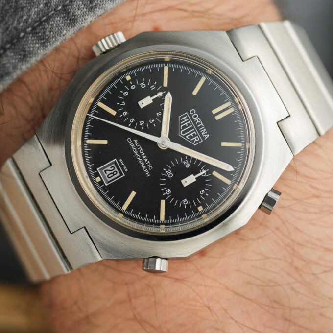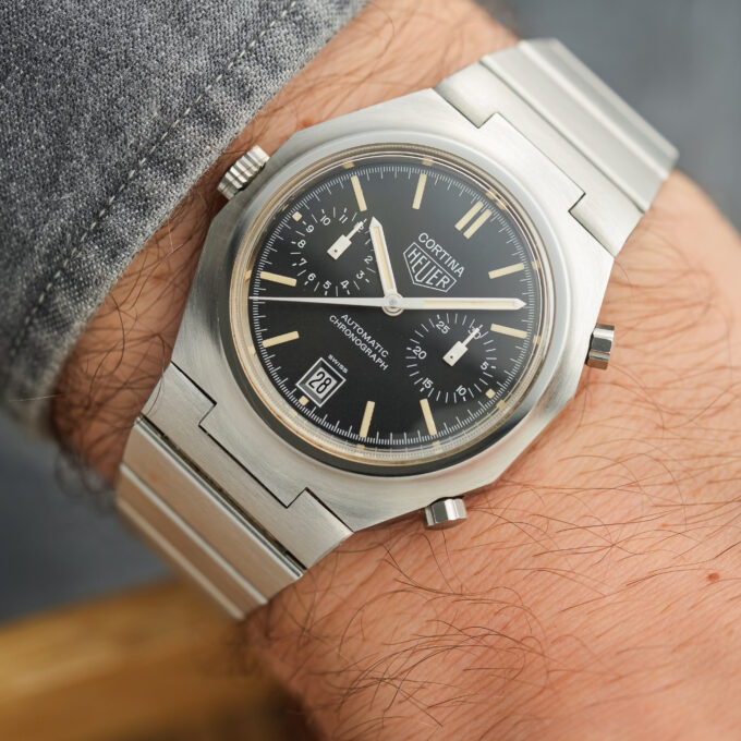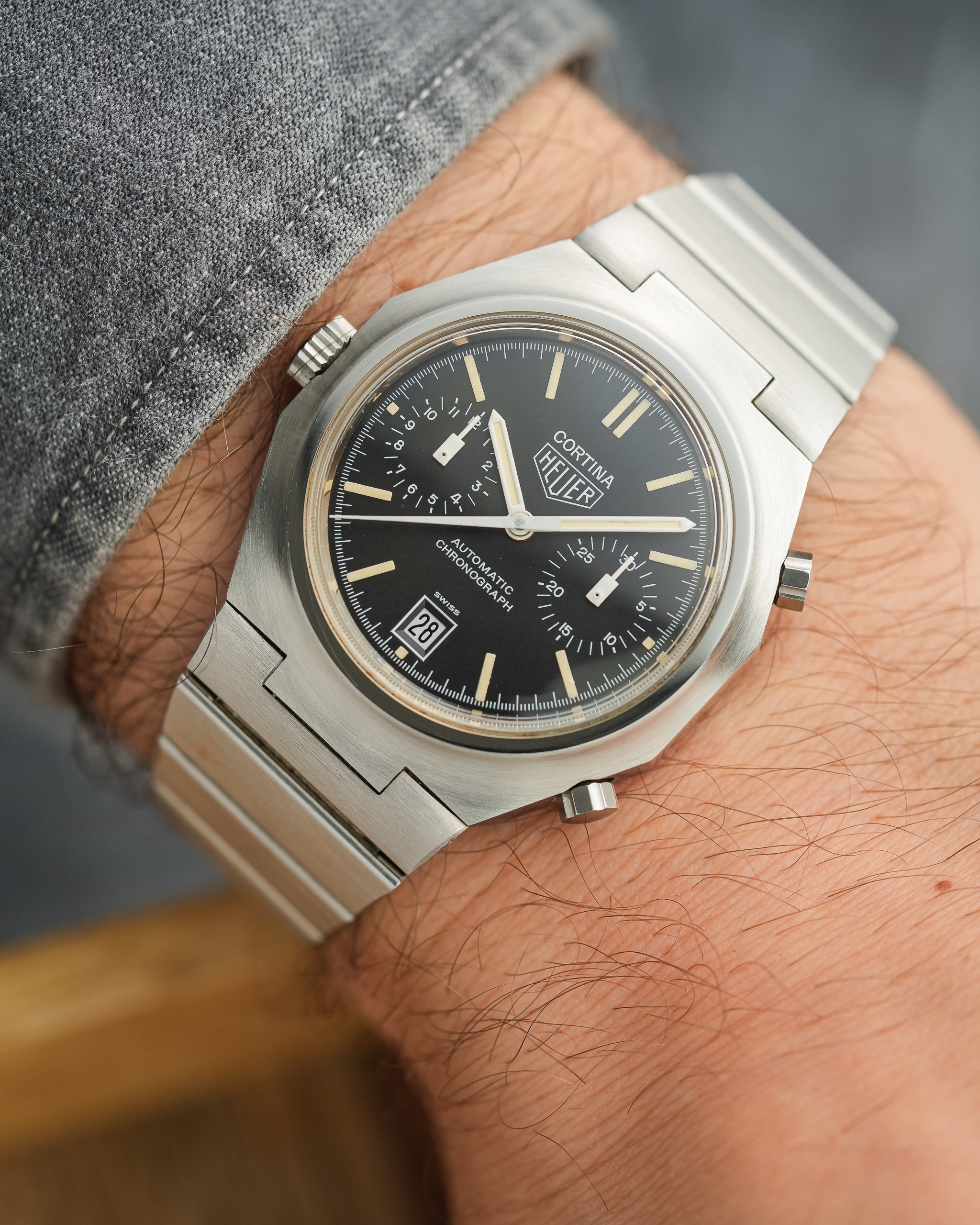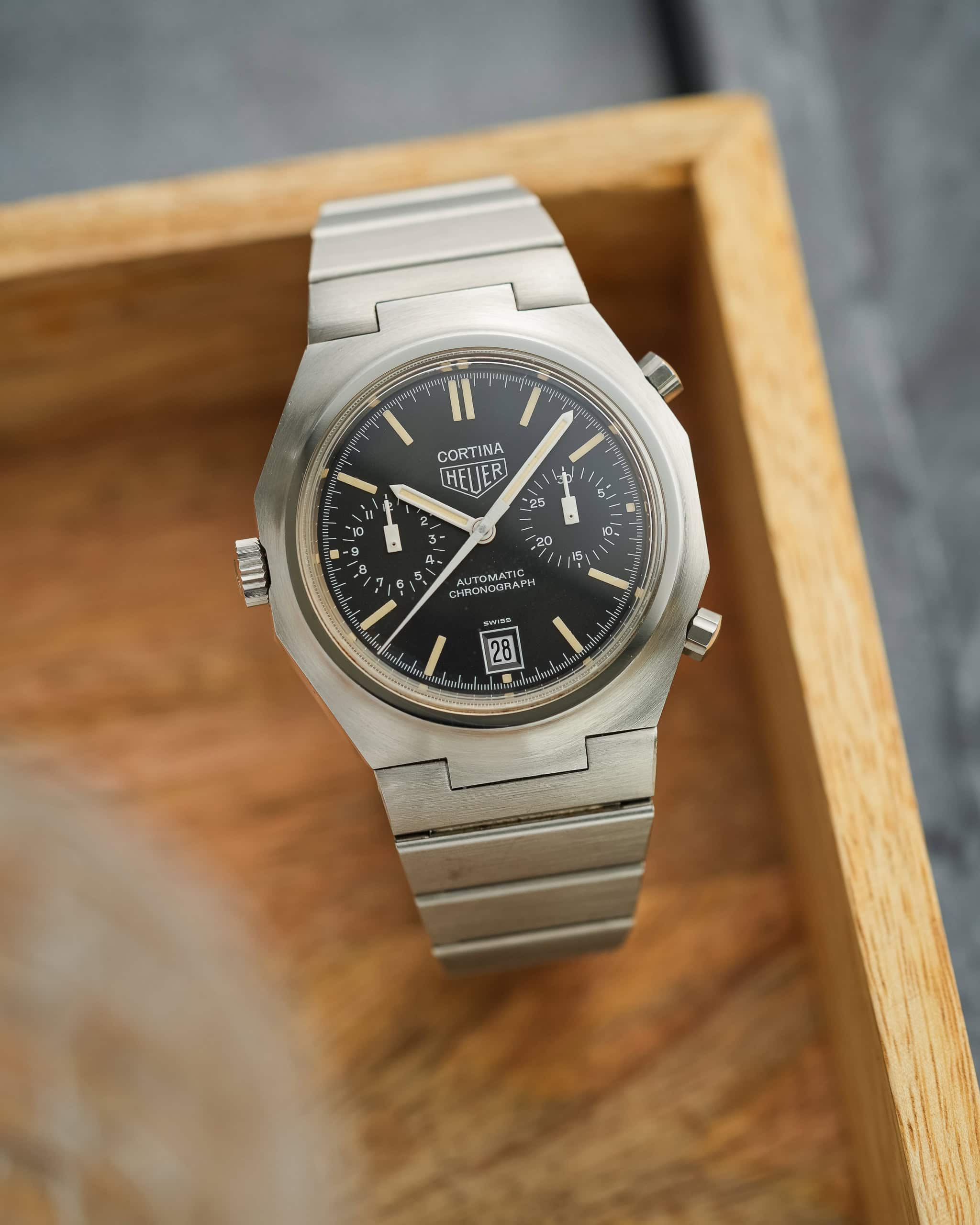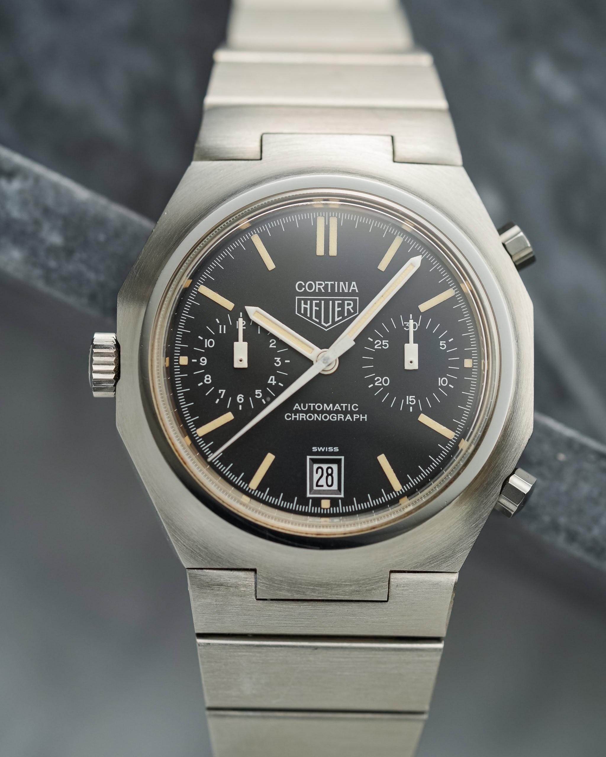 Featuring a hexagonal case and an integrated, stainless steel bracelet, the HEUER Cortina Ref. 110.233 NC (with a black dial) is in great overall condition.