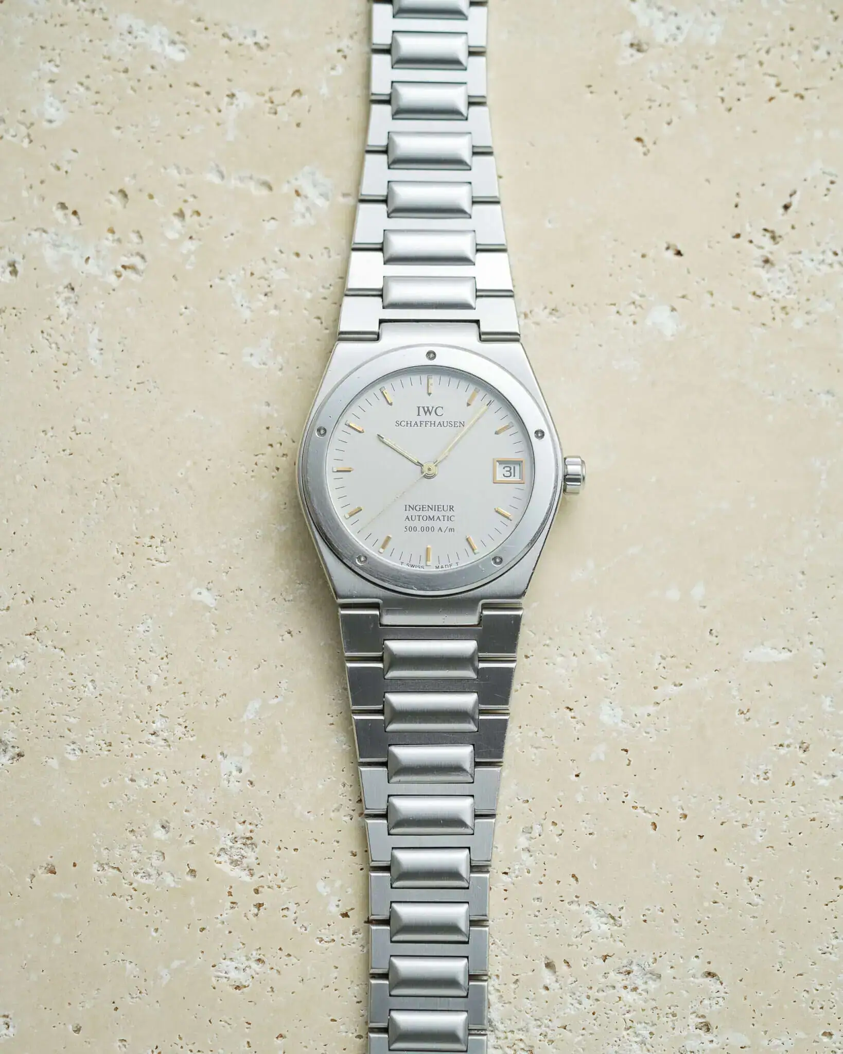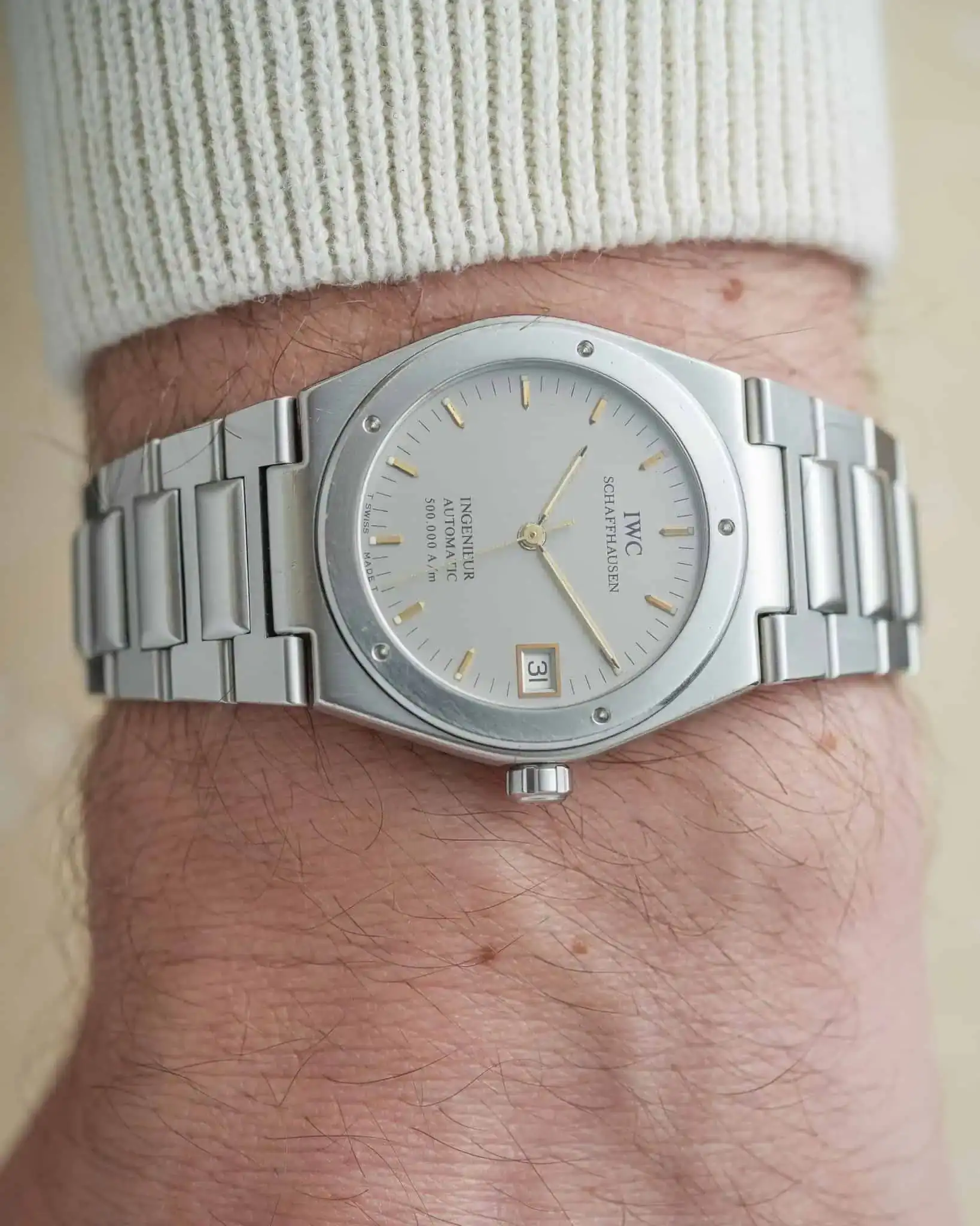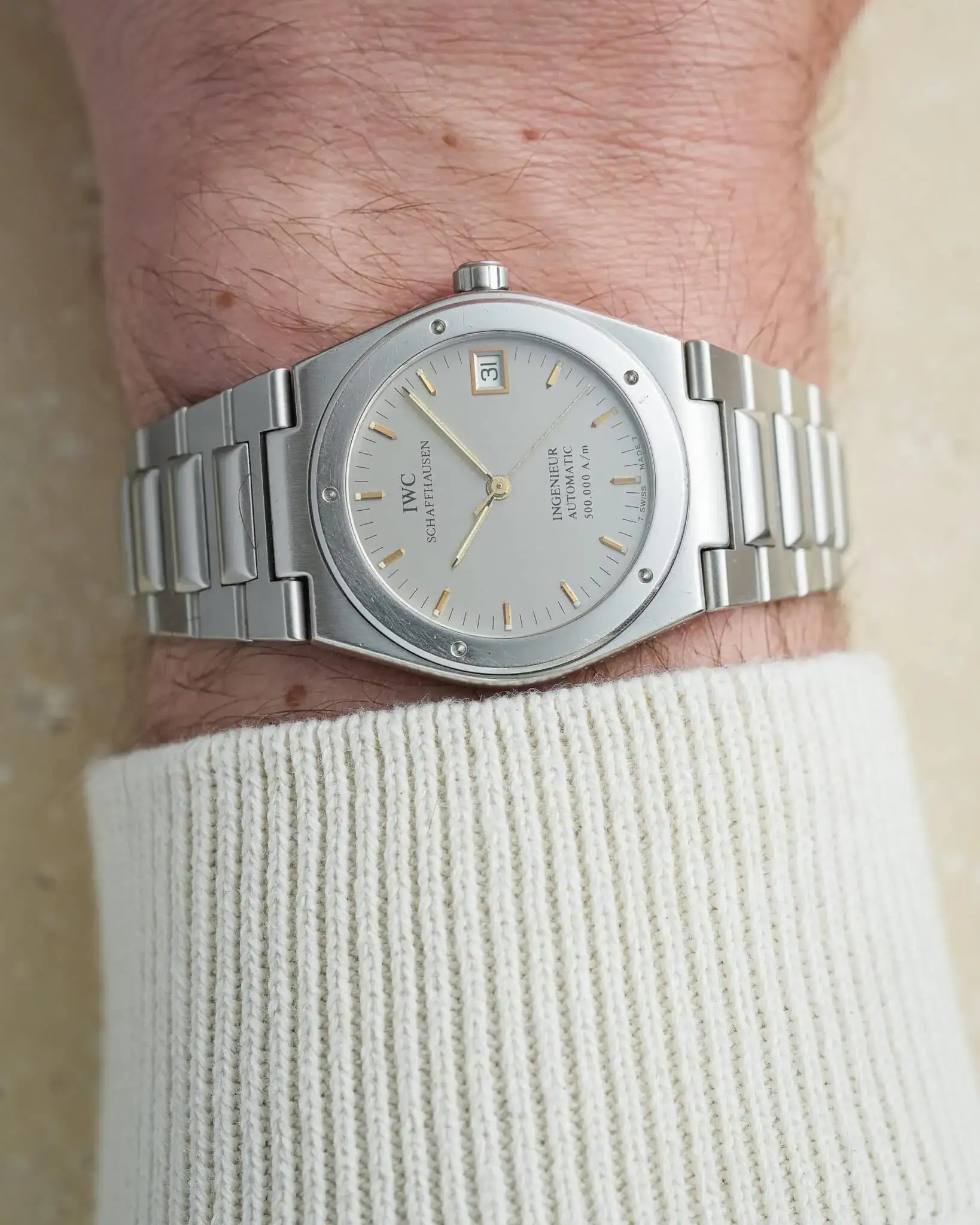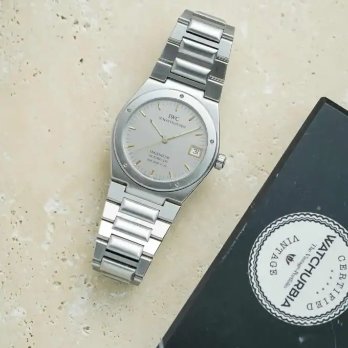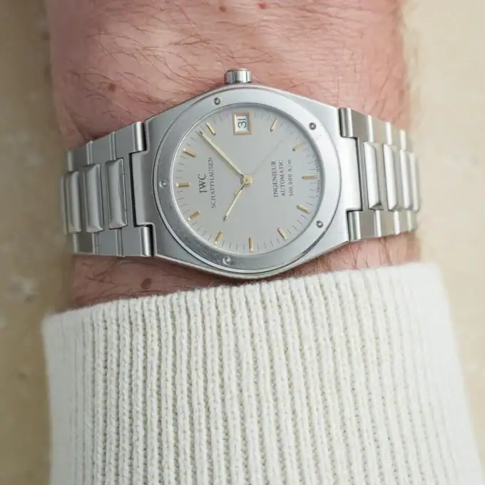 When looking for a grey or rhodium dial in the 34mm IWC Ingenieur range, there are only two options: the 3505/3506 with a matte grey graph paper dial, or the 3508. The 3508 is, in fact, the only available option with an integrated bracelet that features a straight-brushed rhodium/silver dial — and it’s rare. Most of the 955 pieces ever produced were delivered with either black or white dials.