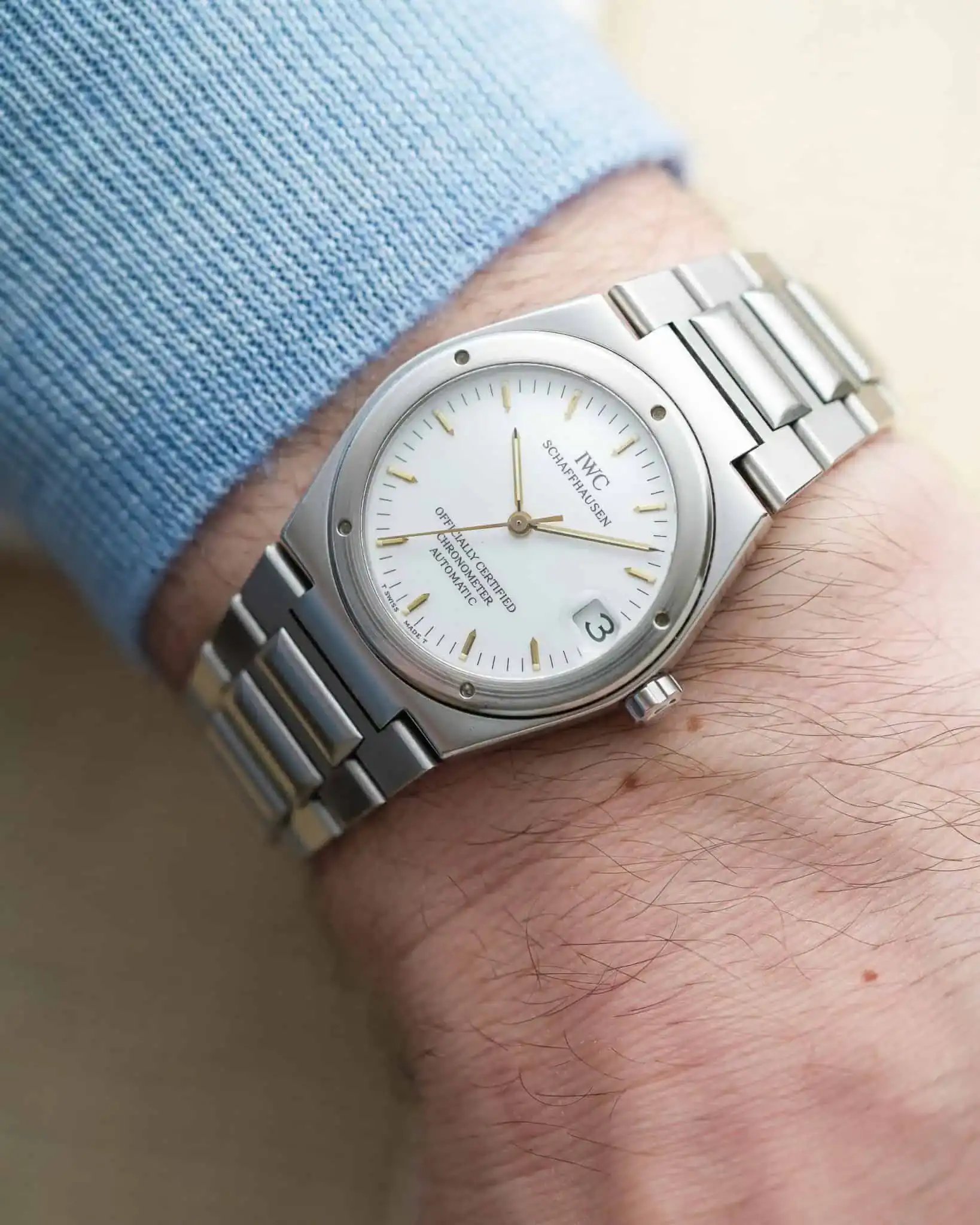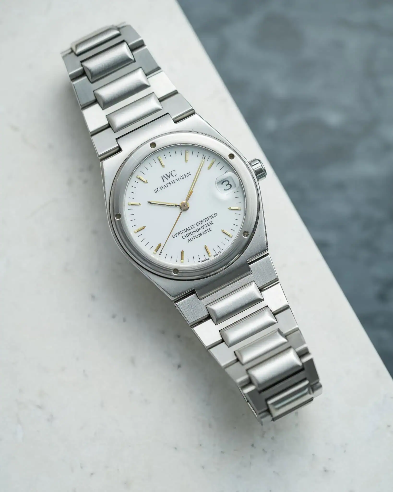 The Ref. 3521 stands out as the chronometer-certified model in the Ingenieur lineup. Powered by the refined IWC caliber 887/2—an evolution of Jaeger-LeCoultre’s legendary cal. 889—it features a solid platinum rotor and boasts an impressive anti-magnetic resistance of 80,000 A/m.
