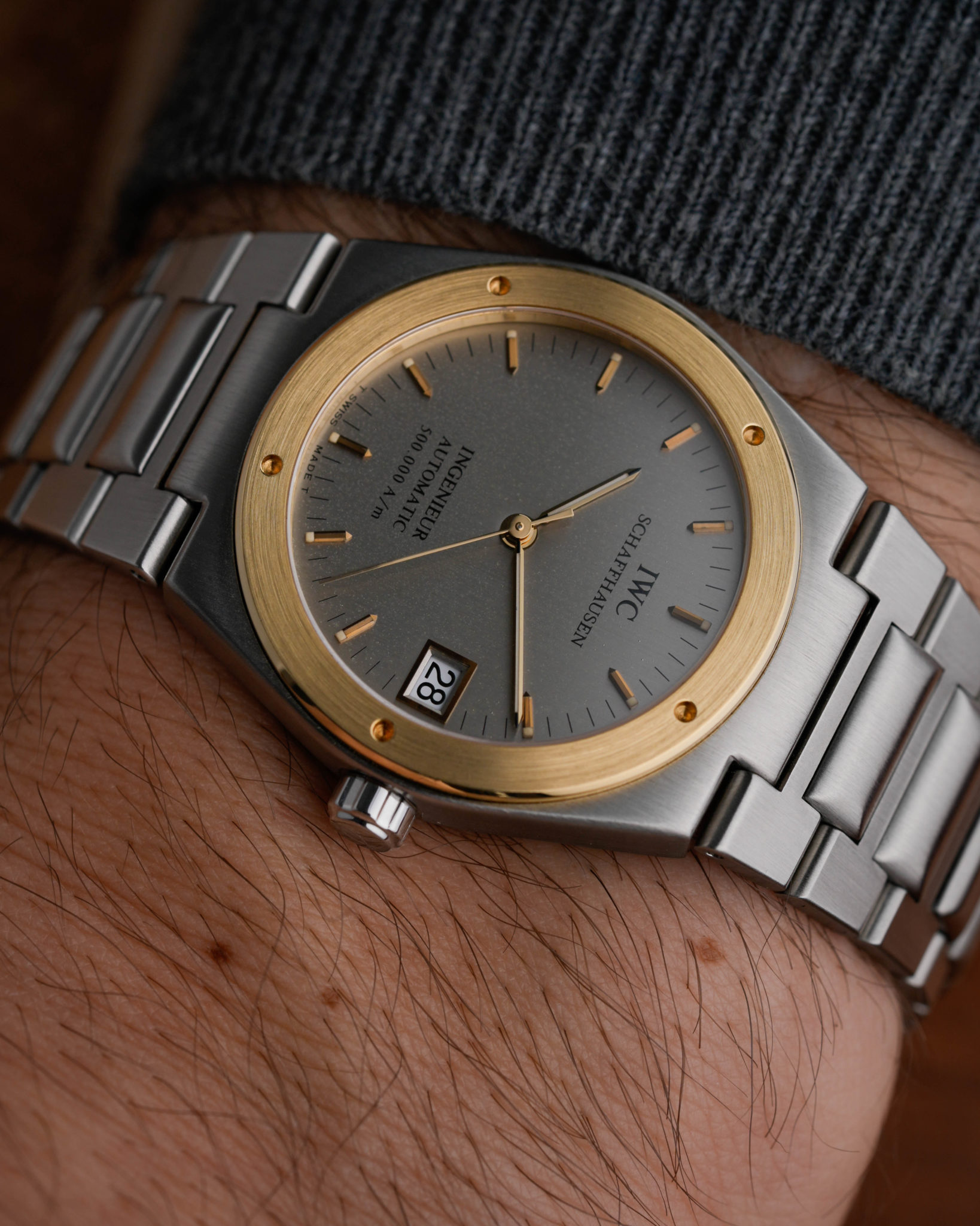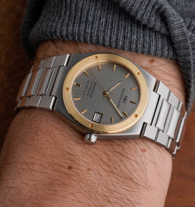 This all steel version with rhodium plated grey dial and 18K gold bezel is one of the prettiest versions of the 34mm Ingenieur series and the 3508. Only about 150 watches were delivered like this.