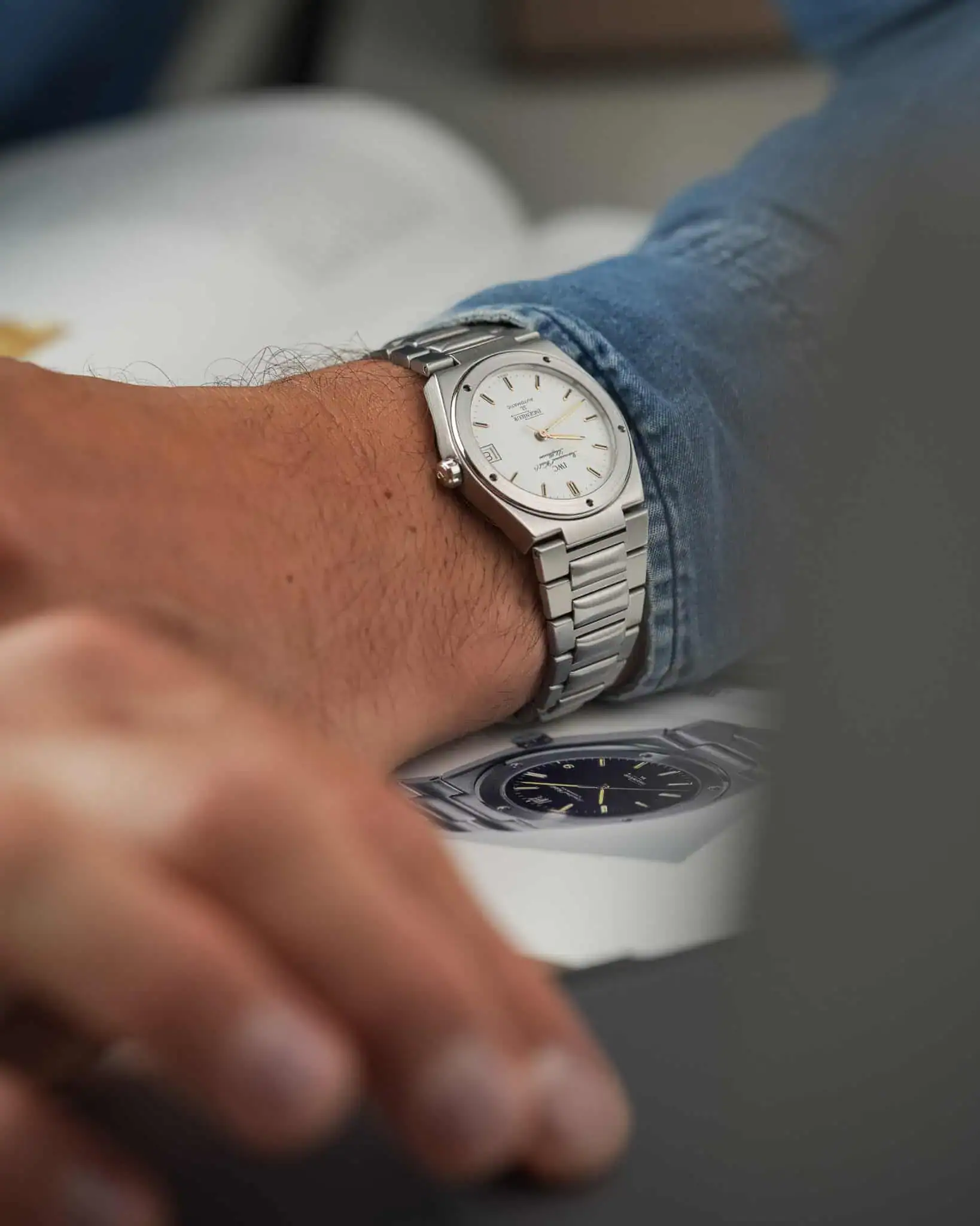 This version is still all white, while the dials of the later 3506 references have a blueish touch in the white pattern.