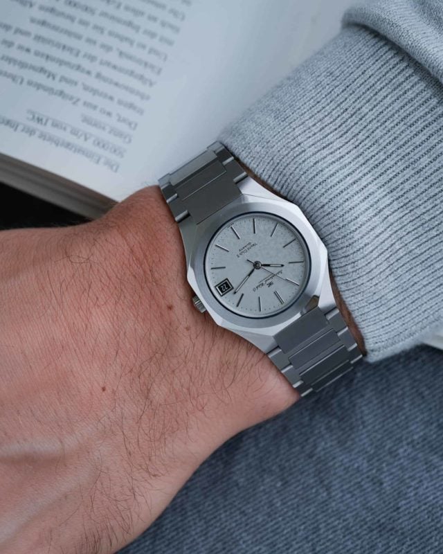 The rhodium gray dial has a unique patina. It reminds us a bit of a leo print. The black date disc emphasizes the cool character of the sporty yet luxurious design.