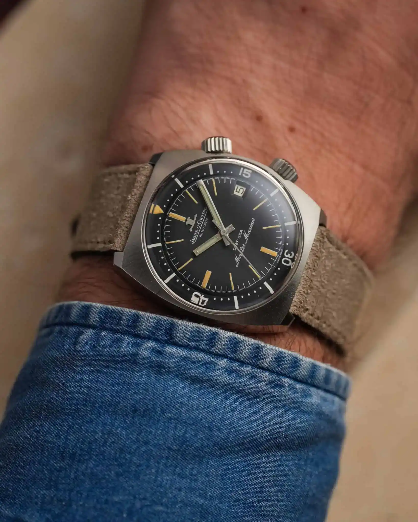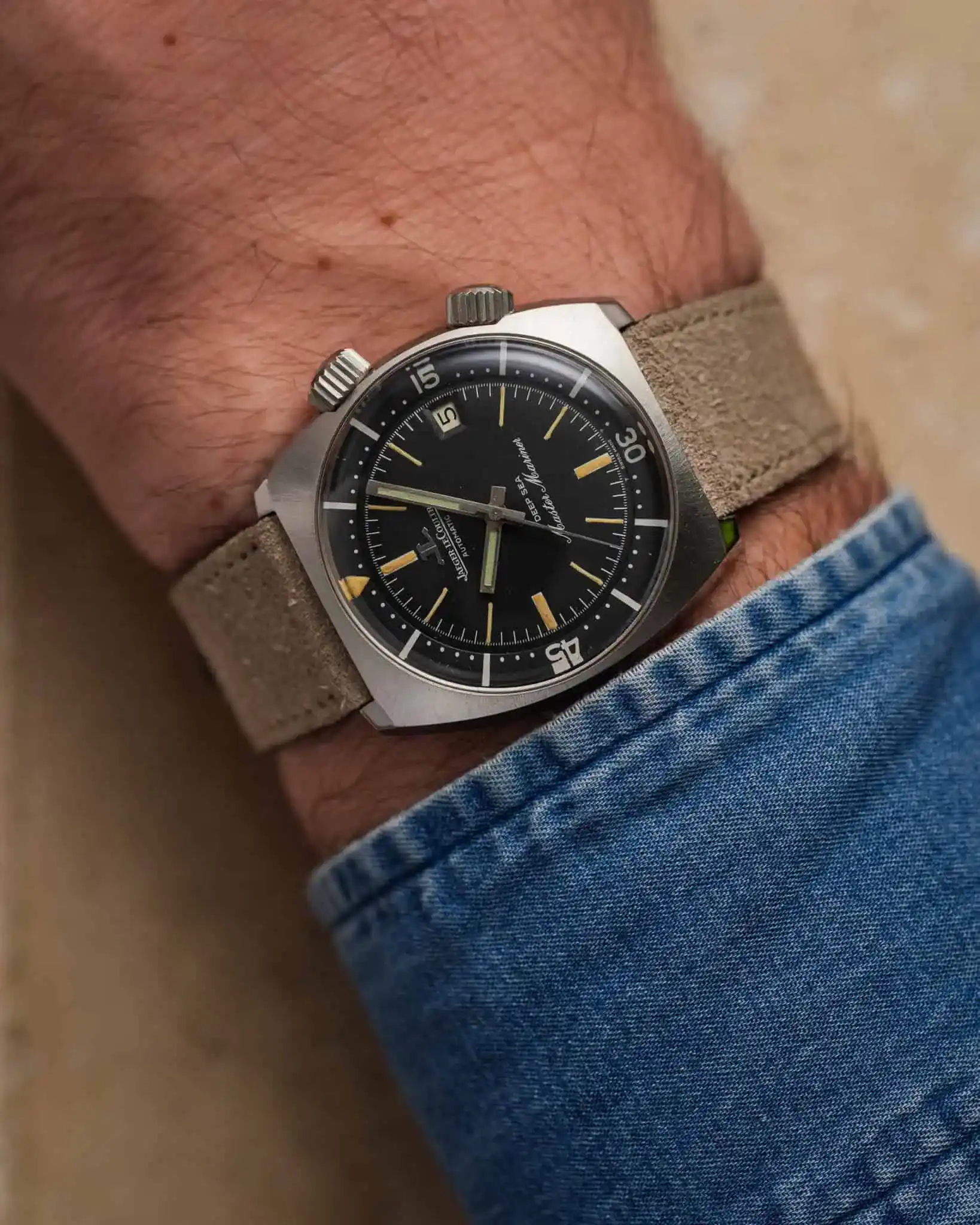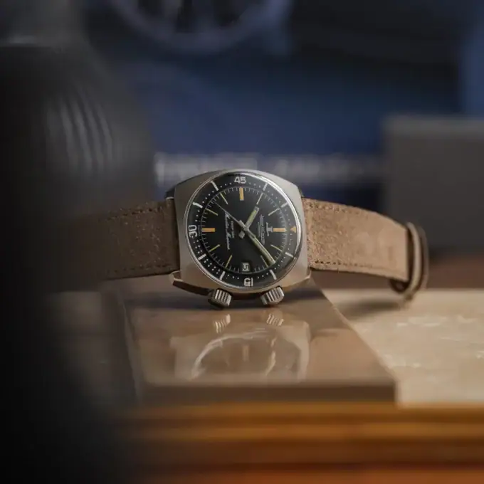 For the strap, it is paired with a hand-made suede leather band that tapers from 20 mm to a vintage-character 16 mm buckle — an understated nod to the era from which this watch came.