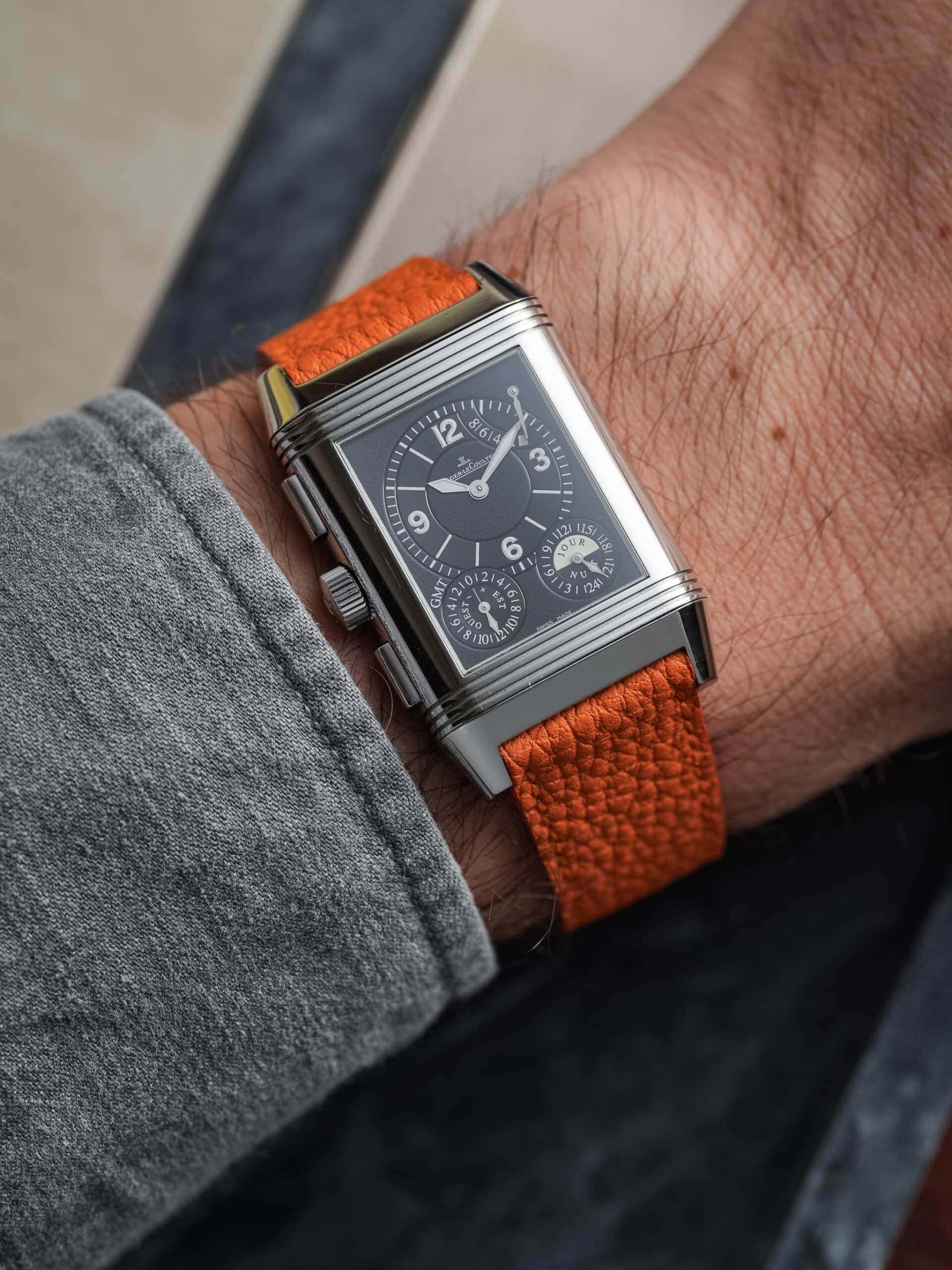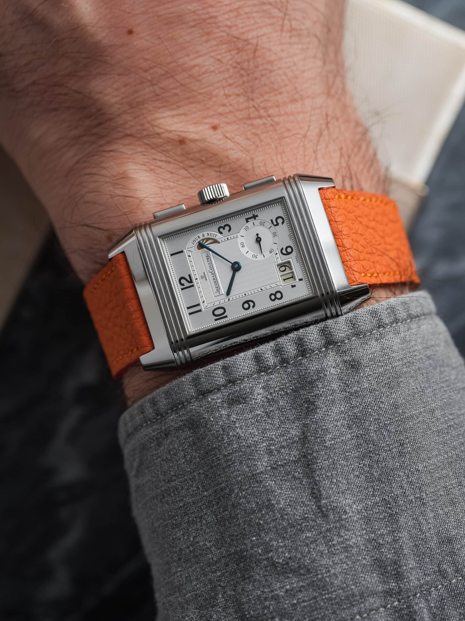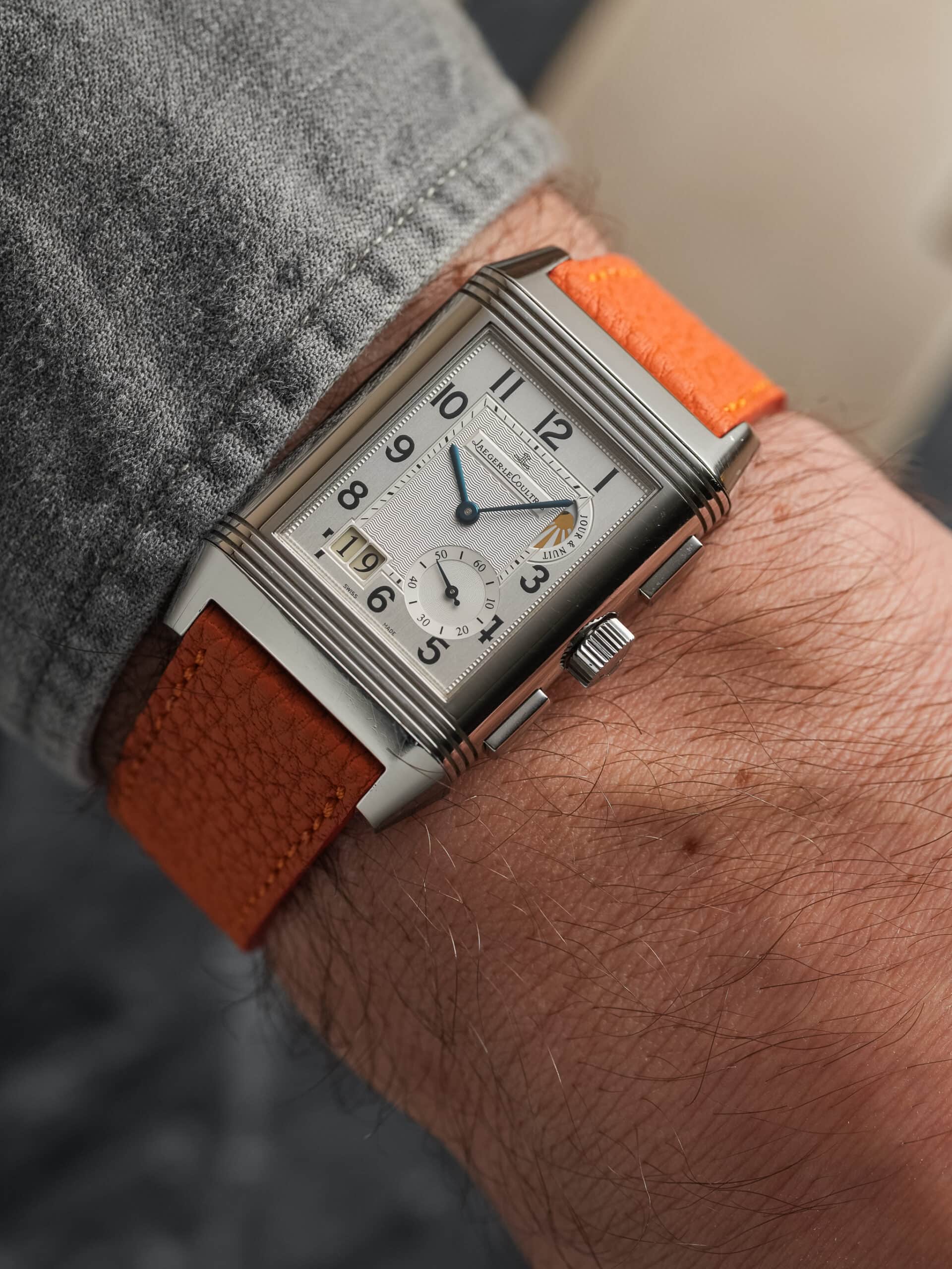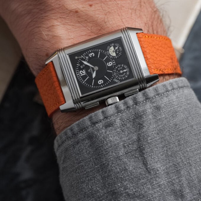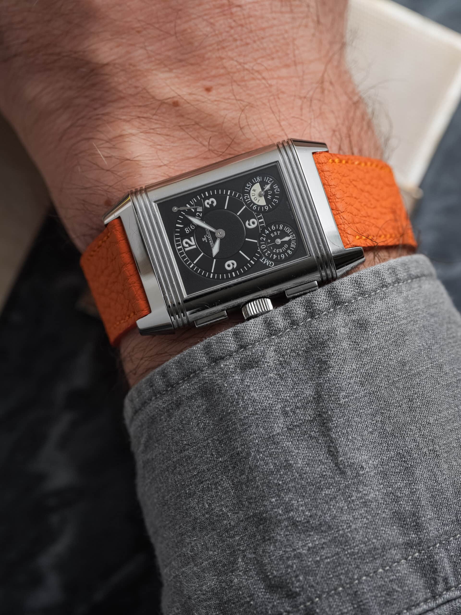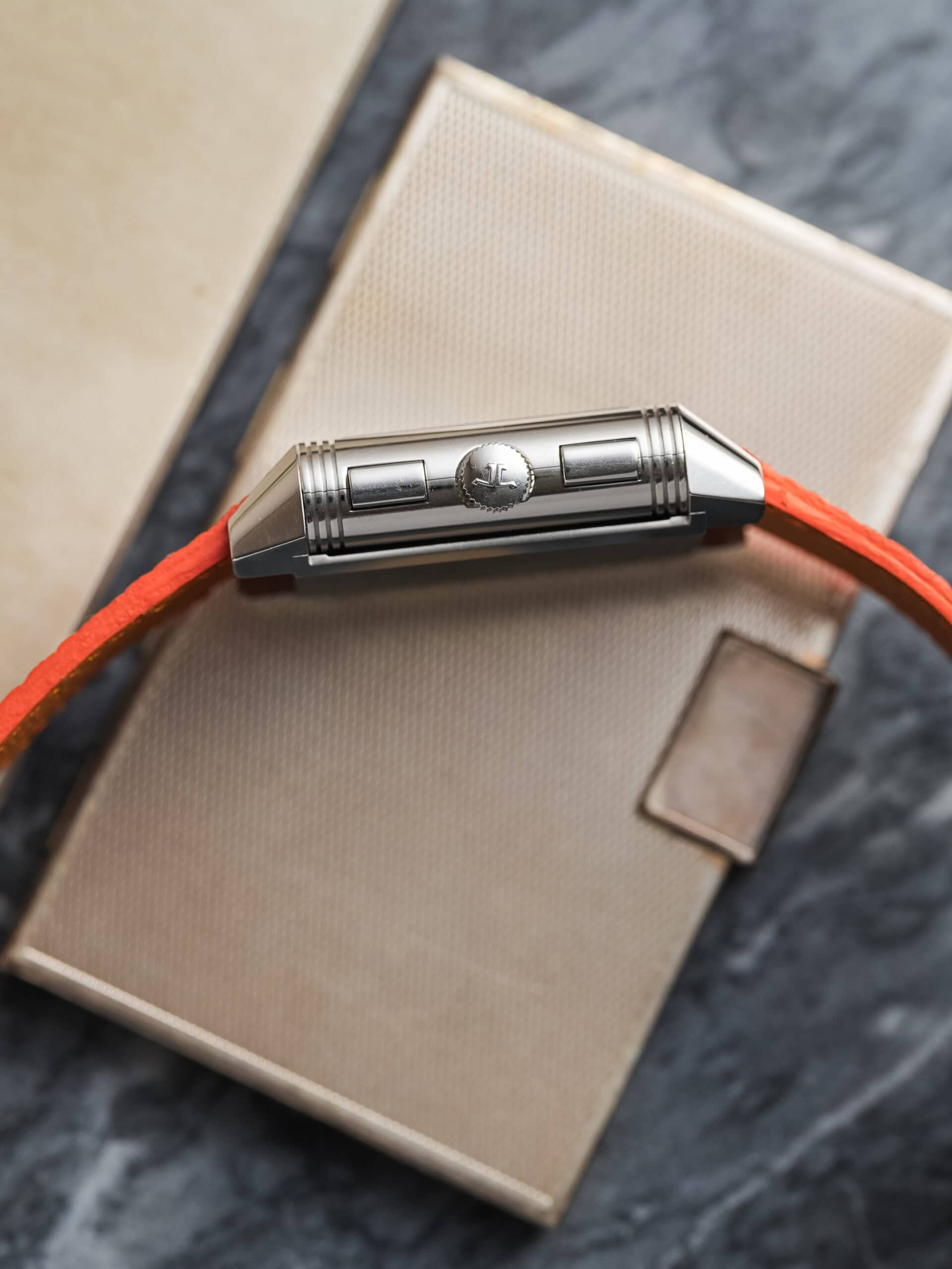 The choice of an orange strap was both easy and intentional, echoing the tones of the sun on the front dial and reinforcing the watch’s more dynamic character. It adds a contemporary edge while remaining perfectly in harmony with the Reverso’s architectural lines.