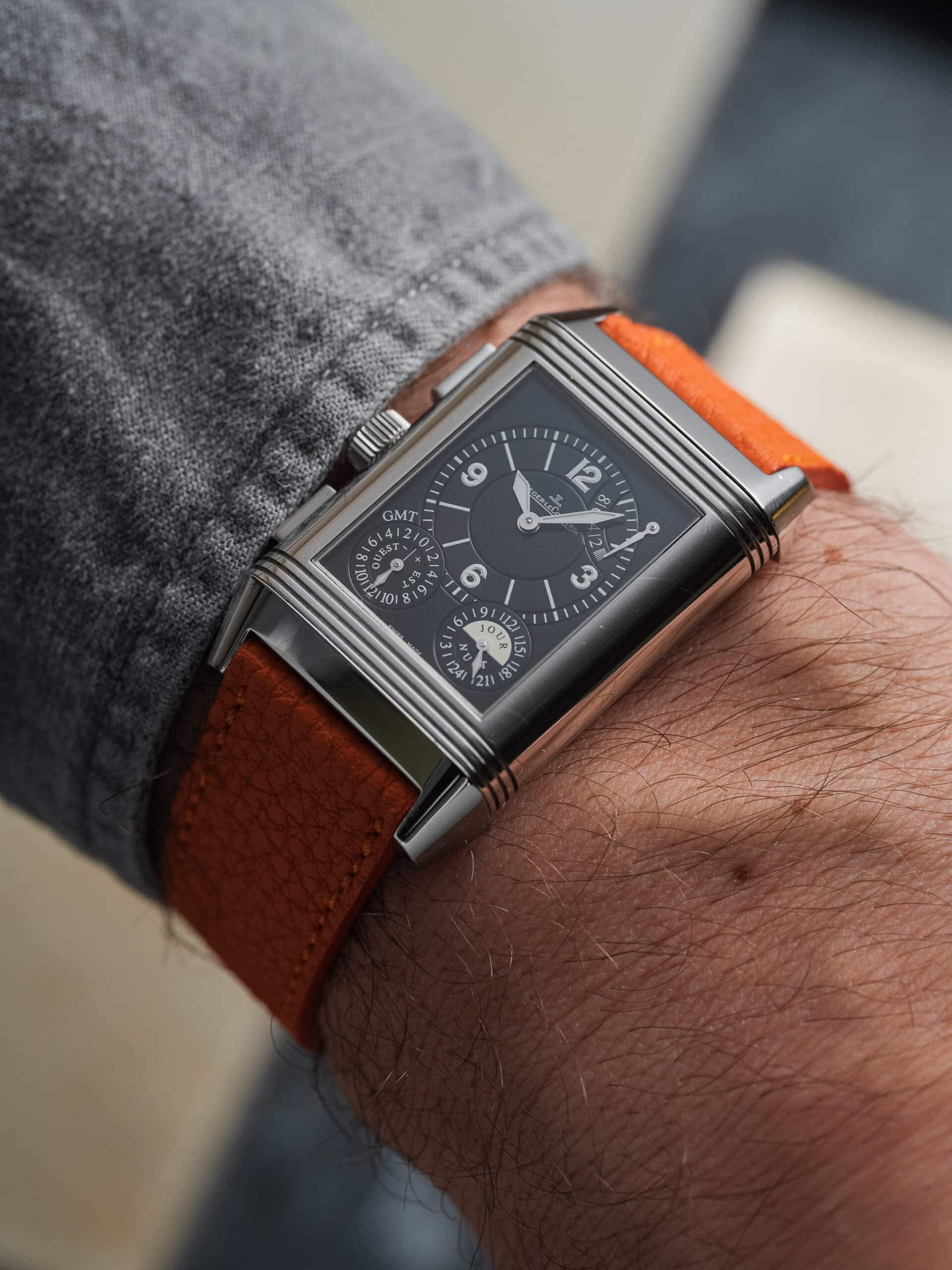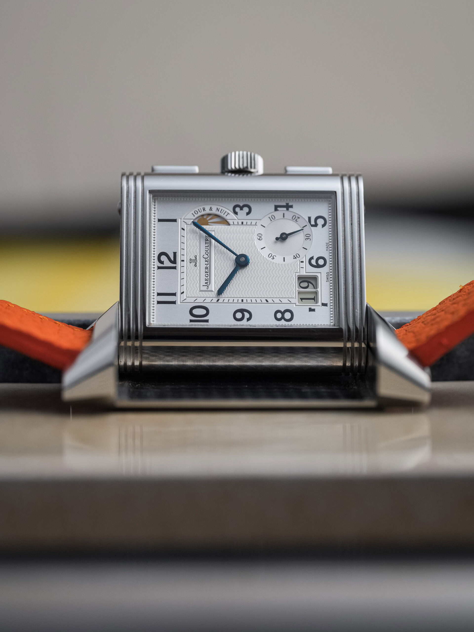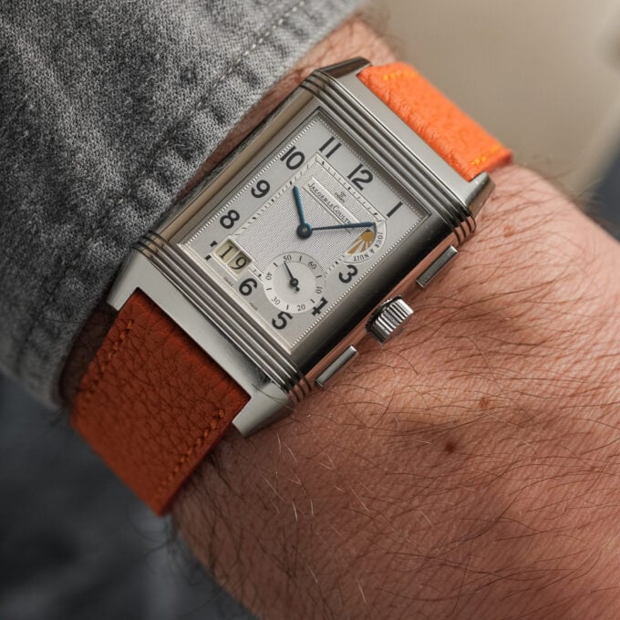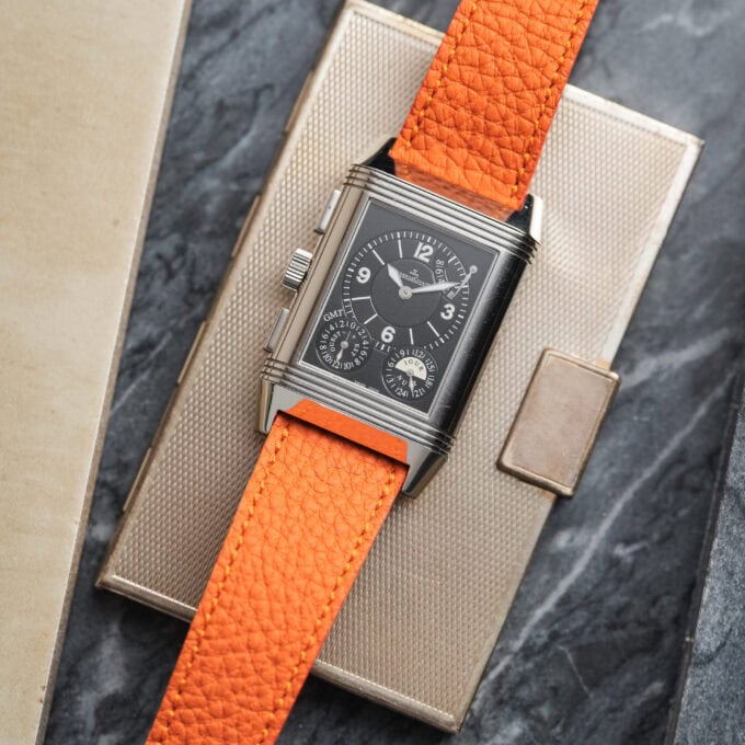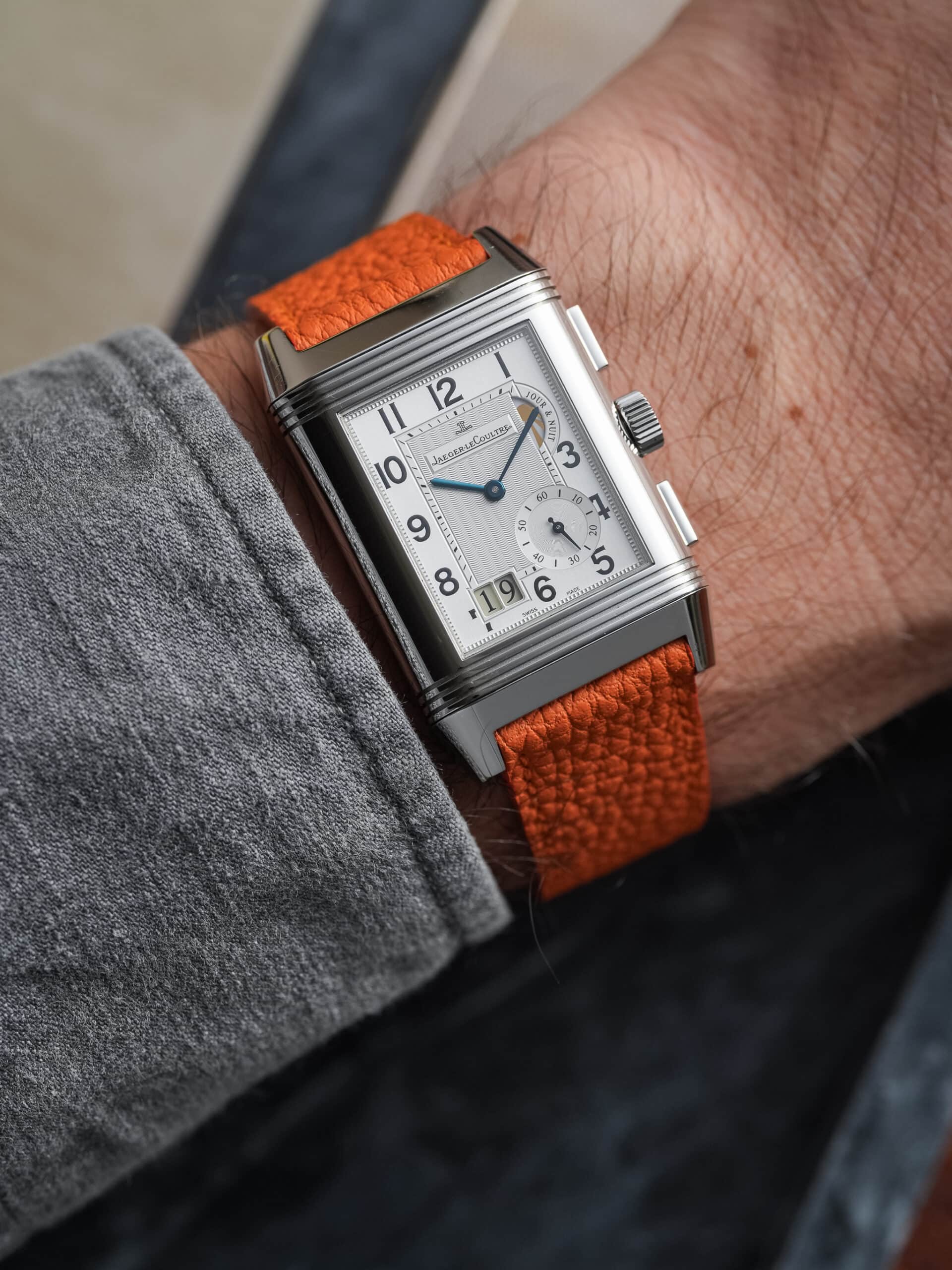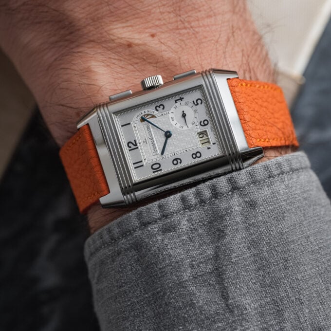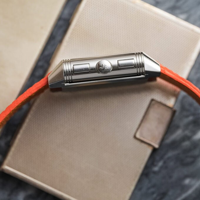 The choice of an orange strap was both easy and intentional, echoing the tones of the sun on the front dial and reinforcing the watch’s more dynamic character. It adds a contemporary edge while remaining perfectly in harmony with the Reverso’s architectural lines.