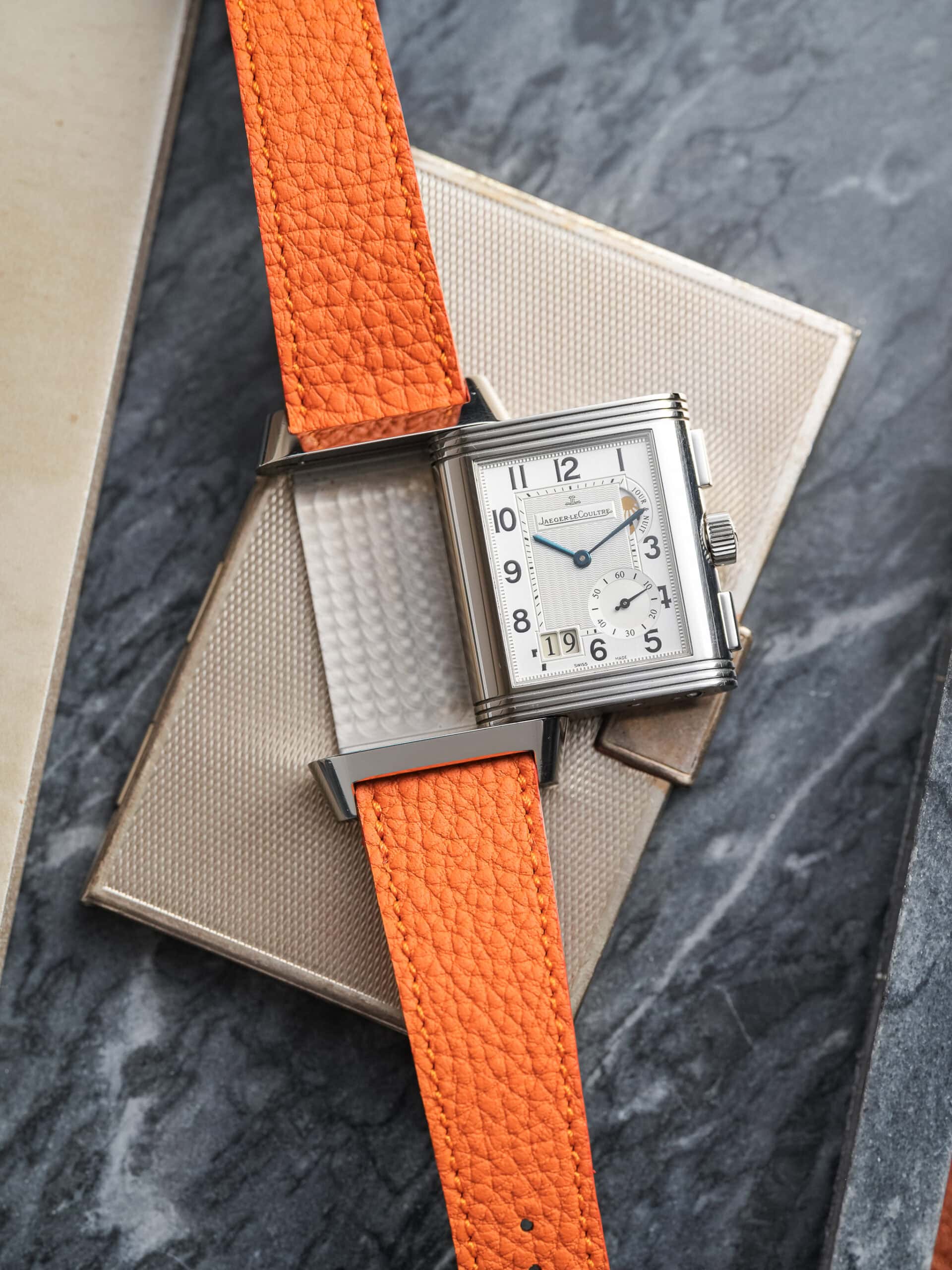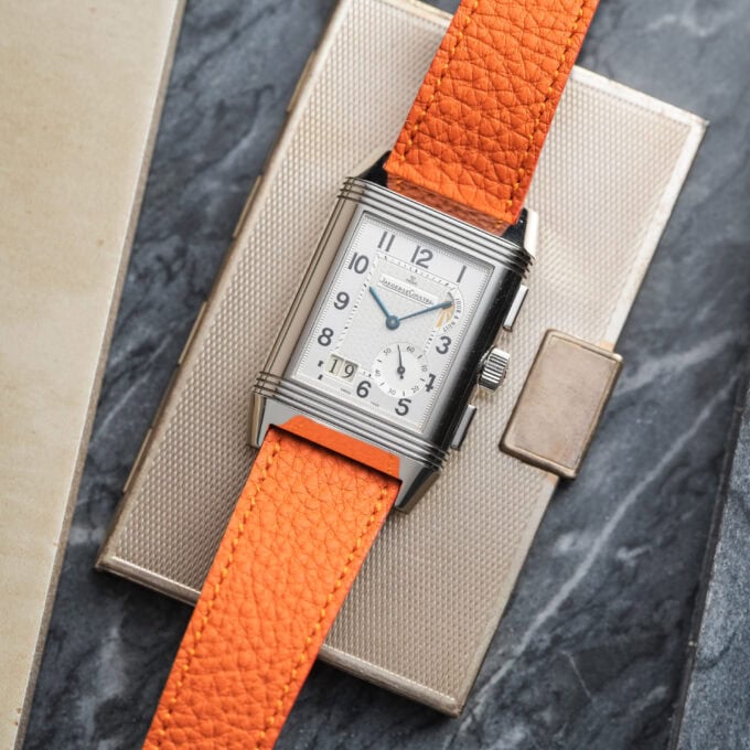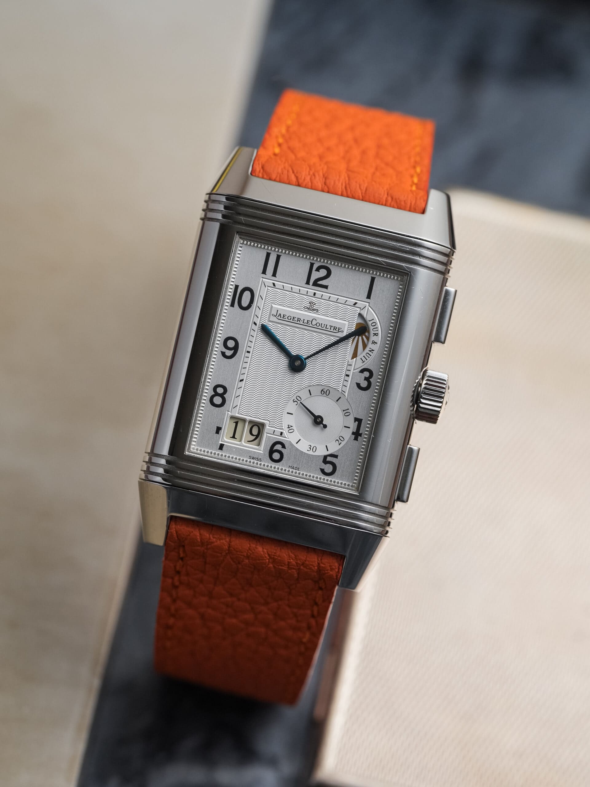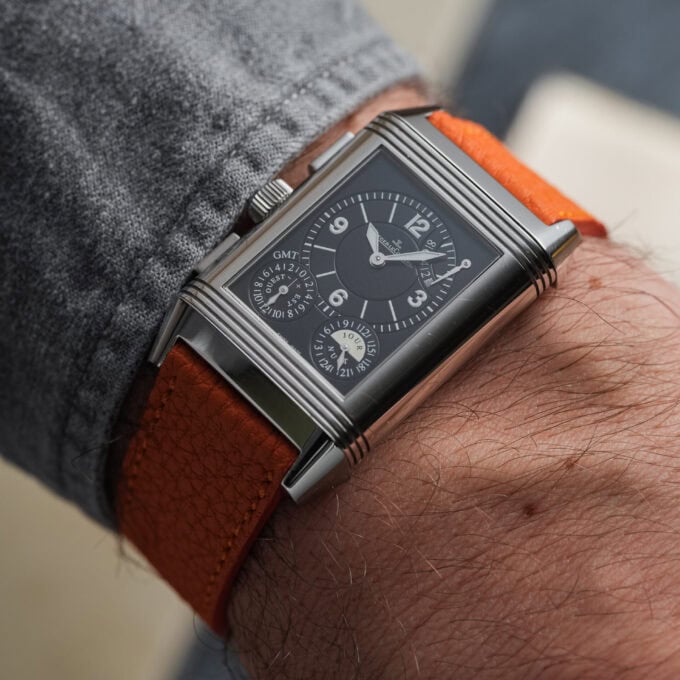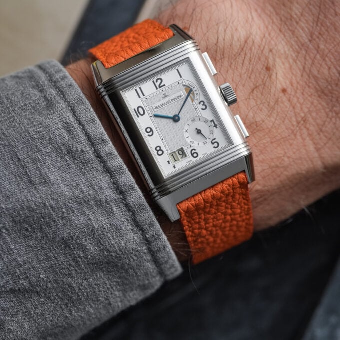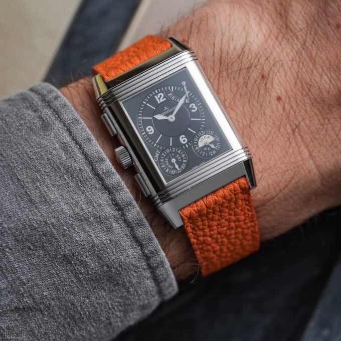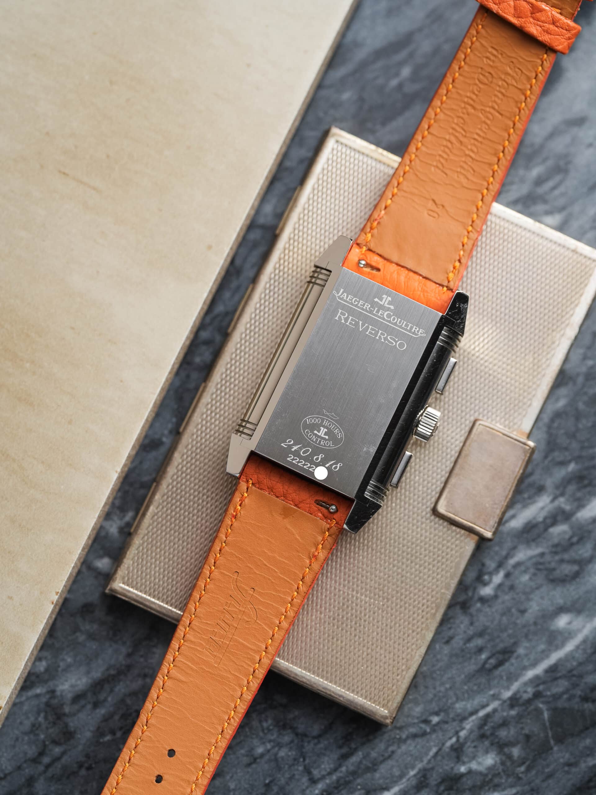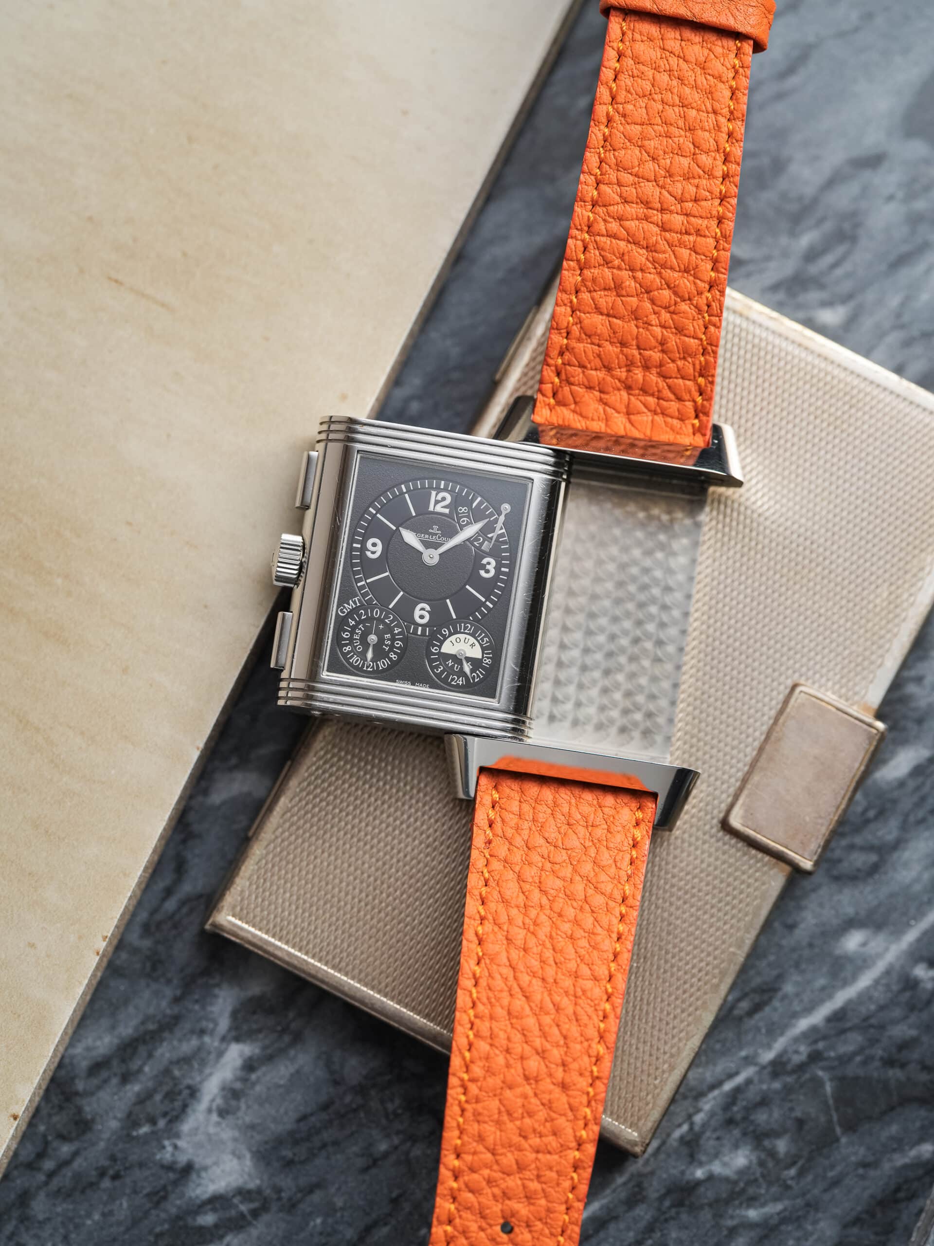 The choice of an orange strap was both easy and intentional, echoing the tones of the sun on the front dial and reinforcing the watch’s more dynamic character. It adds a contemporary edge while remaining perfectly in harmony with the Reverso’s architectural lines.