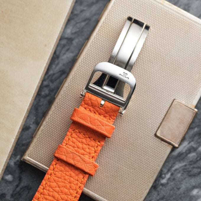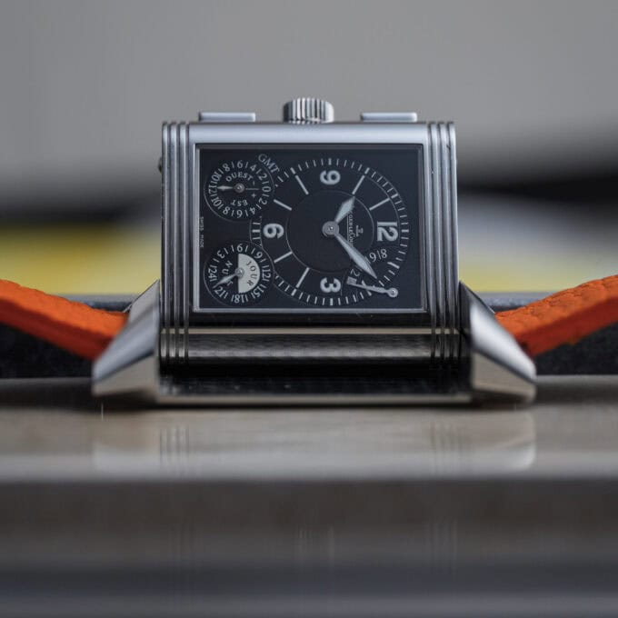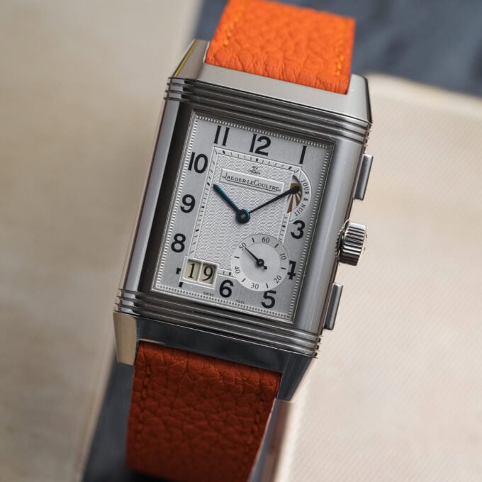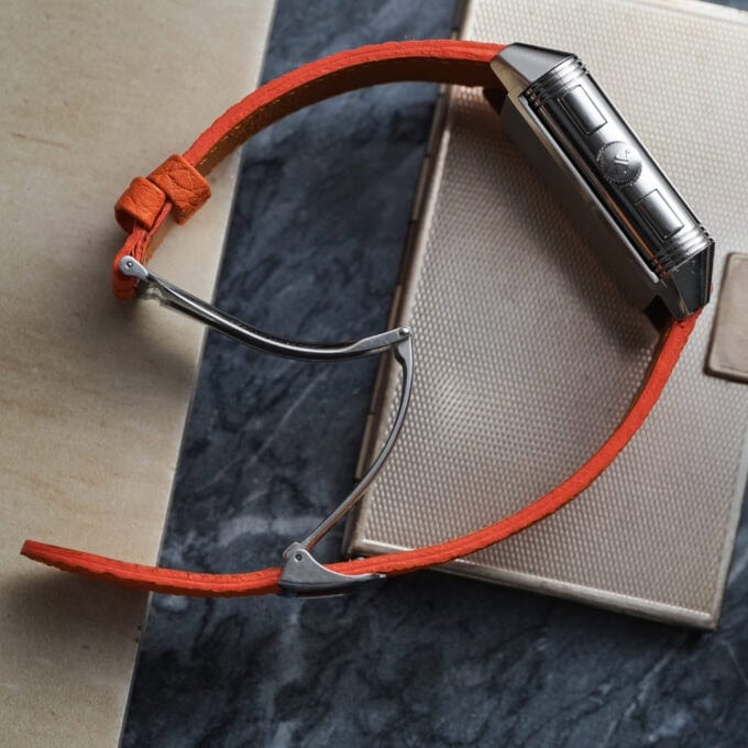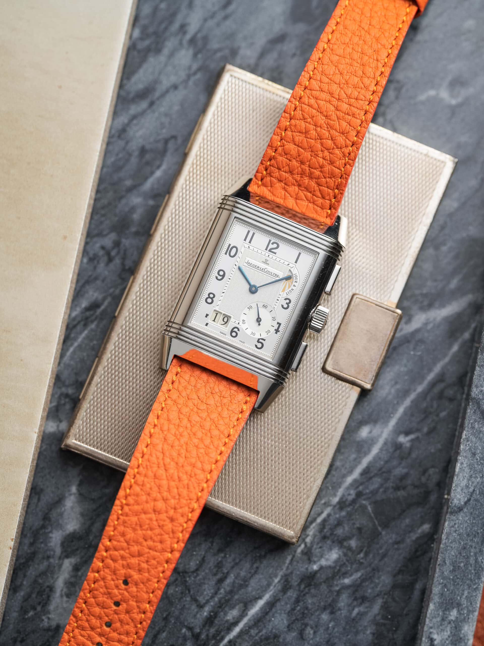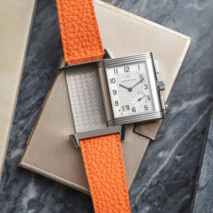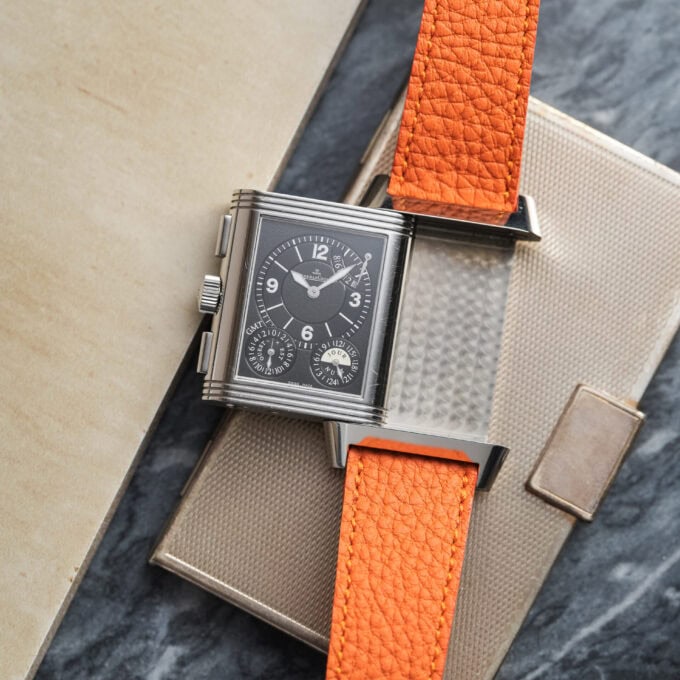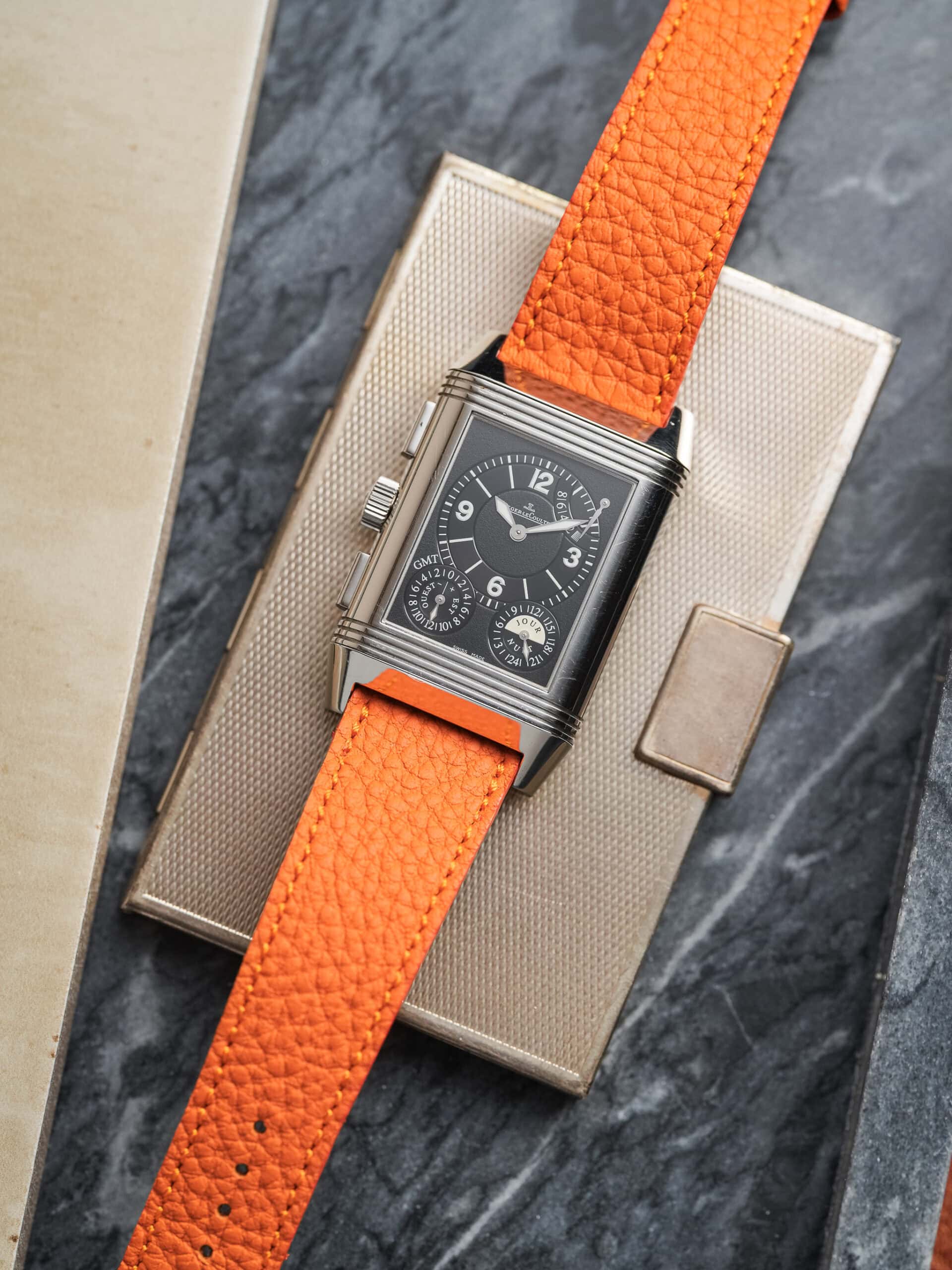 The choice of an orange strap was both easy and intentional, echoing the tones of the sun on the front dial and reinforcing the watch’s more dynamic character. It adds a contemporary edge while remaining perfectly in harmony with the Reverso’s architectural lines.