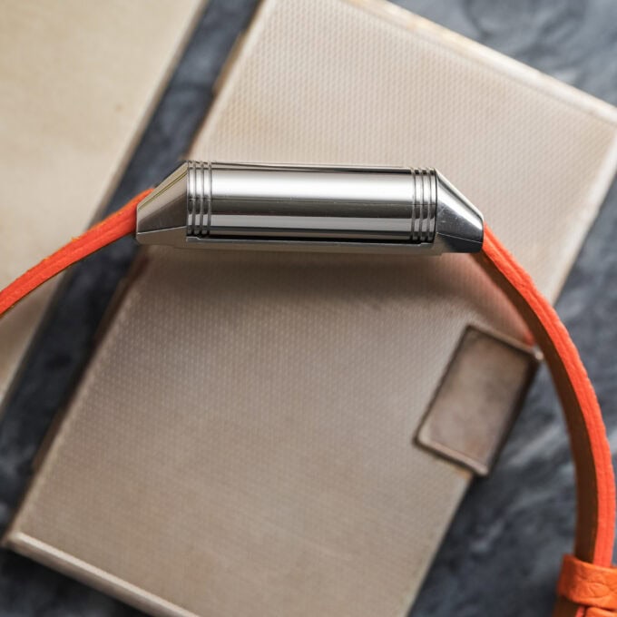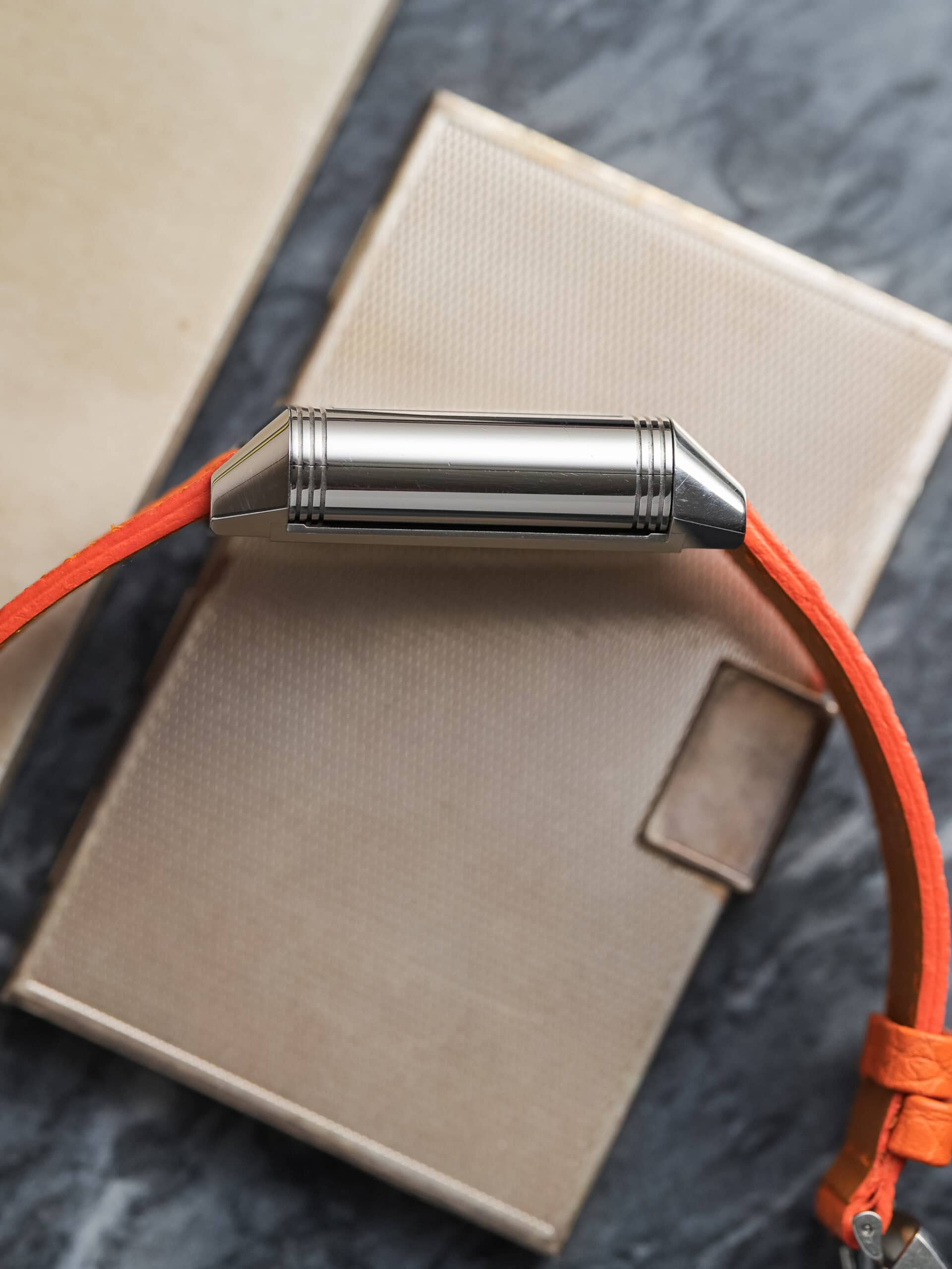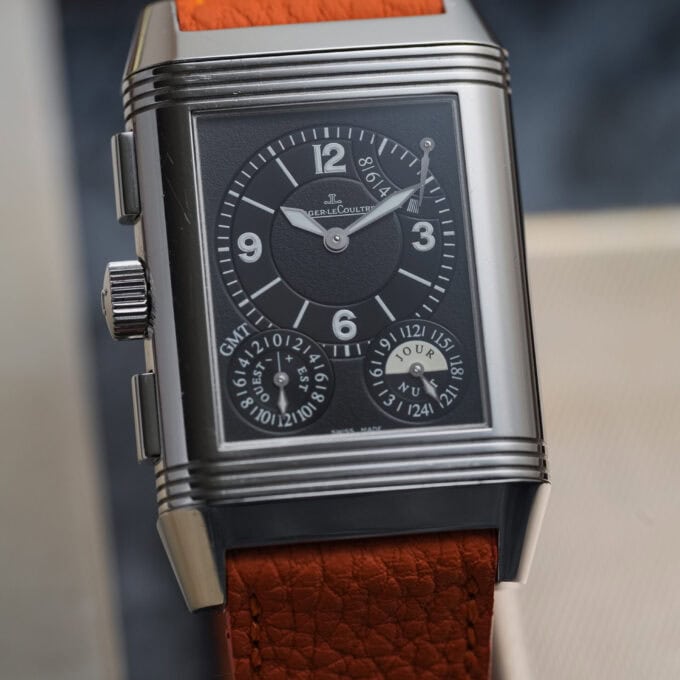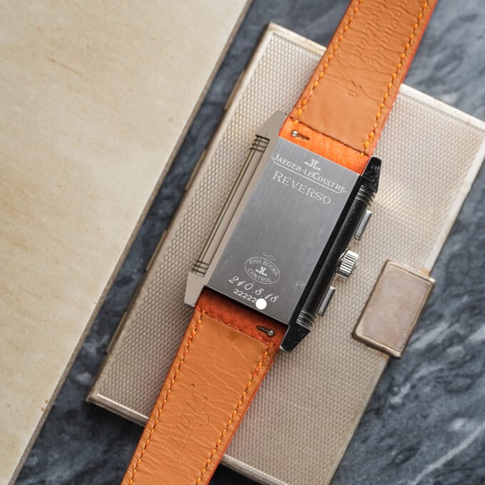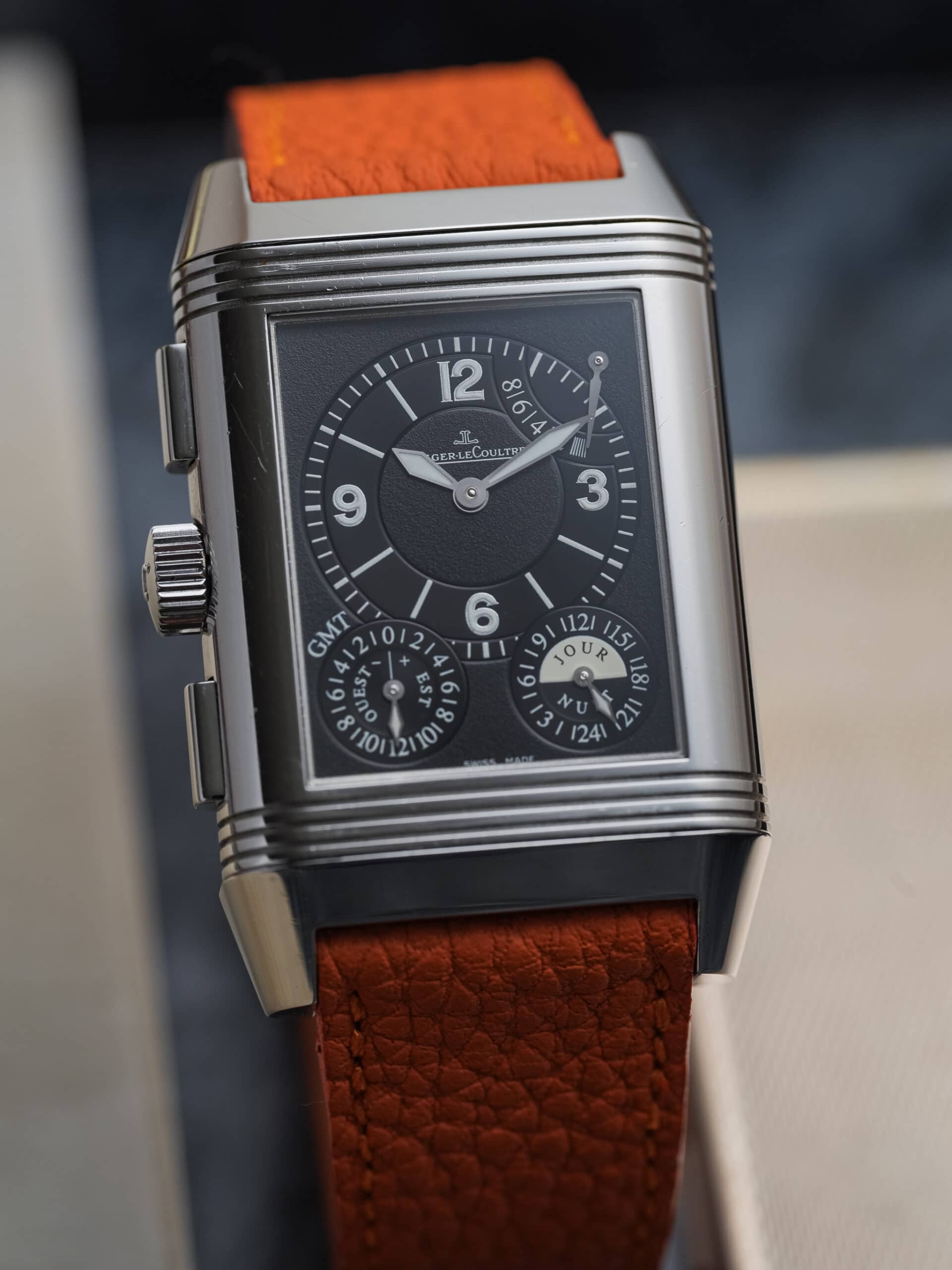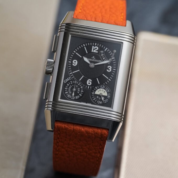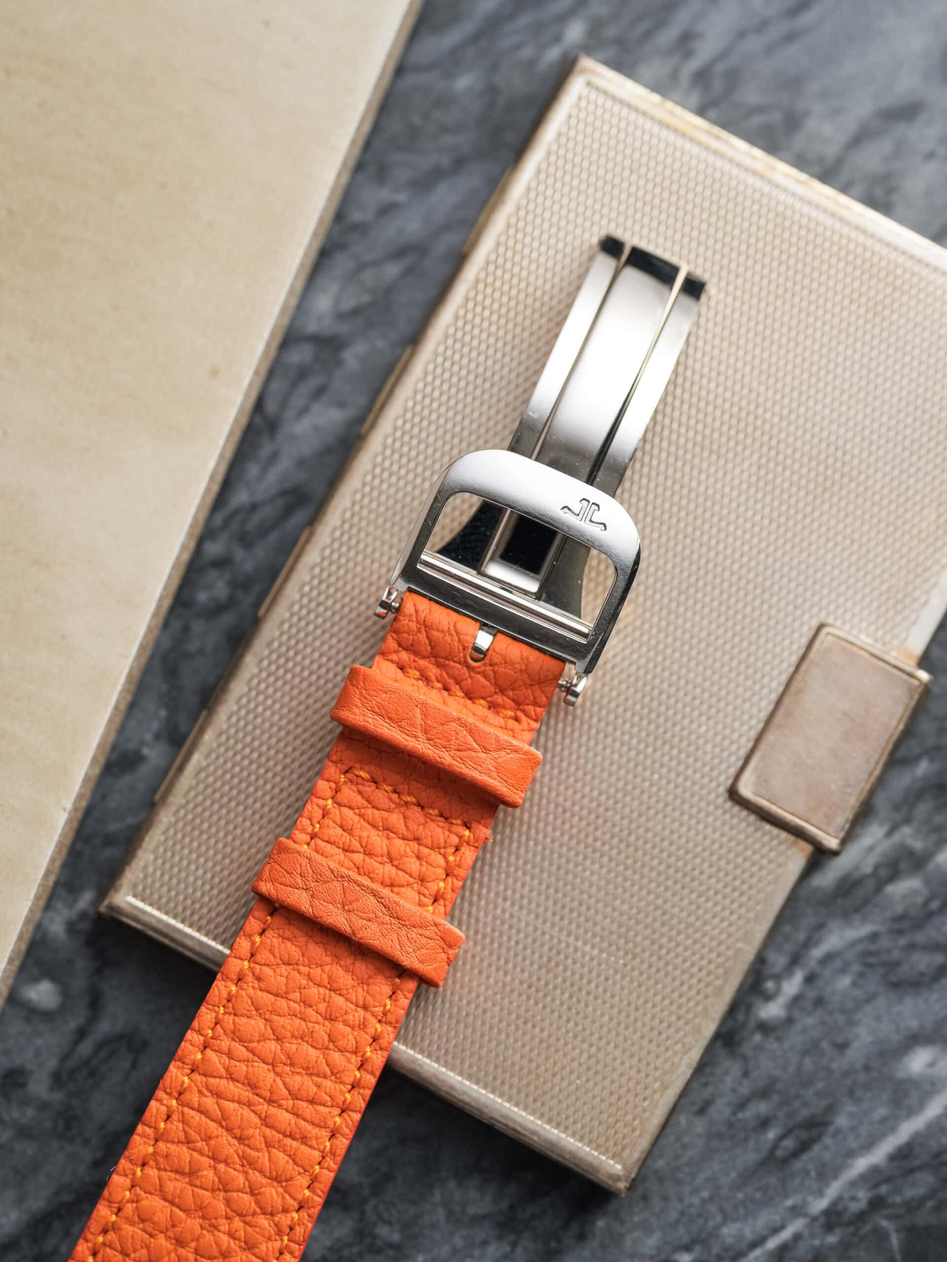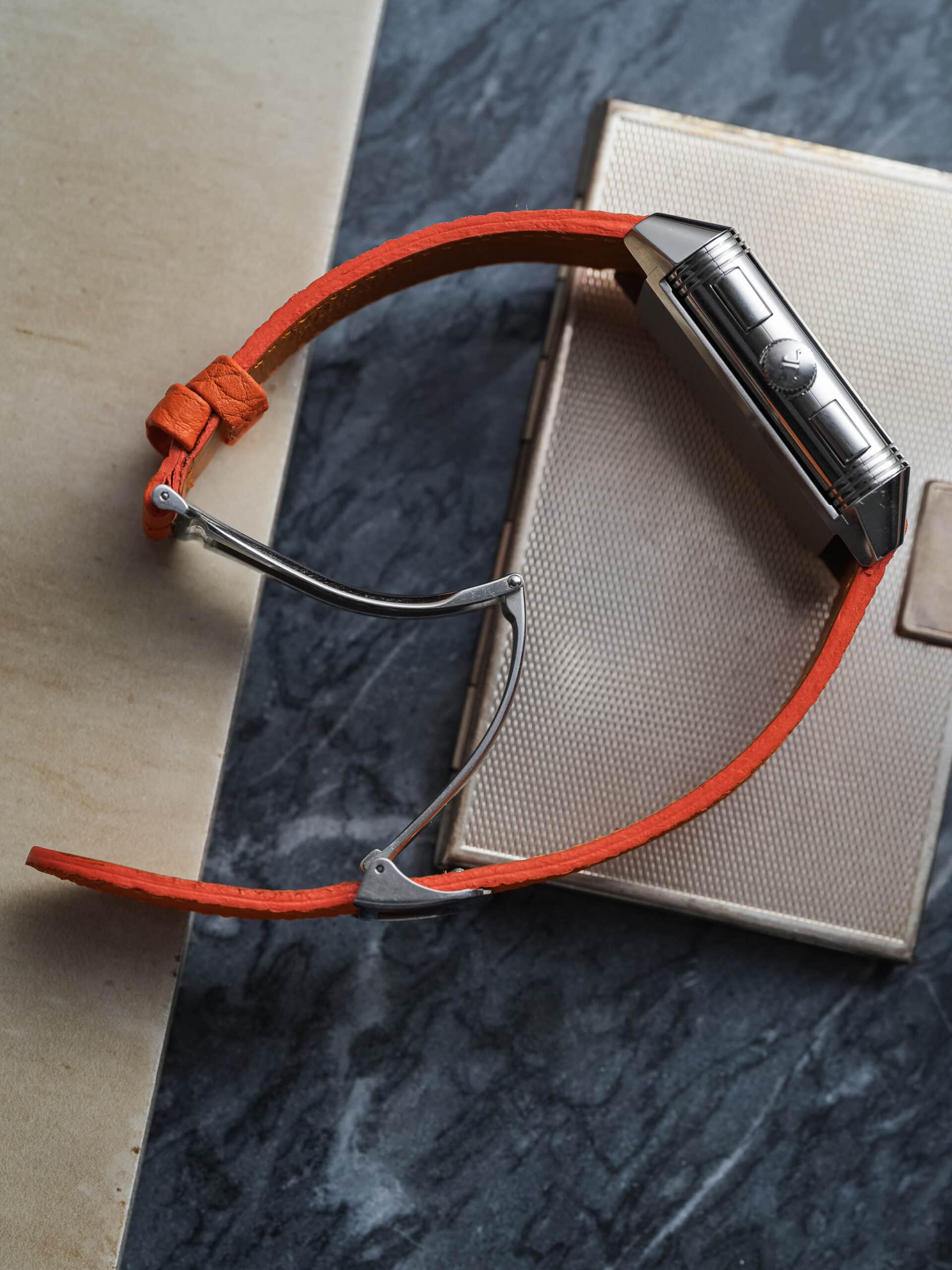 The choice of an orange strap was both easy and intentional, echoing the tones of the sun on the front dial and reinforcing the watch’s more dynamic character. It adds a contemporary edge while remaining perfectly in harmony with the Reverso’s architectural lines.