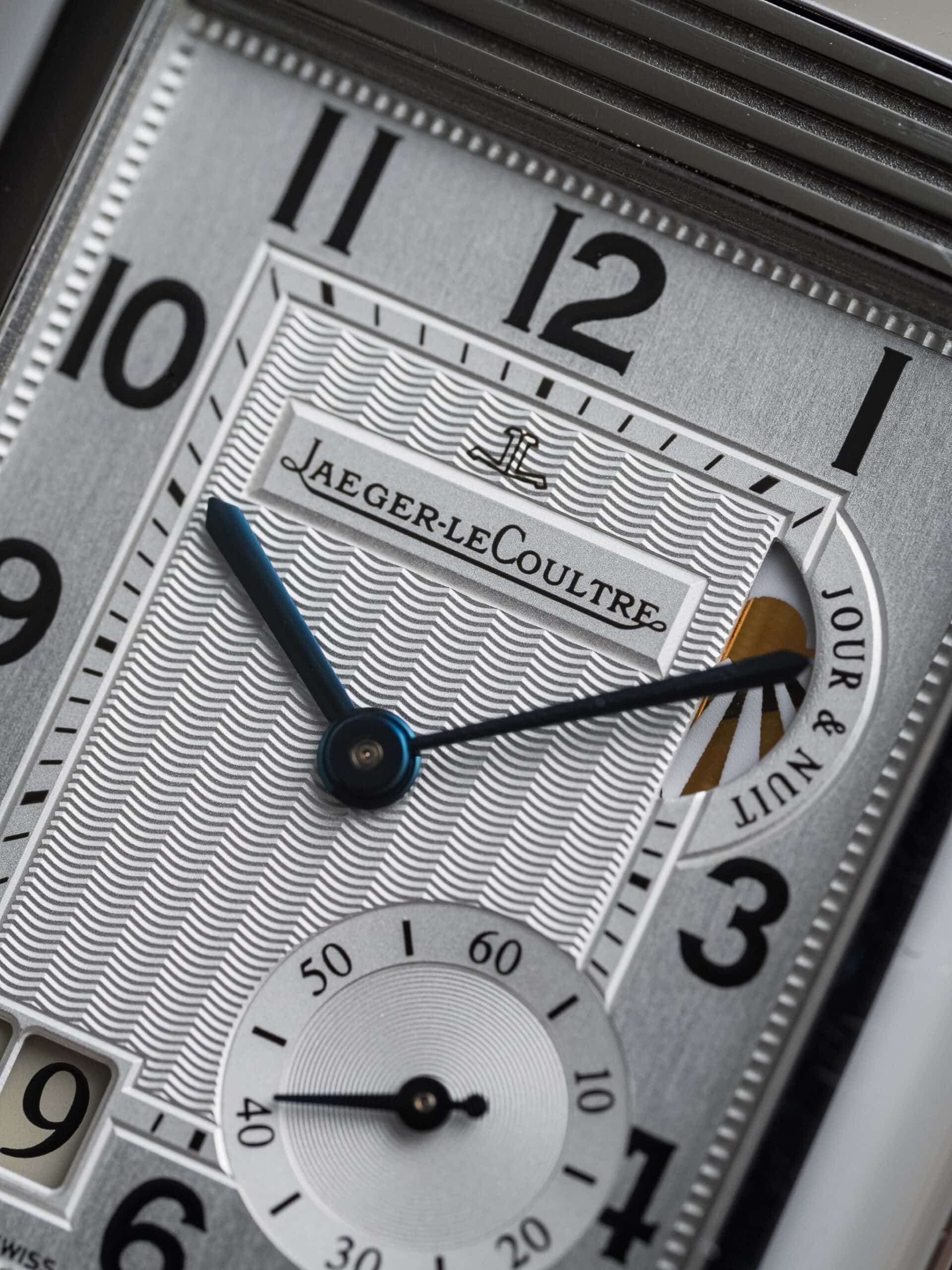 Flip the case to reveal the black reverse dial, where the watch adopts a more technical personality. Here you’ll find the GMT function with clear + / – hour indication, an impressive 8-day power reserve indicator, and a day/night display rendered in black and white for maximum legibility. Purposeful, graphic, and highly functional, this side underlines the Reverso’s suitability as a true travel companion.