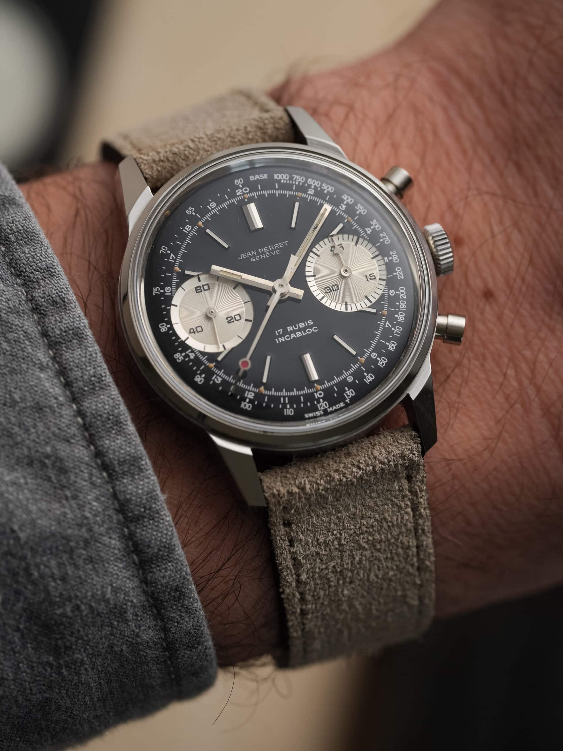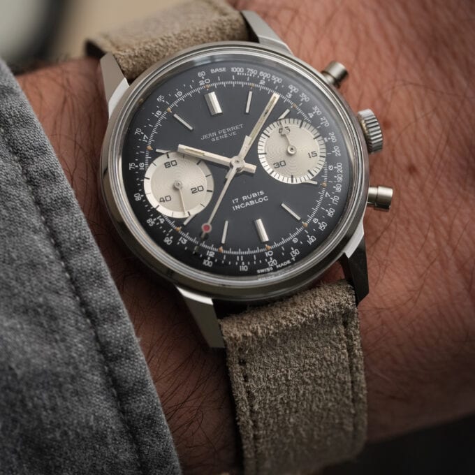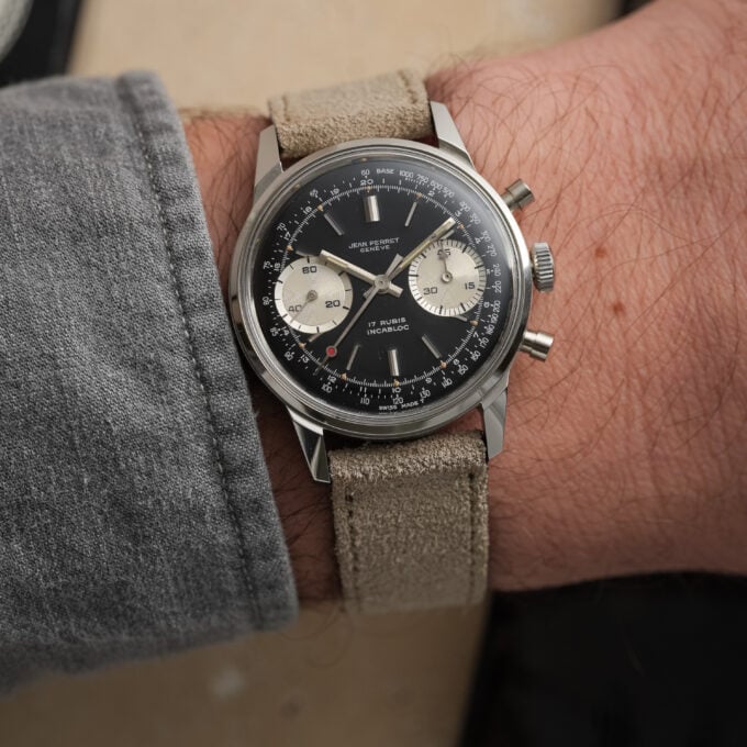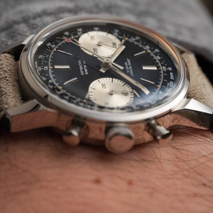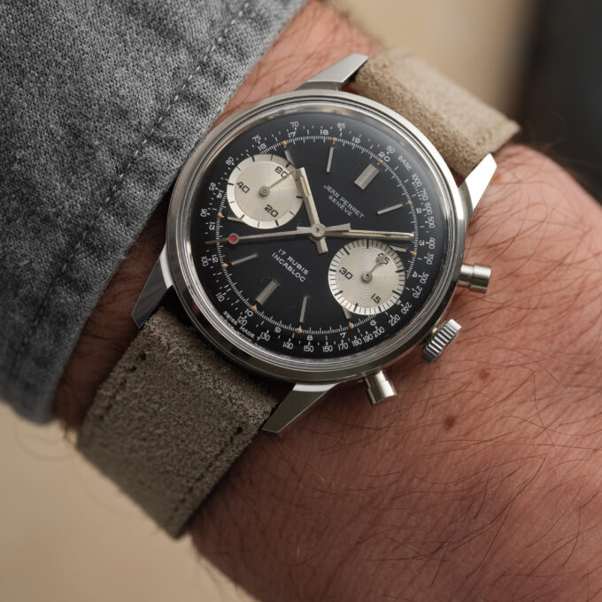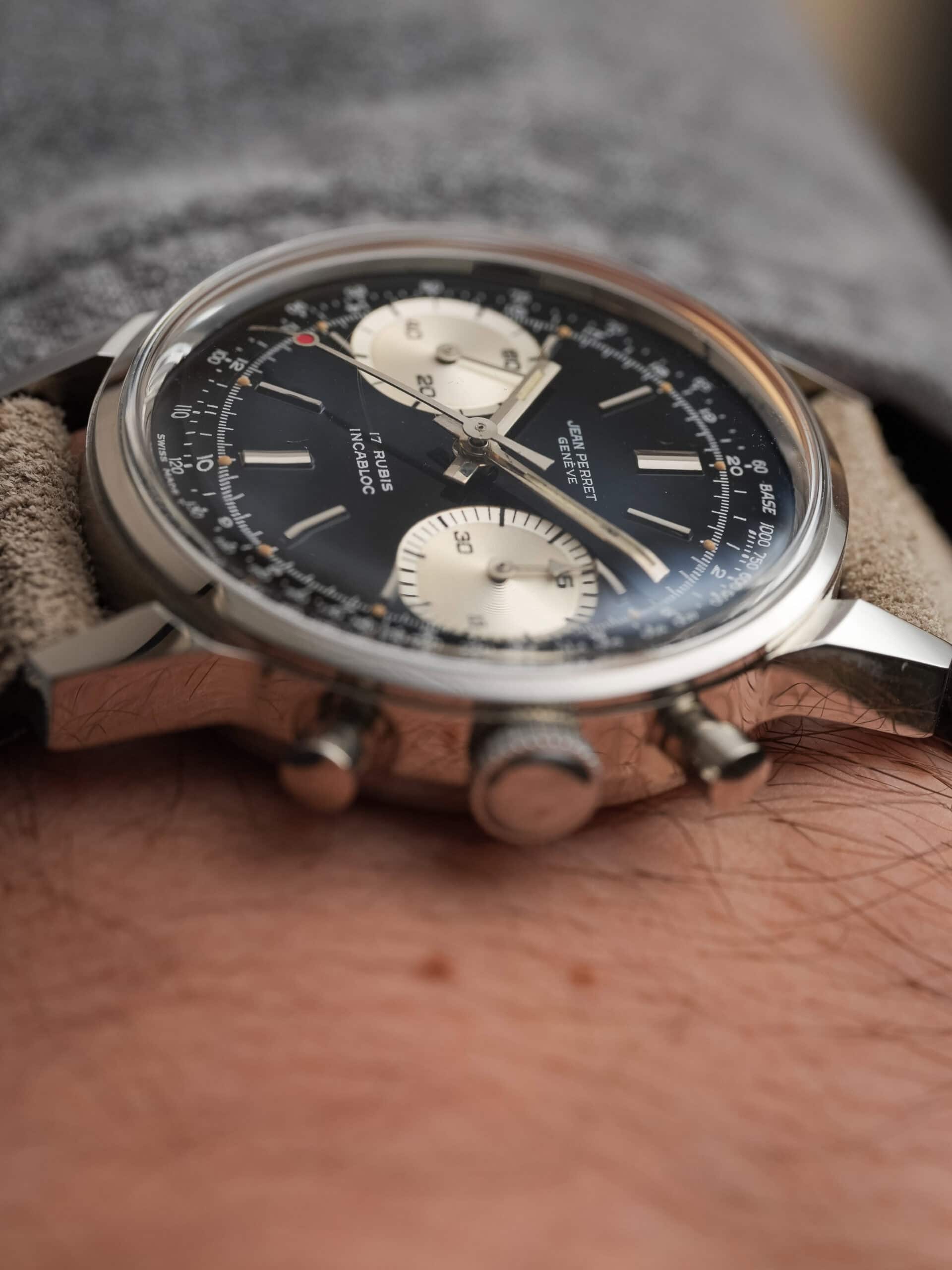 A very attractive vintage chronograph with classic proportions and a striking reverse panda configuration. This Jean-Perret is powered by the reliable Valjoux 7730 and housed in a beautiful and well-proportioned 36 mm Borgel-style case with pump pushers.