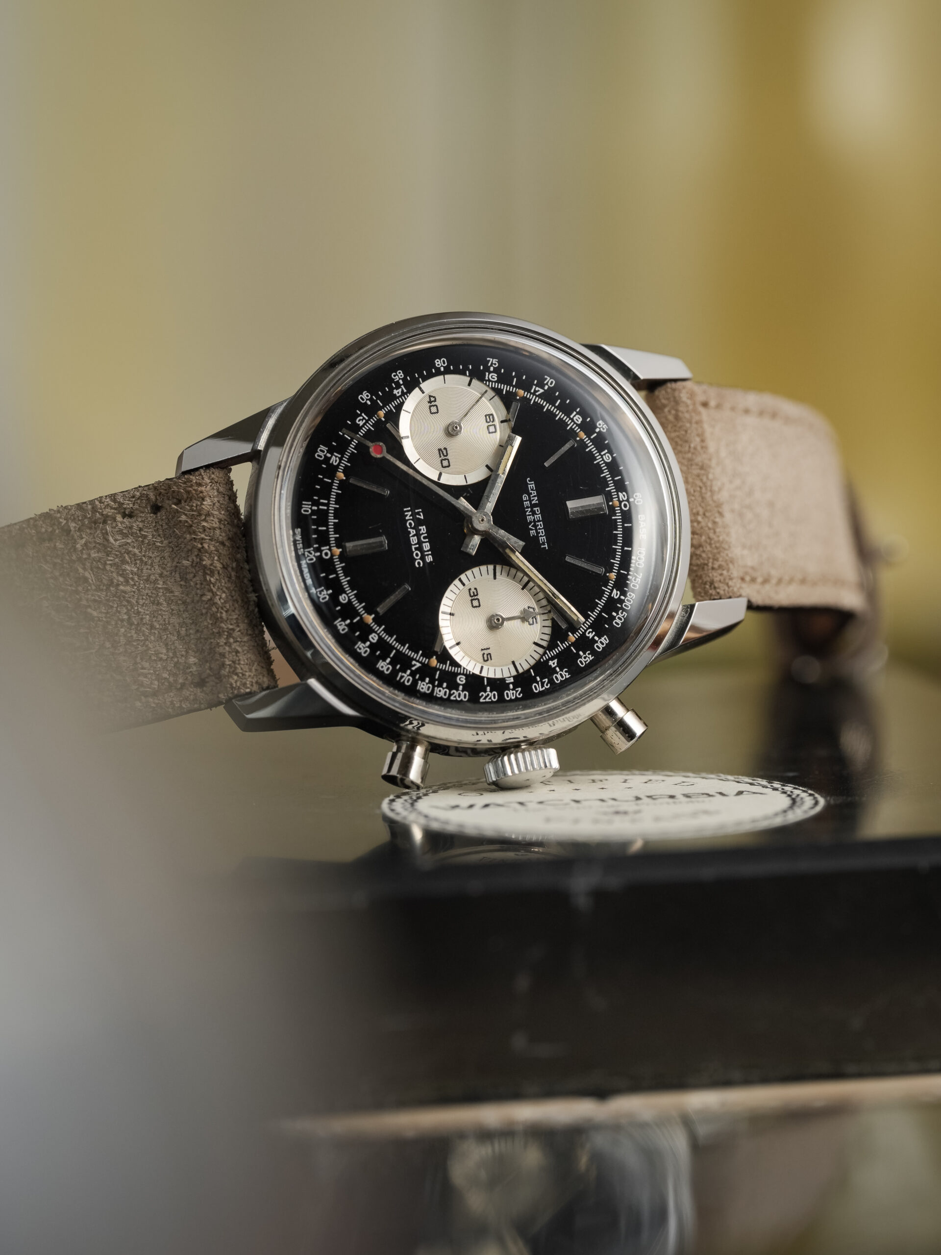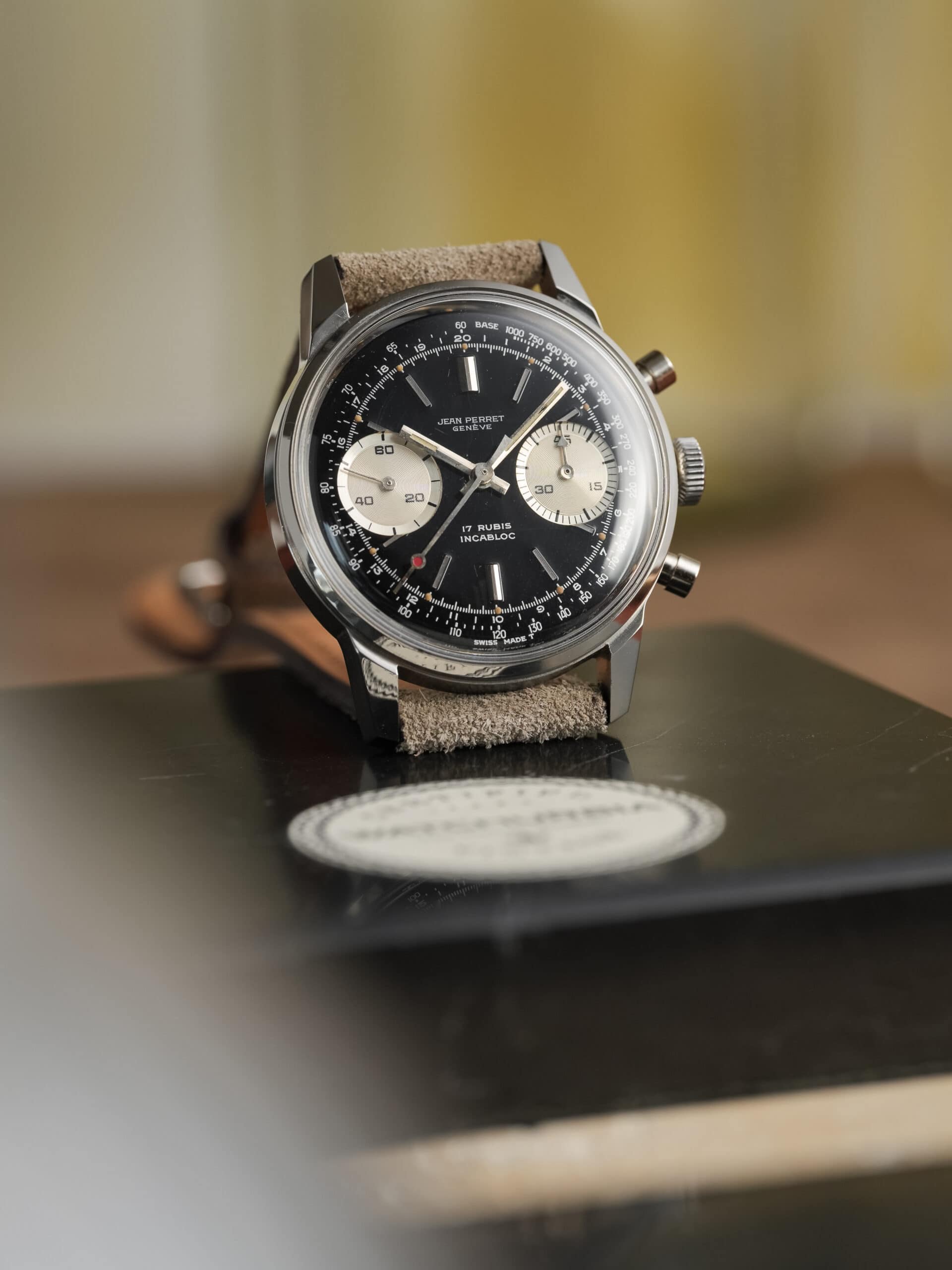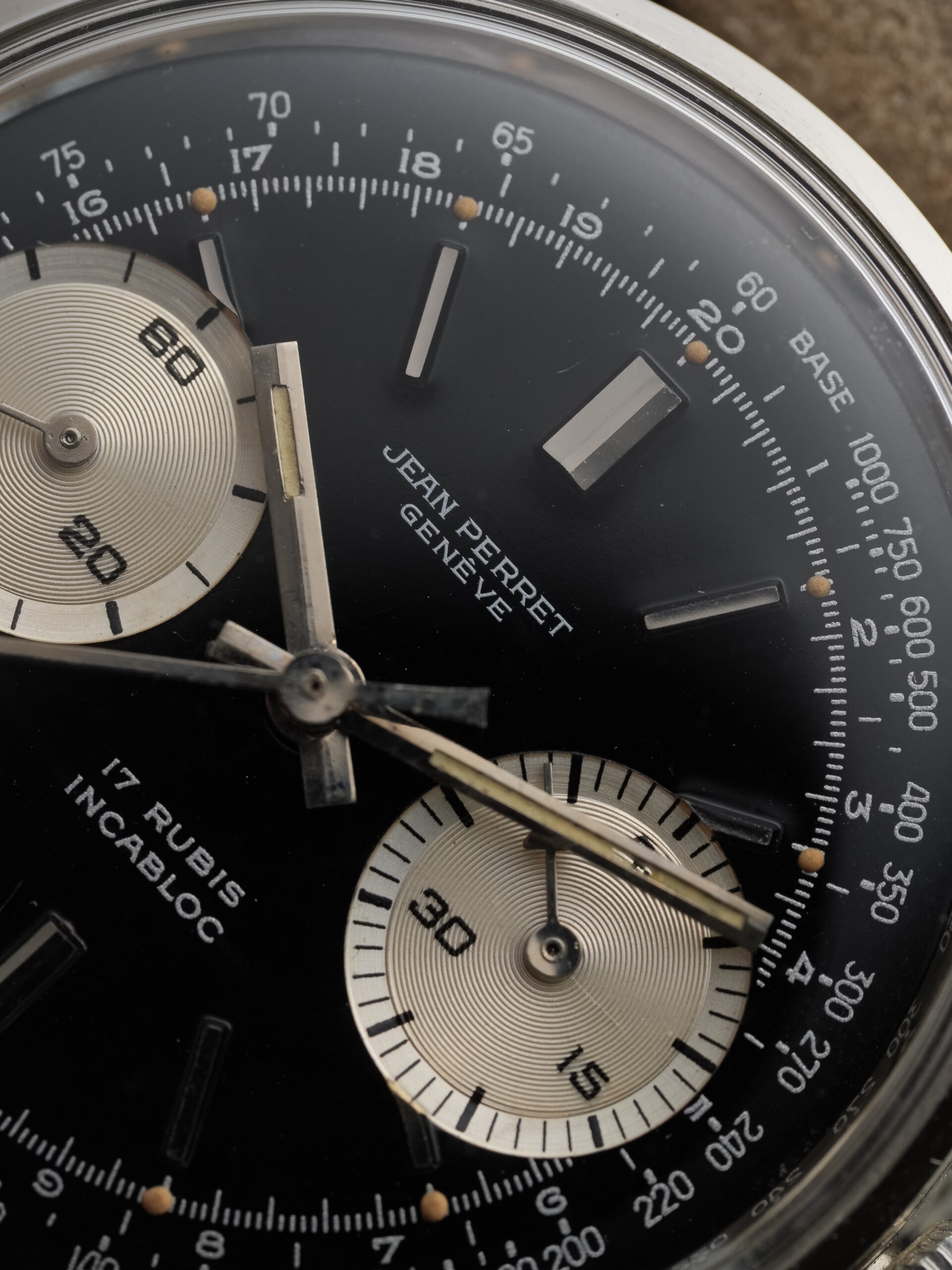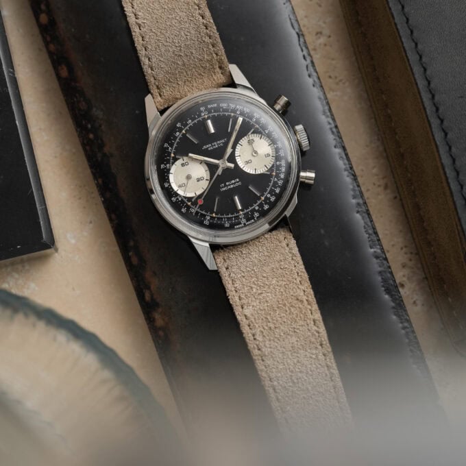 A very attractive vintage chronograph with classic proportions and a striking reverse panda configuration. This Jean-Perret is powered by the reliable Valjoux 7730 and housed in a beautiful and well-proportioned 36 mm Borgel-style case with pump pushers.