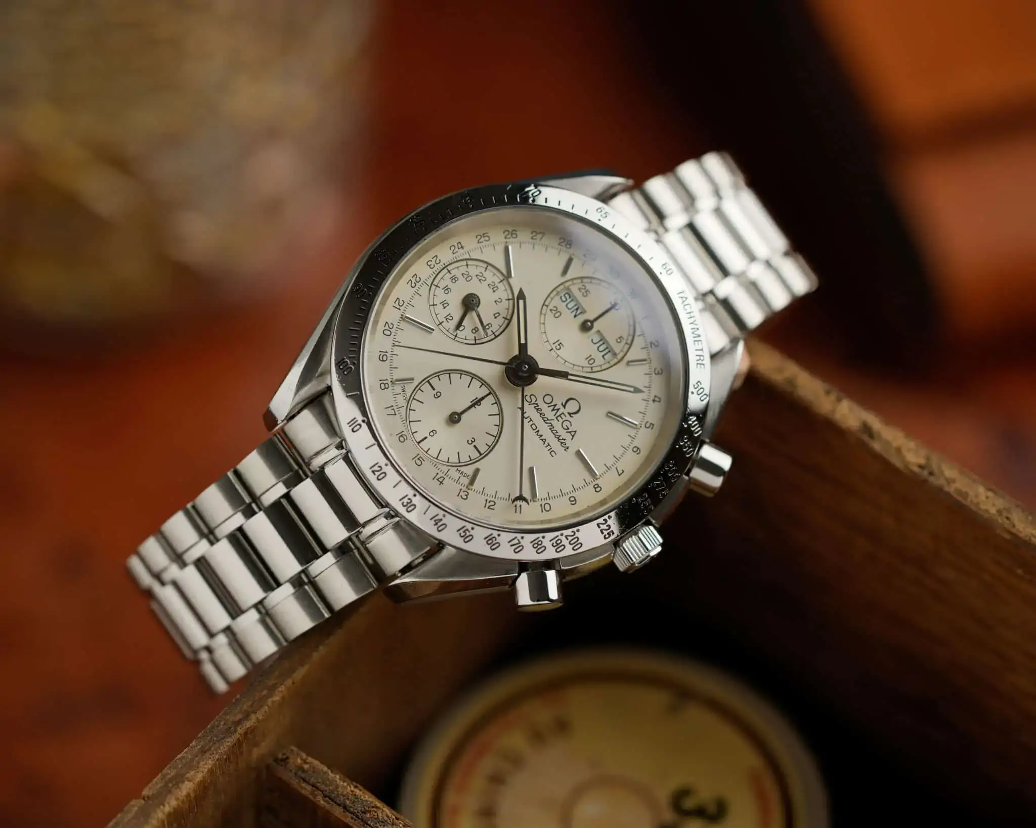 This Speedmaster Triple Date offers a beautiful vintage alternative—especially with such a stunning cream-colored dial. 39 mm without the crown. Ref. 175.0084.