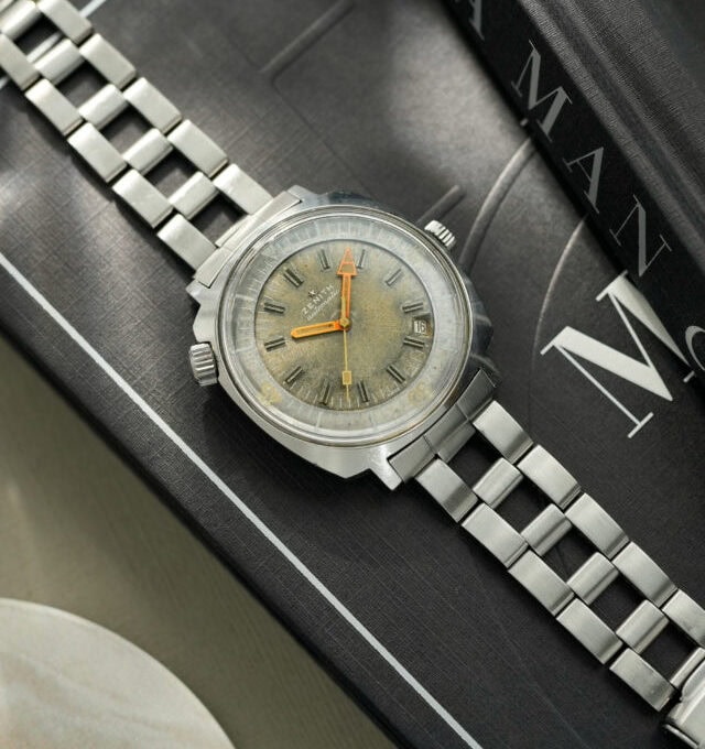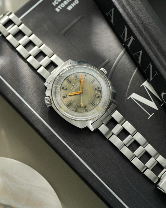 Behold the magnificent ZENITH Super Sub Sea with Ref. A3635, a cherished possession since its acquisition in 1972 by its first and only owner in Germany. This remarkable piece accompanied him on daring diving expeditions during his youthful years. Following a fateful diving accident in 1982, the watch underwent meticulous servicing at Zenith, resulting in a captivating consequence. The crown suffered damage in the incident, bestowing upon it a breathtakingly beautiful patina of the dial that has evolved over the years.